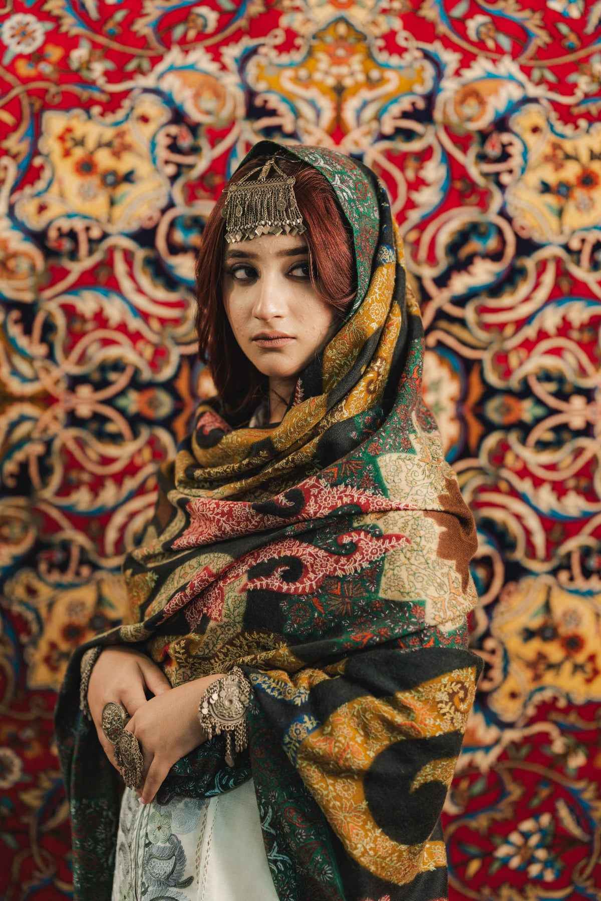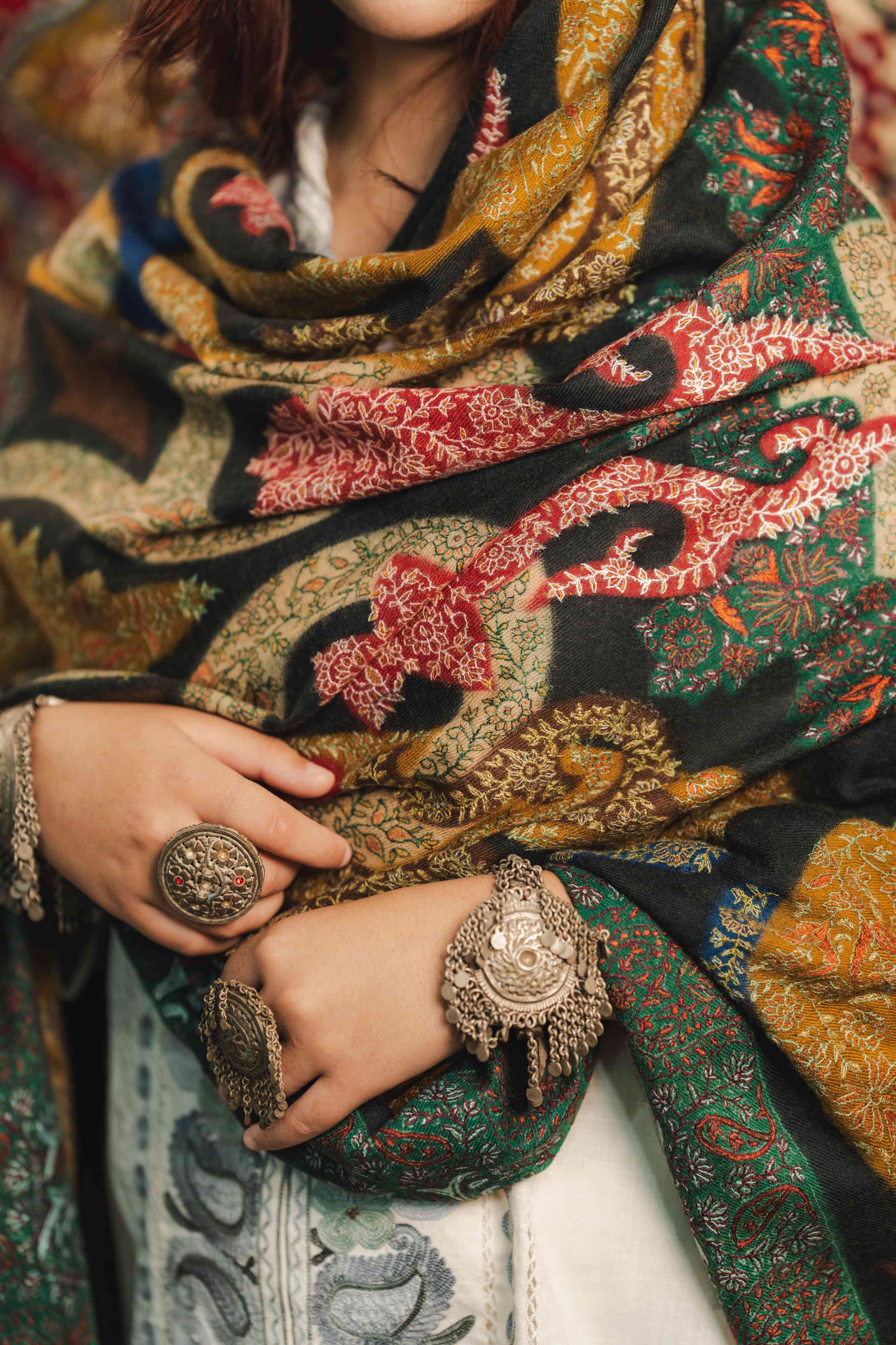 Experience bold elegance with the Kalamkari Sozni Multi Colour Almond Merino Shawl. Crafted from luxuriously soft merino wool and adorned with vivid Kalamkari designs and precise Sozni embroidery, this shawl is made for those who dare to stand out. It fuses tradition with a fearless splash of color and artistry, keeping you warm while commanding attention. Elevate your style with this striking statement piece that’s both comfortable and unapologetically unique.