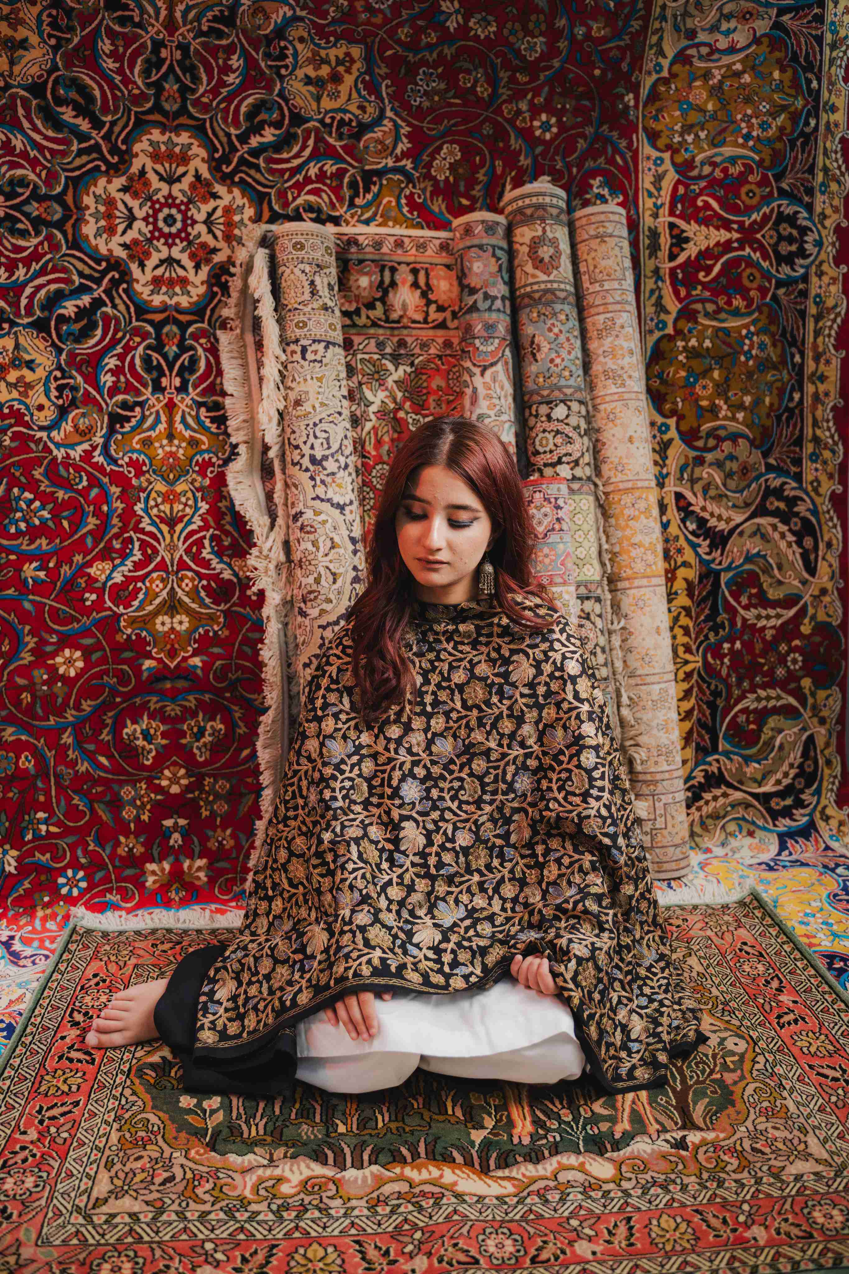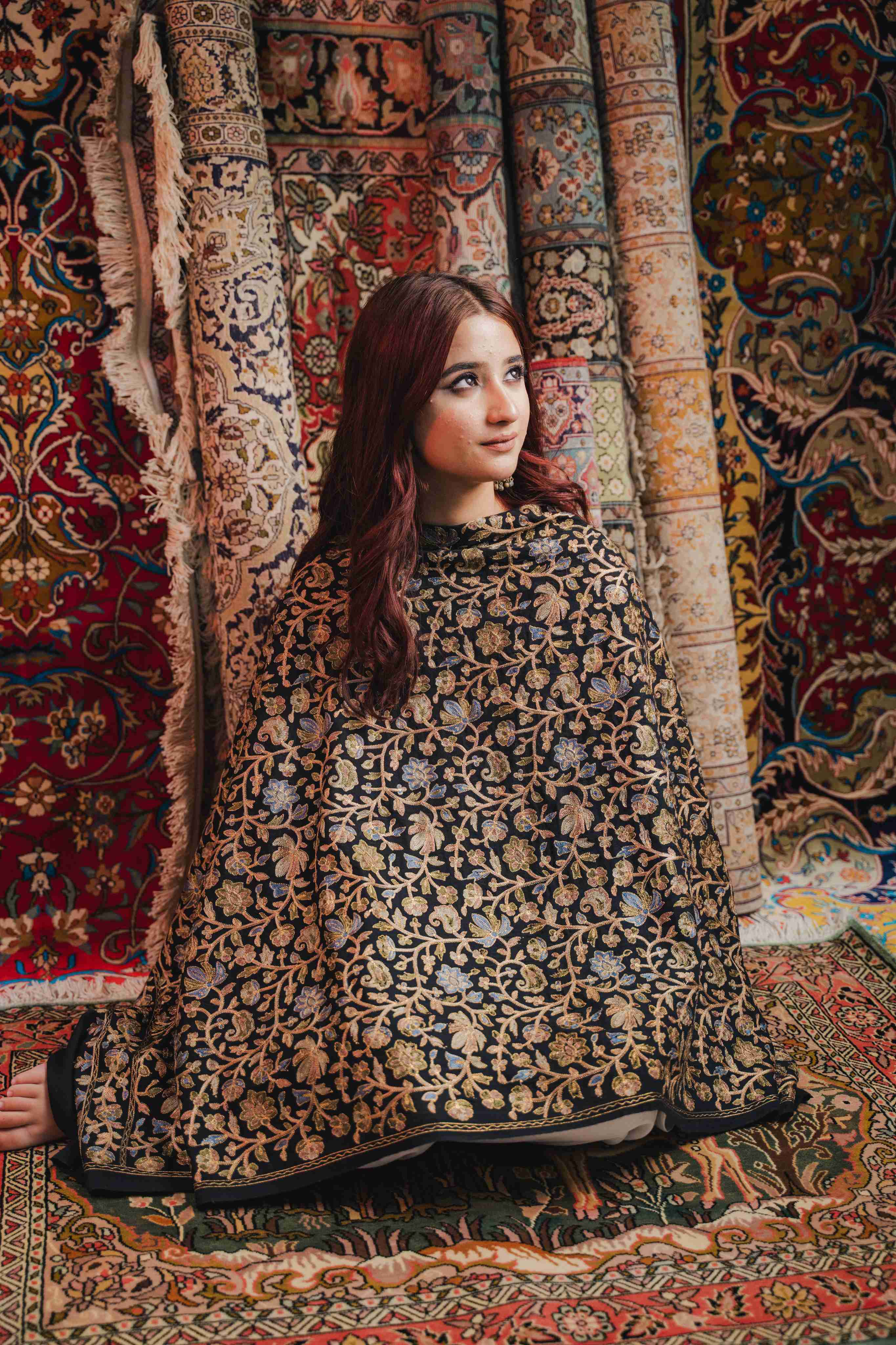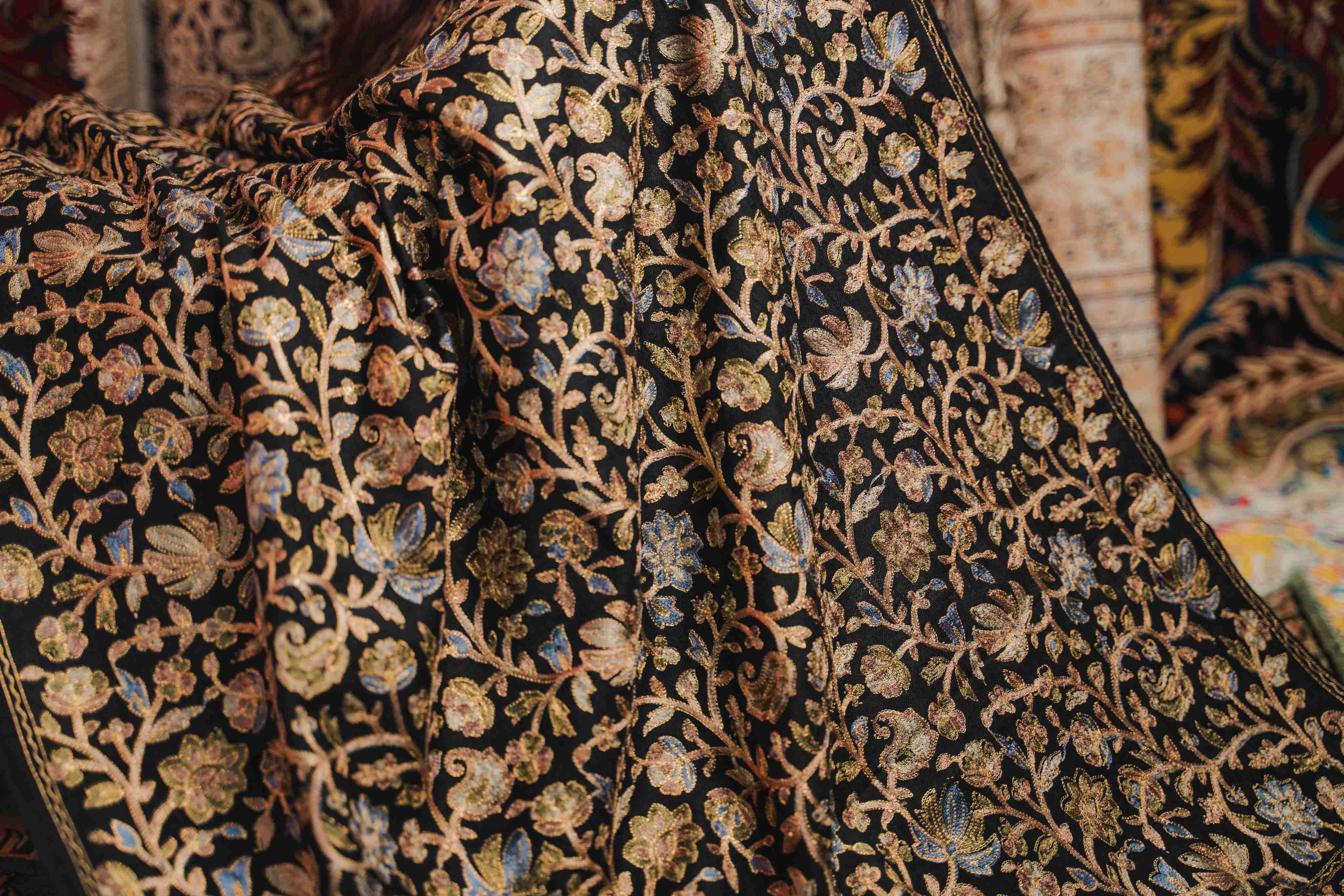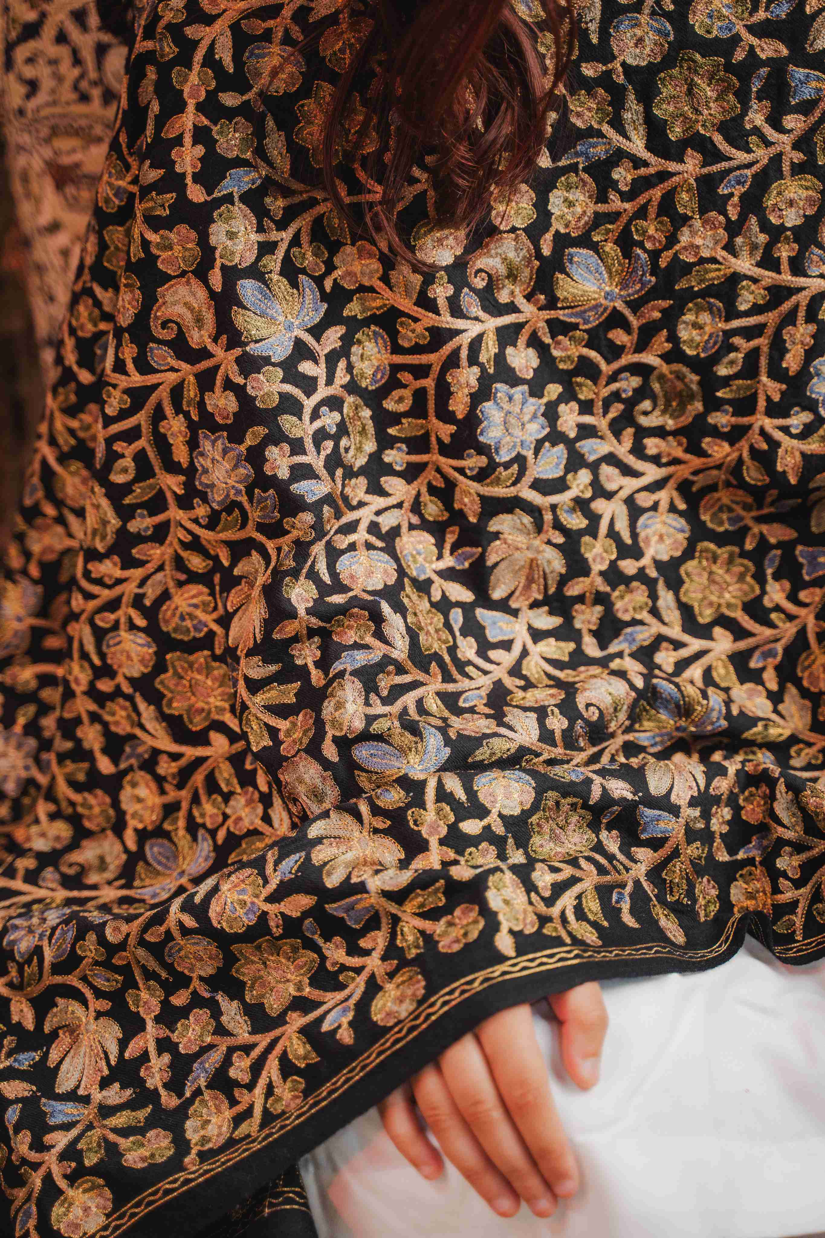 Kashmiri Aari Work Shawl - Black | Zari Outline