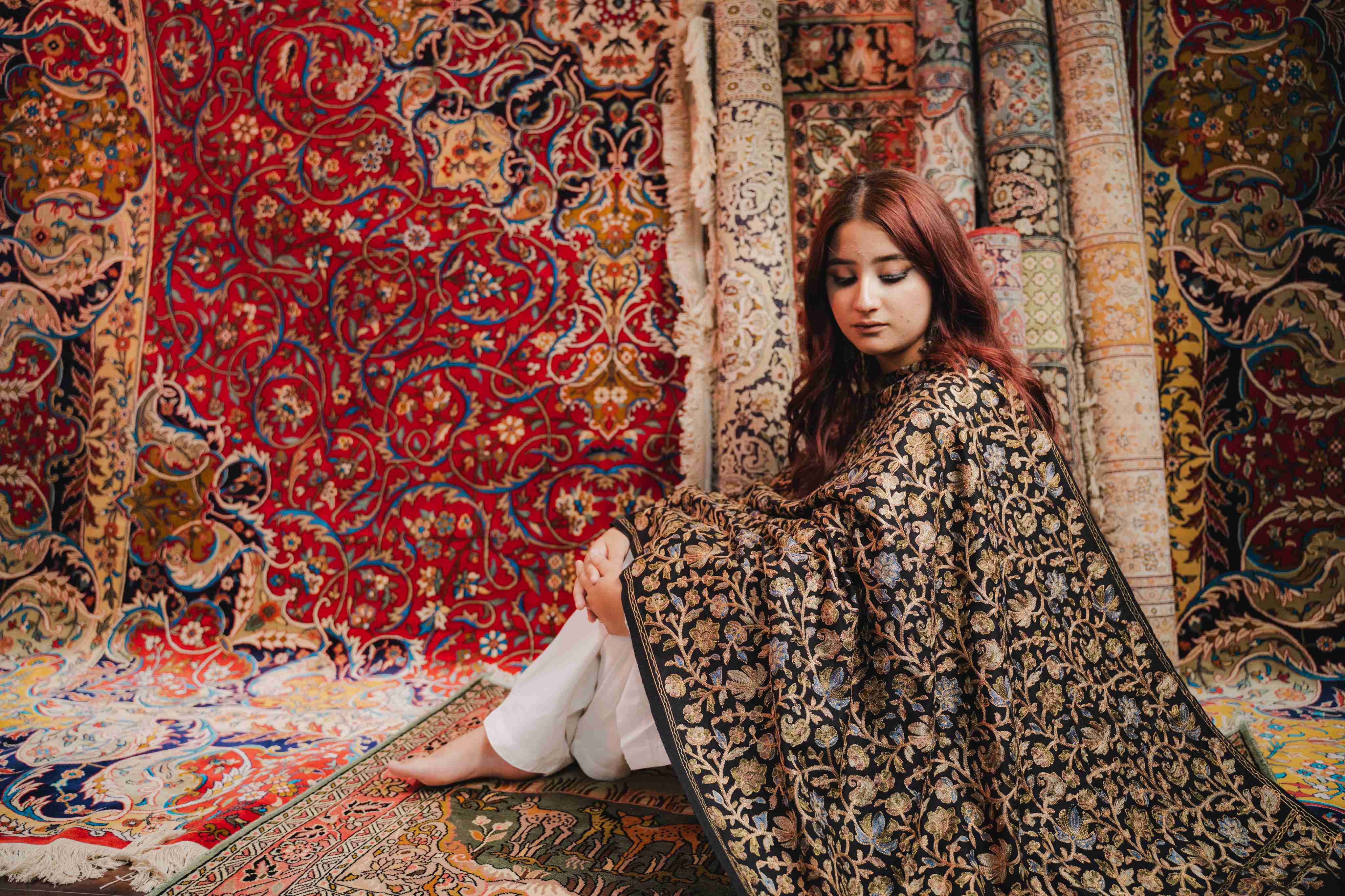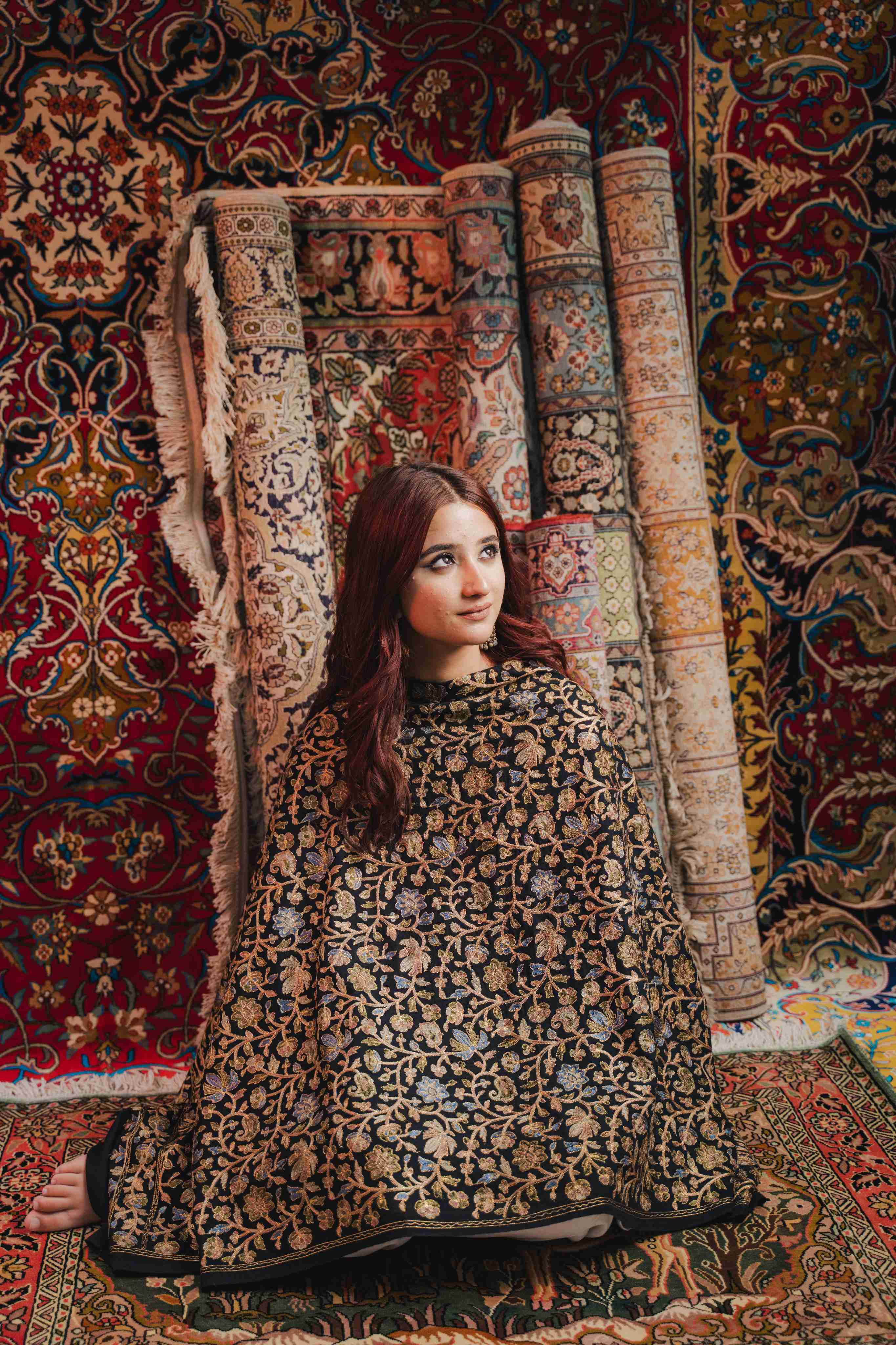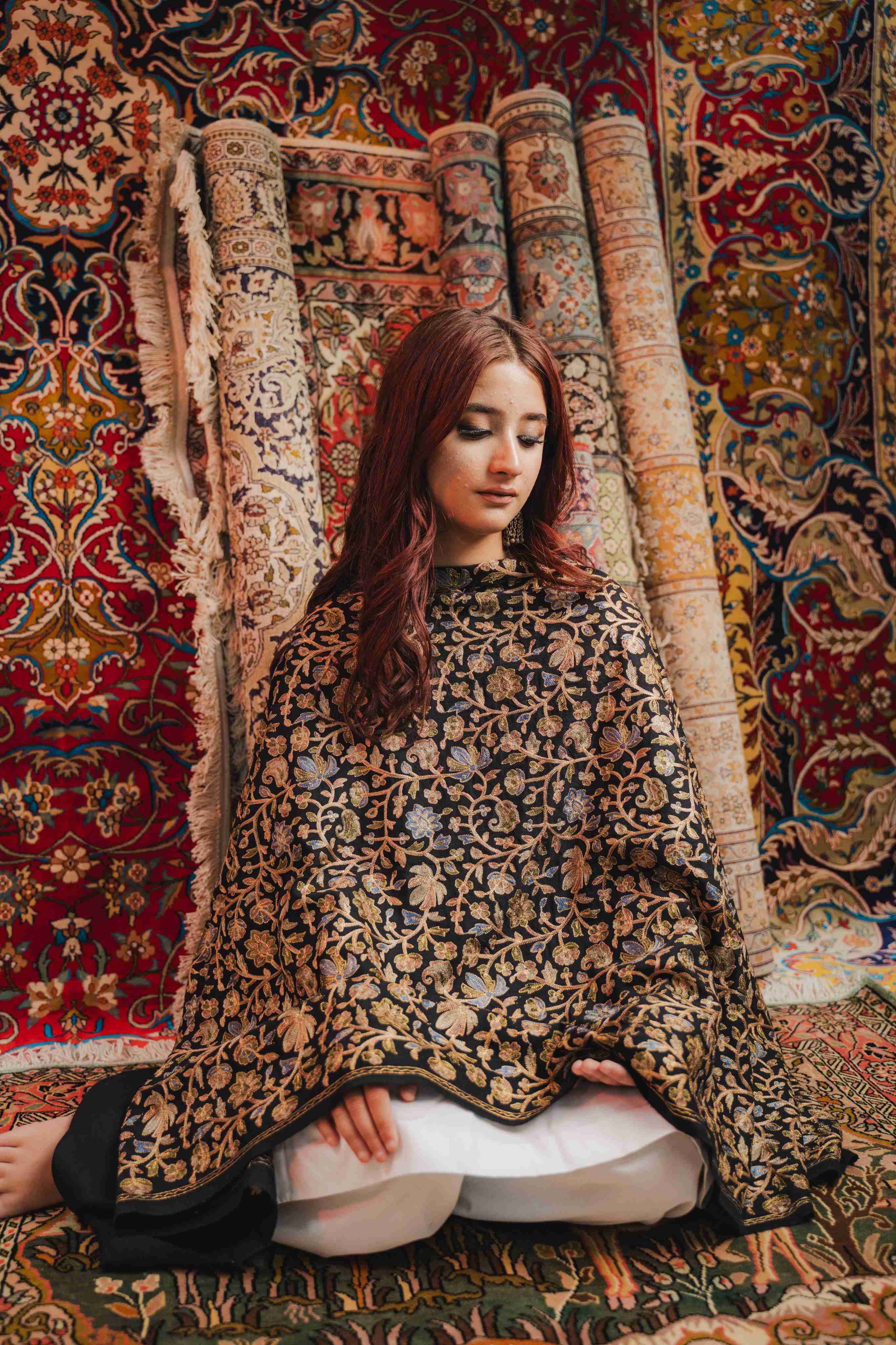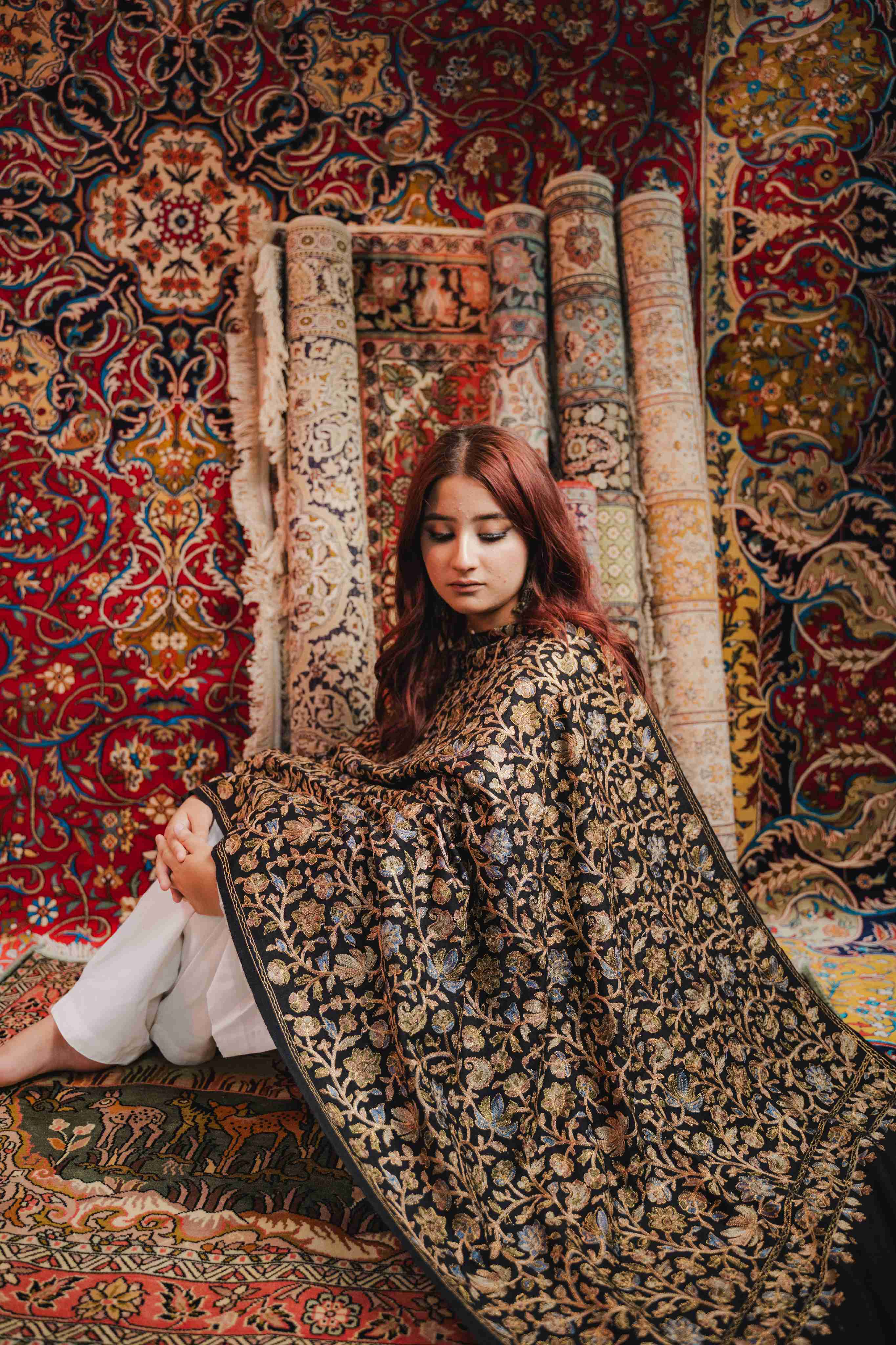 Kashmiri Aari Work Shawl - Black | Zari Outline