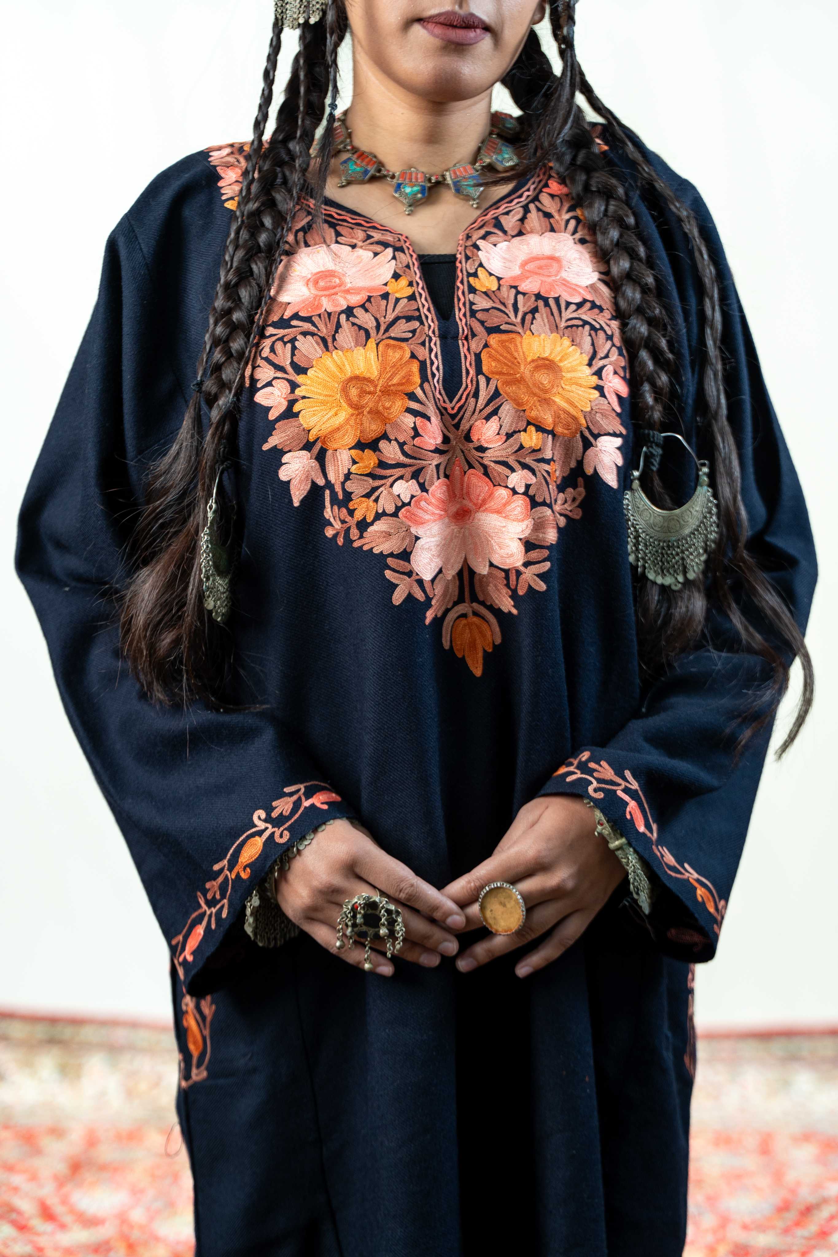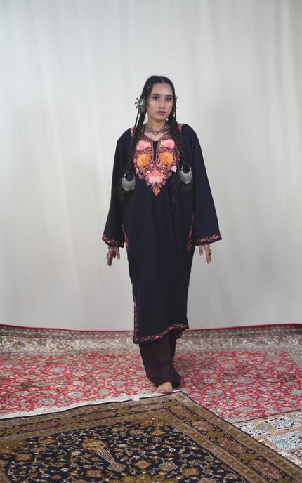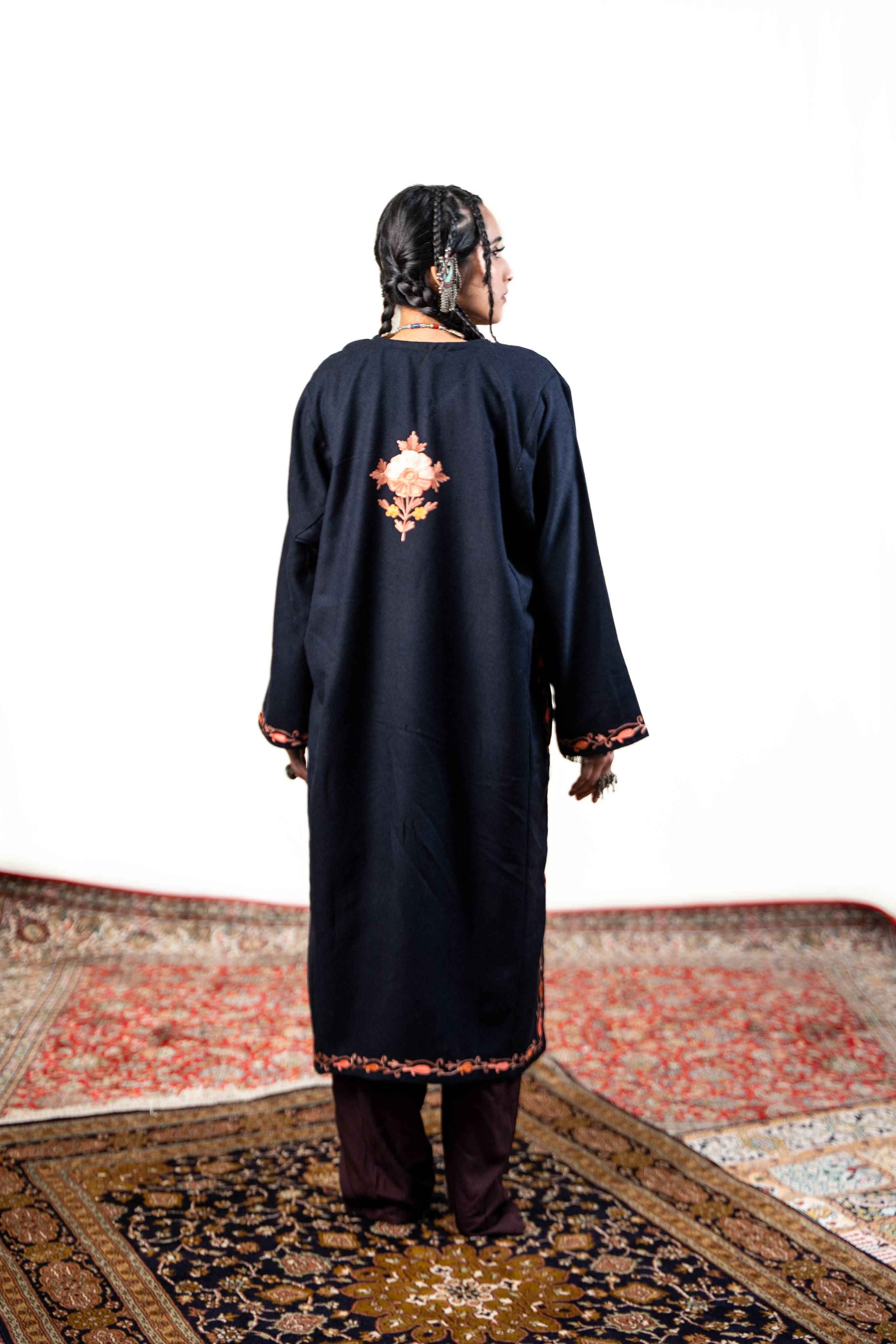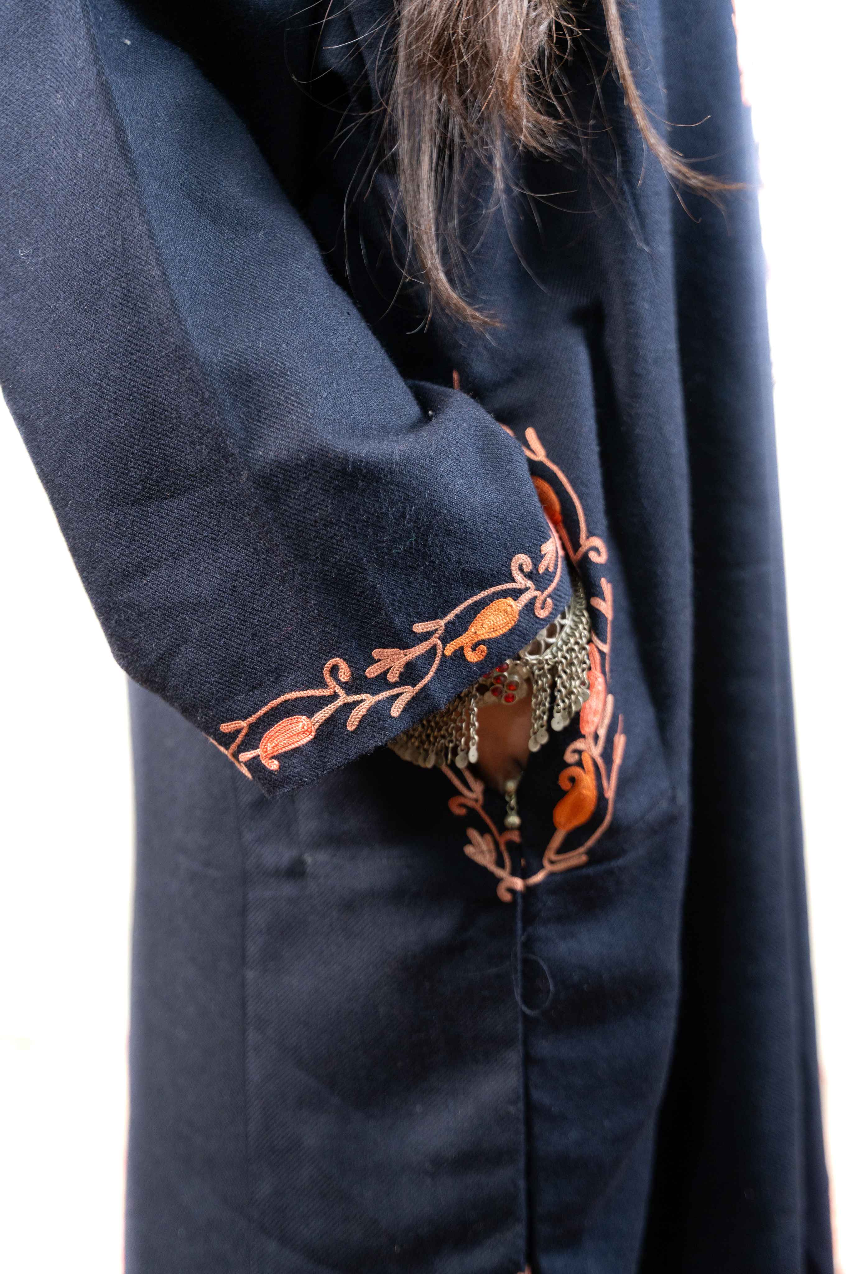 Embrace the timeless elegance of Kashmir with this stunning black pheran, adorned with intricate aari embroidery across the neckline, border, back, sleeves, and pockets. Crafted from premium wool, this piece offers the perfect balance of warmth and lightness, making it ideal for layering through cooler seasons. Practical side pockets provide convenient storage, while the detailed aariwork showcases authentic artisanal craftsmanship. A versatile wardrobe essential that celebrates traditional Kashmiri artistry with everyday wearability.
