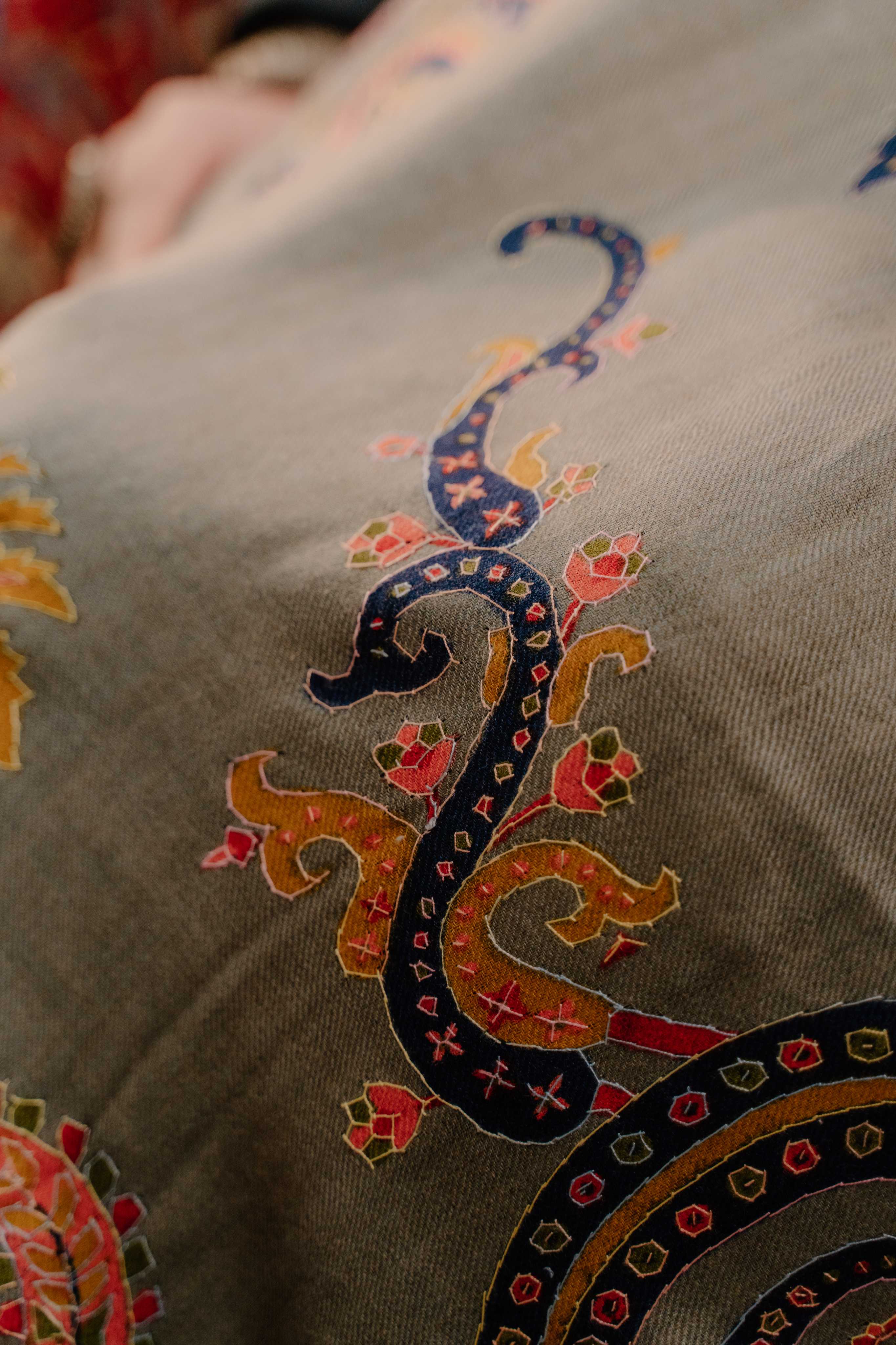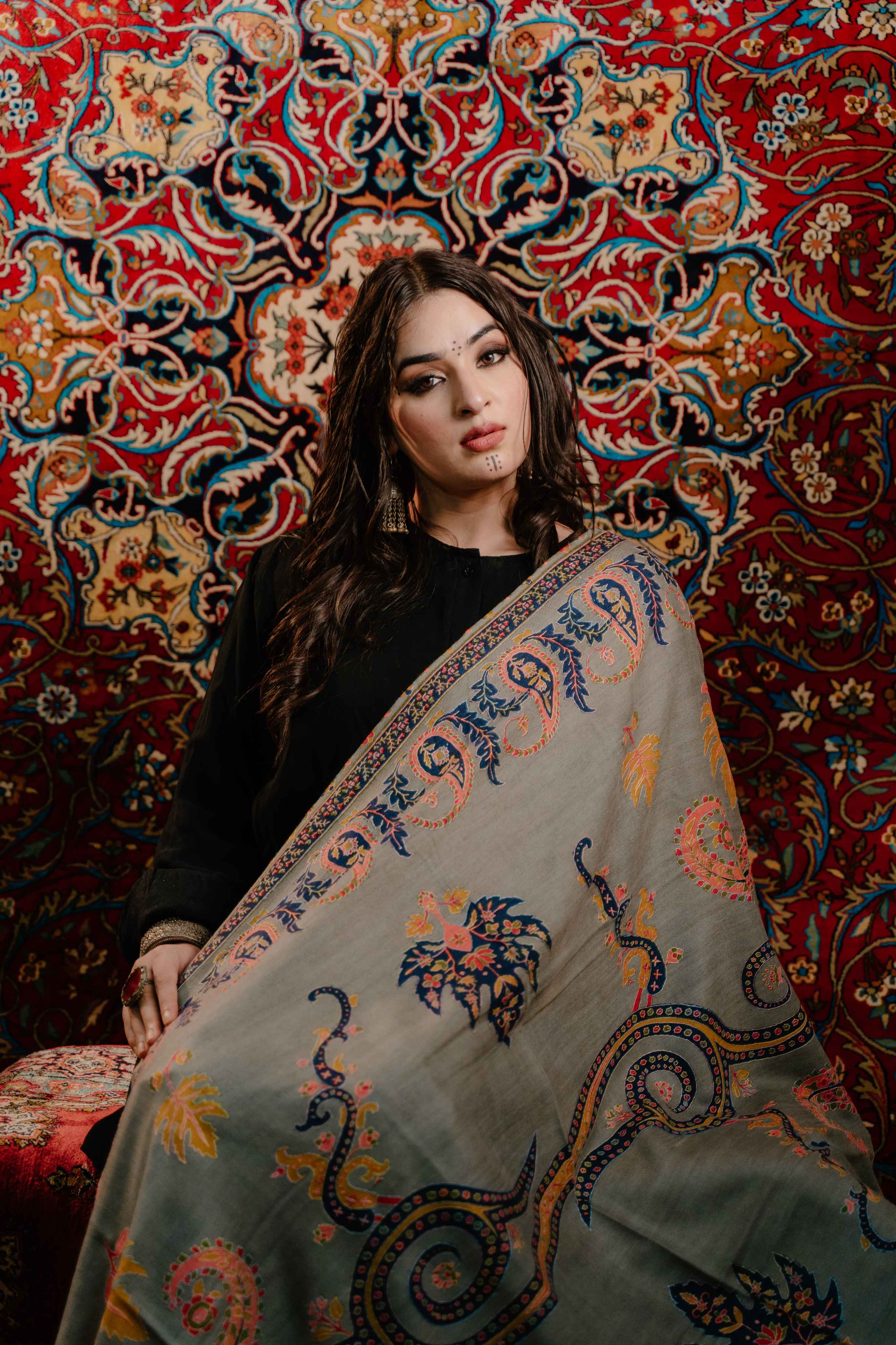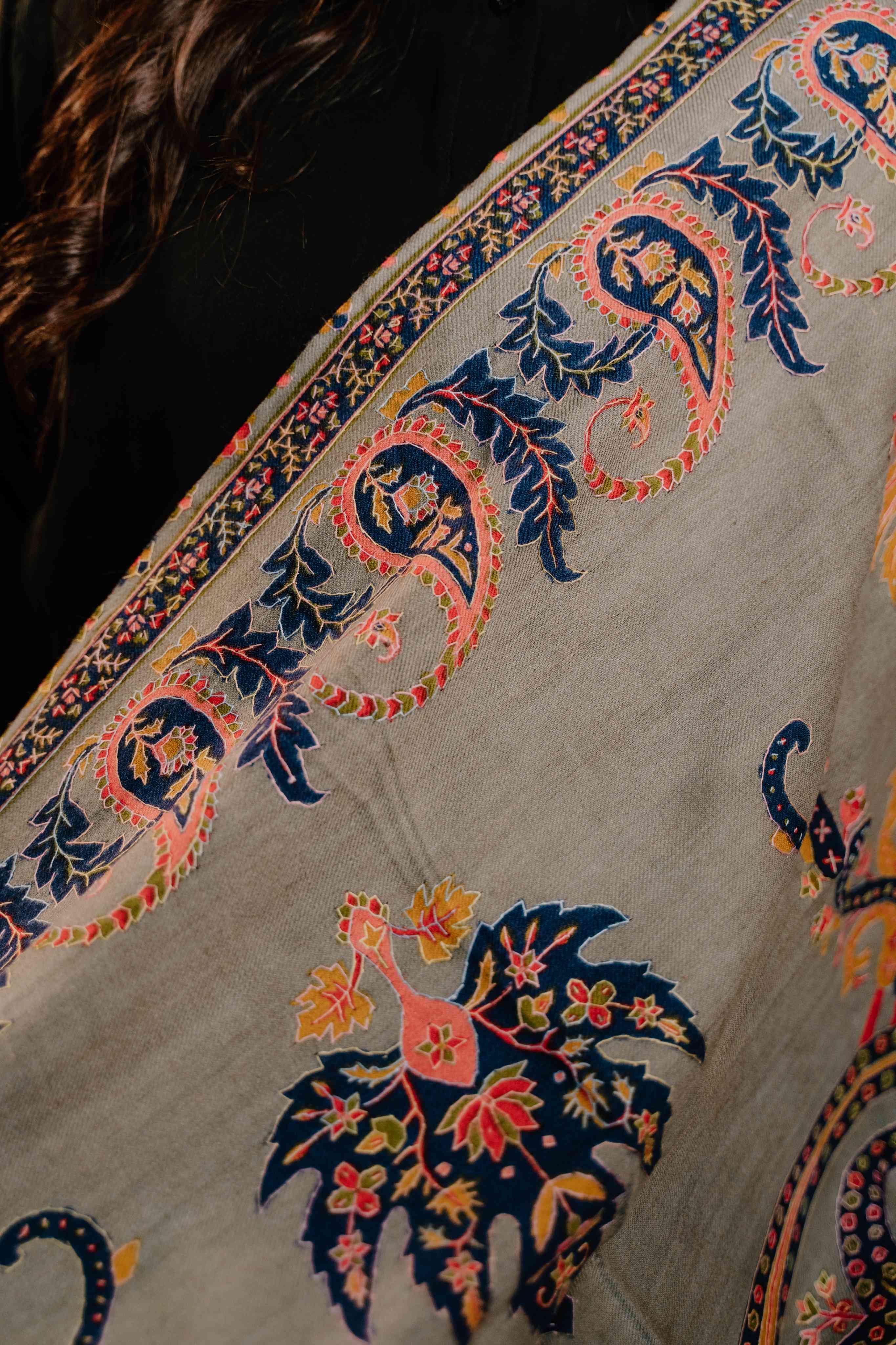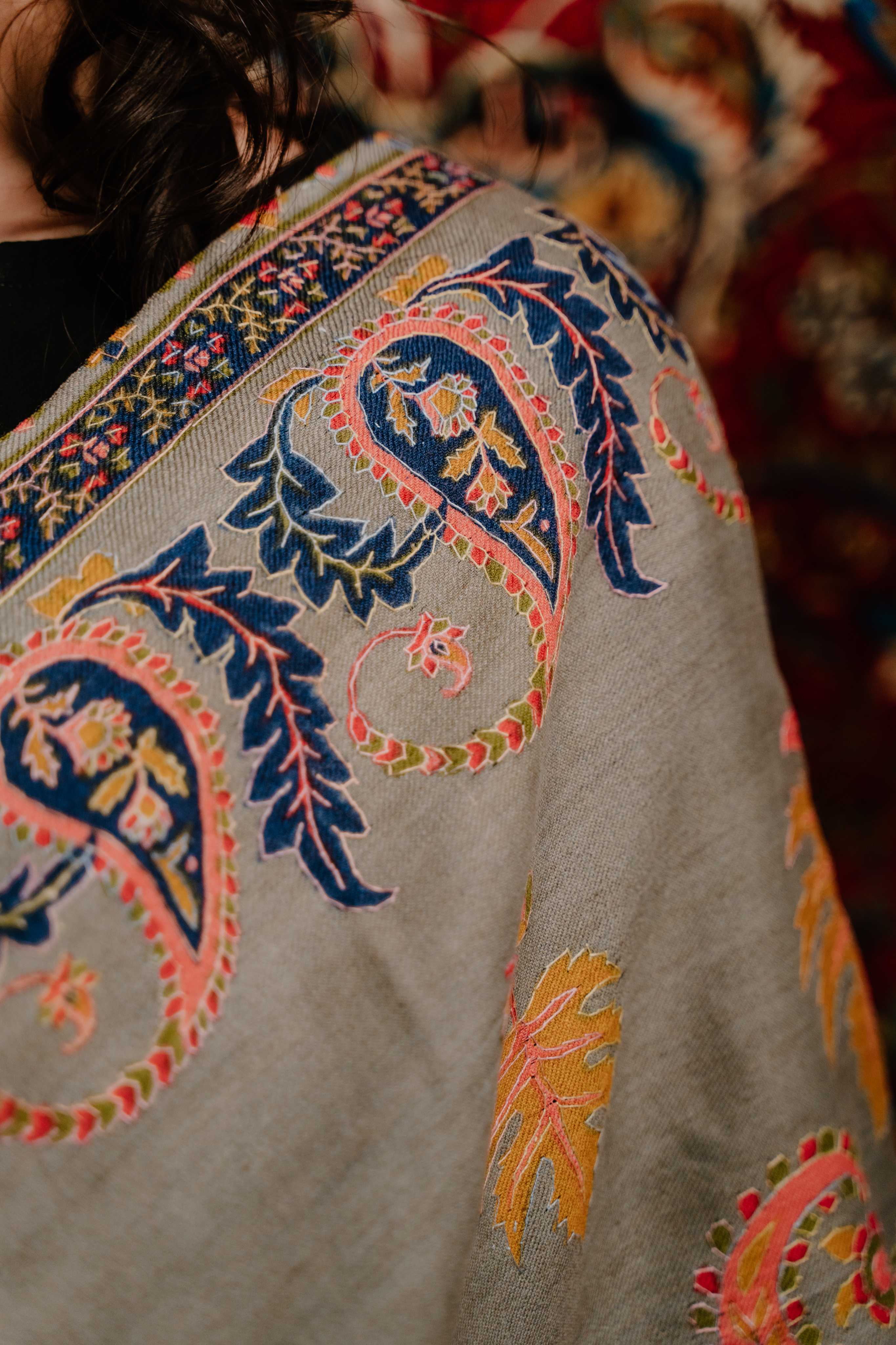 Kashmiri Kalamkari Sozni Shawl - Natural Grey | Paisley