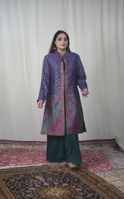 Kashmiri Kani With Zari Embroidery Jacket - Blue Zari | Silk Long