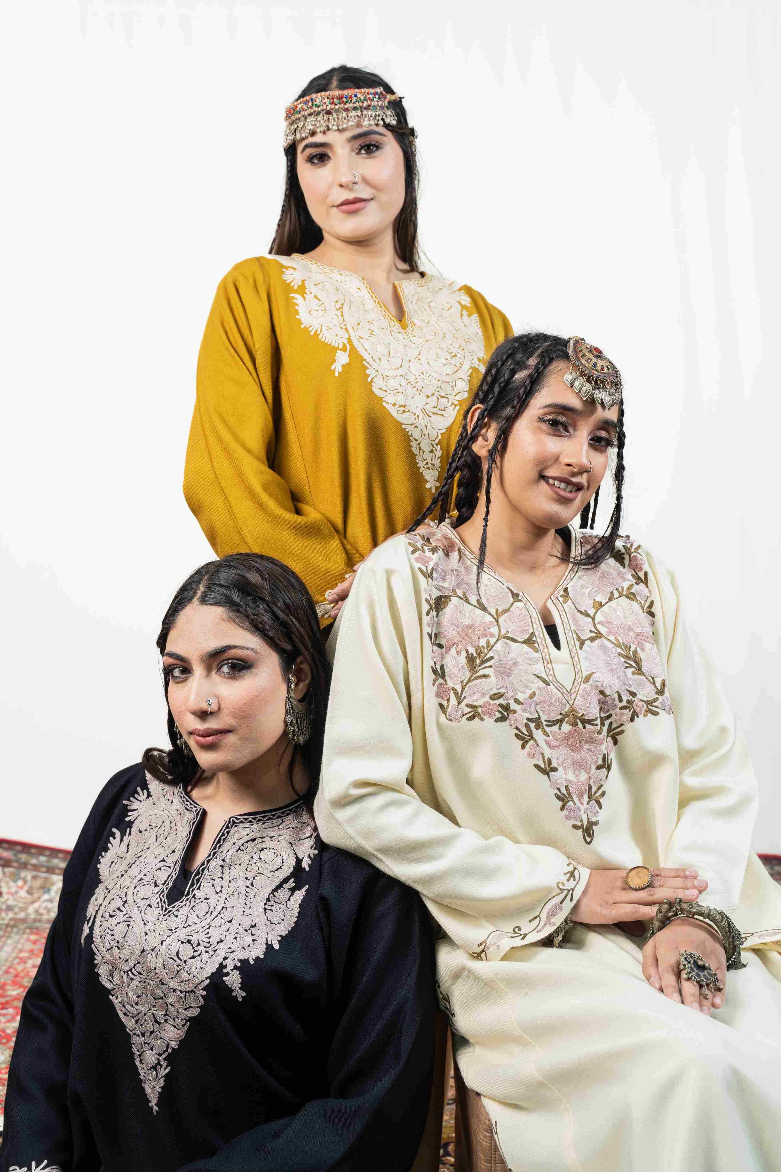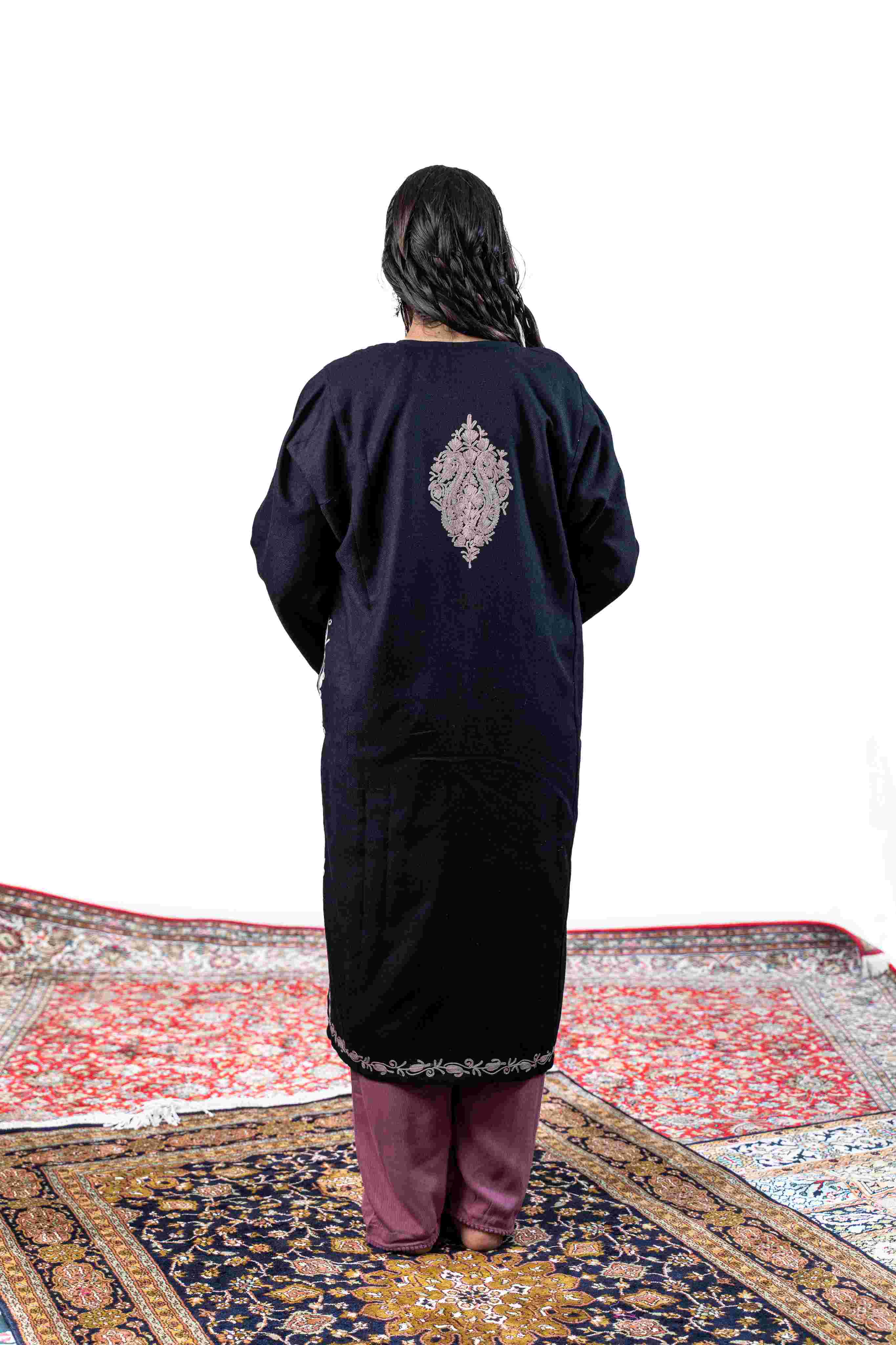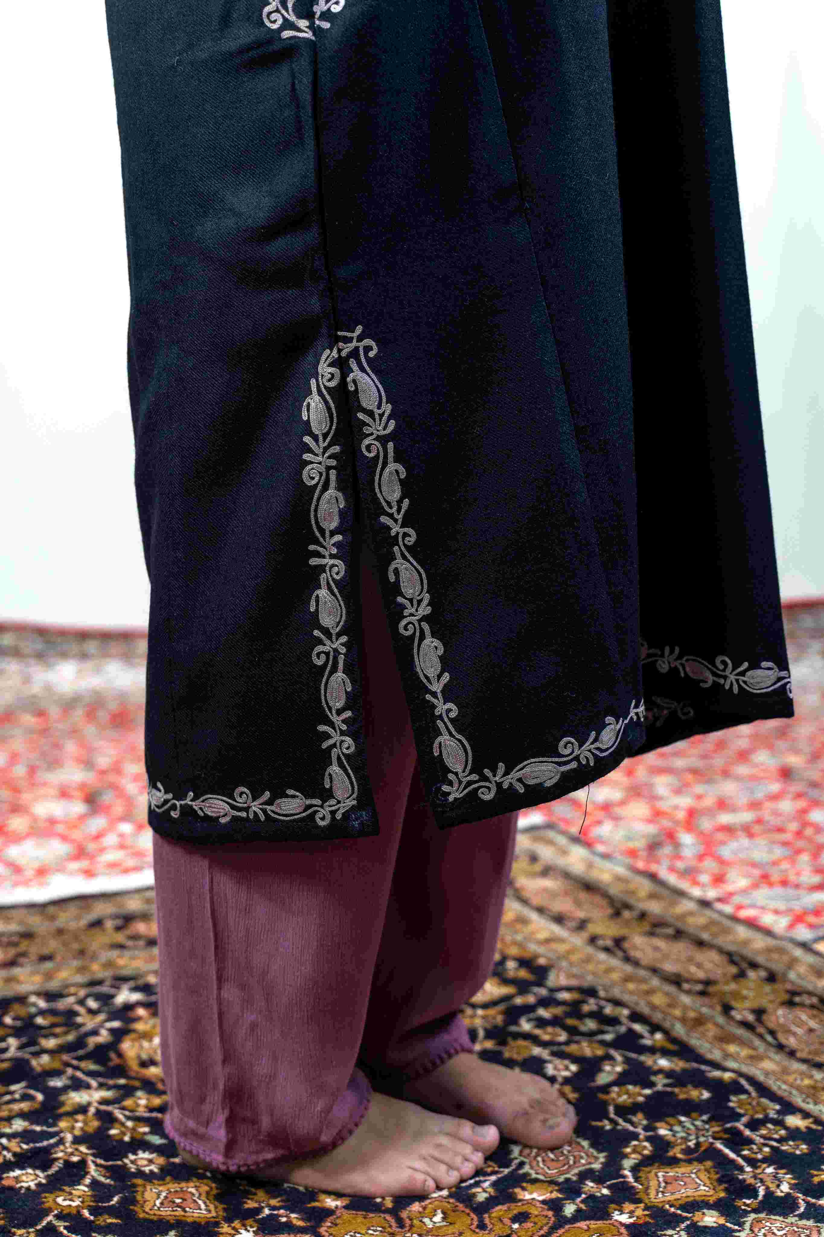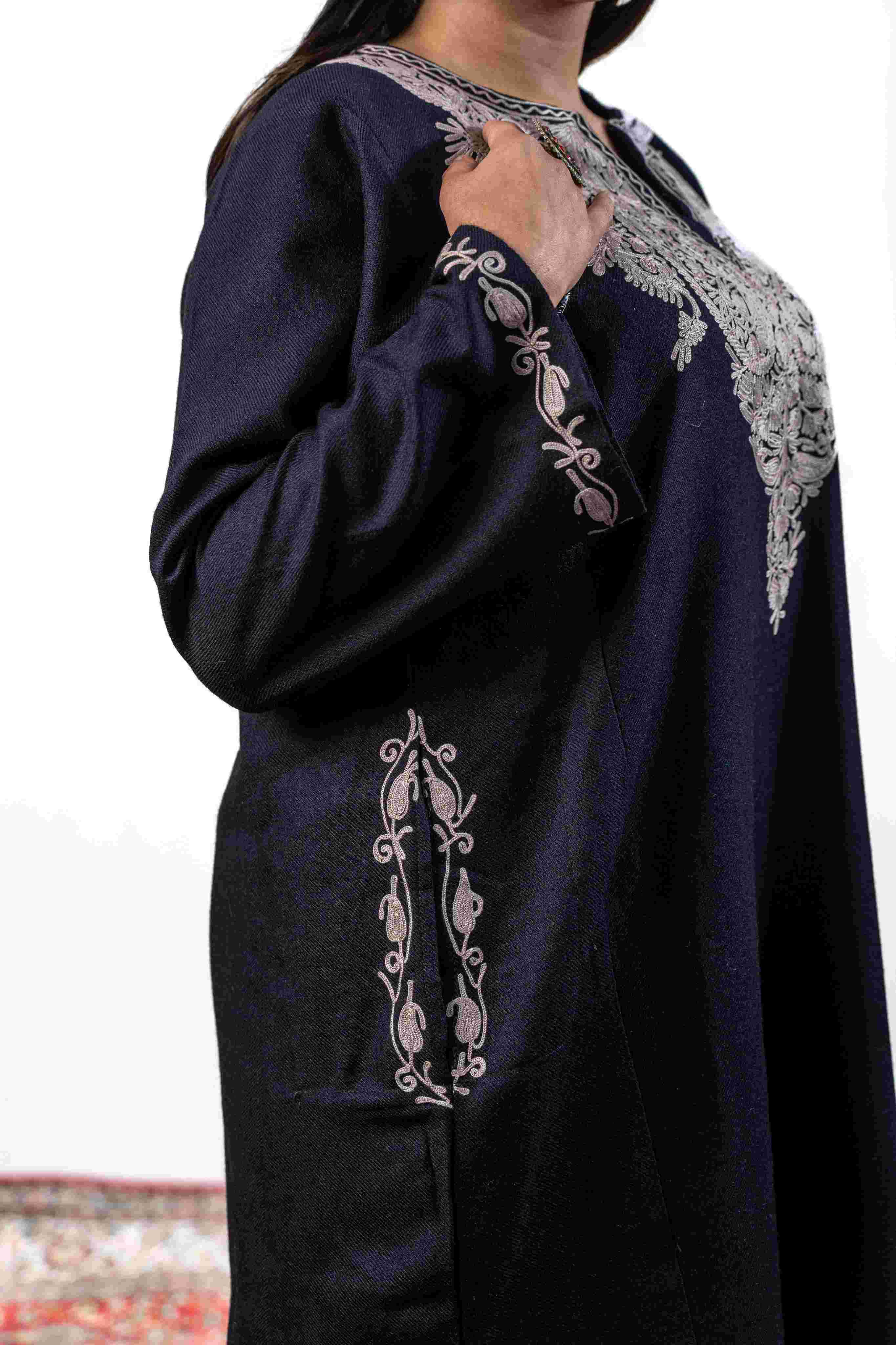 Experience the perfect fusion of tradition and comfort with this exquisite black pheran. Vibrant pastel aari embroidery graces the neckline, pockets, and back panel, while intricate buti patterns dance across the sleeves—each stitch a testament to Kashmiri artistry. Lightweight yet wonderfully warm, this versatile piece moves with you throughout the day. Functional pockets ensure practicality meets beauty, making it an essential addition to any wardrobe seeking authentic craftsmanship and timeless appeal.