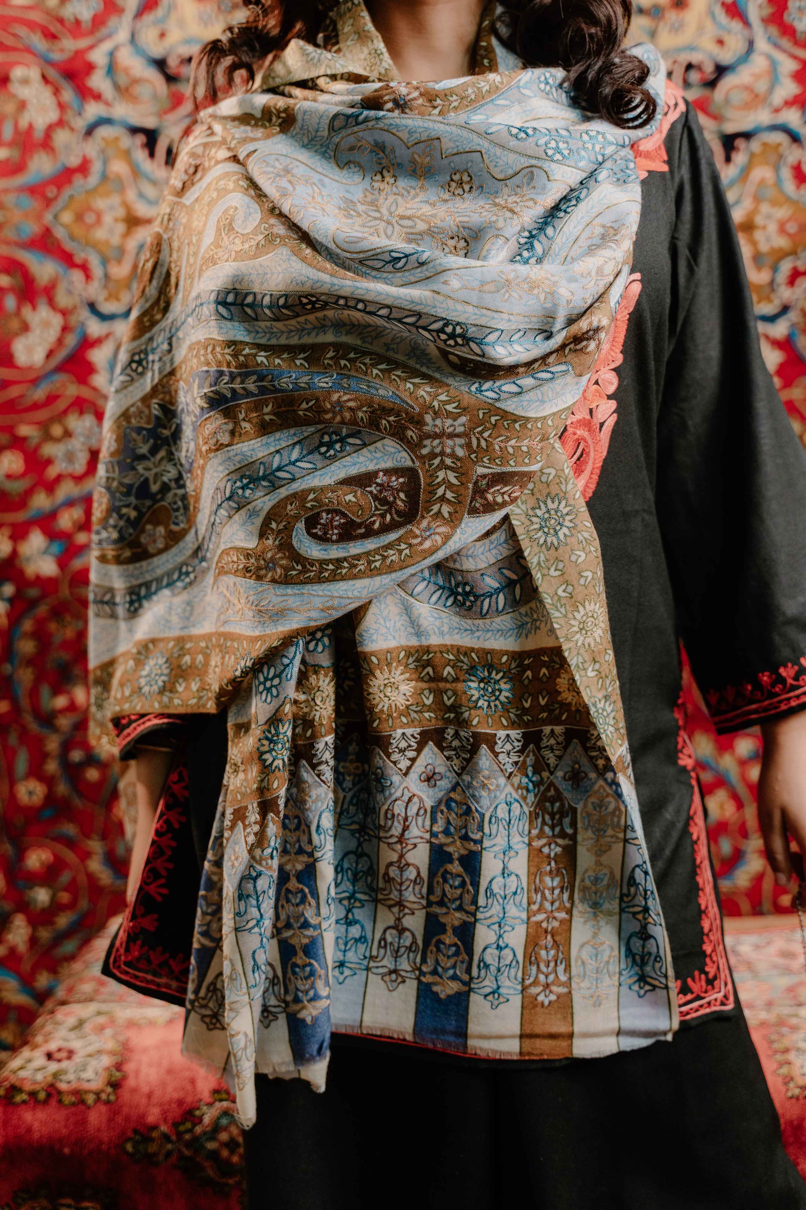 Kashmiri Kalamkari Sozni Work Stole - Grey Brown | Classical