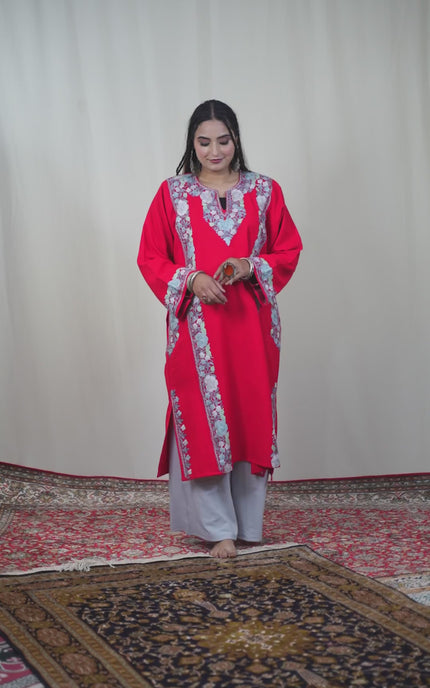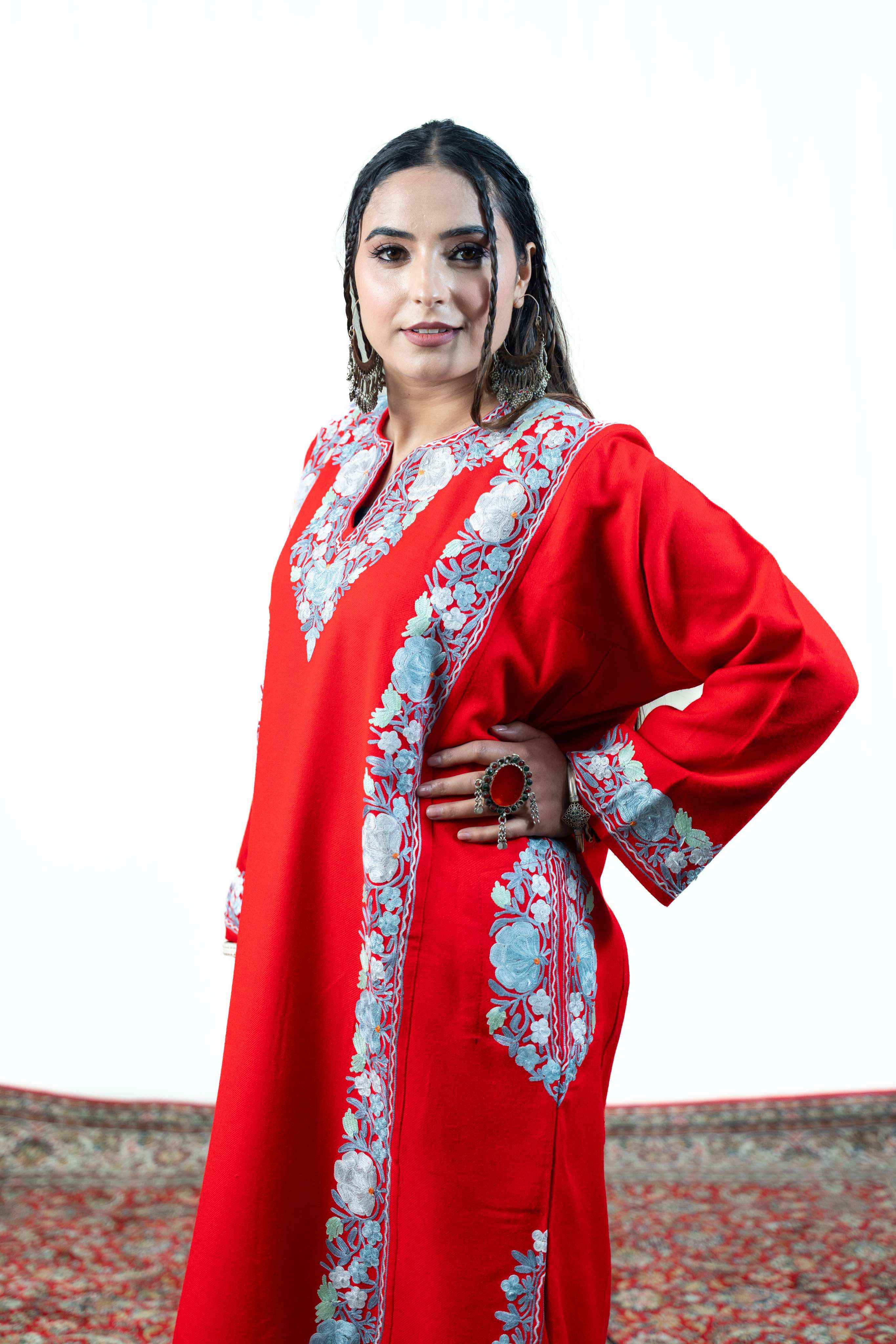 Embrace bold elegance with this striking red Pheran, where traditional Aari embroidery commands attention across the neckline, back border, sleeves, and pockets. Meticulously crafted with intricate threadwork that catches the light, this piece balances audacious style with everyday practicality—functional pockets keep essentials within reach. Despite its sumptuous appearance, the lightweight construction delivers surprising warmth, making it perfect for layering through transitional seasons. A fearless statement piece that honors Kashmir's artisanal heritage while refusing to compromise on comfort or wearability.