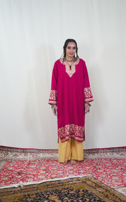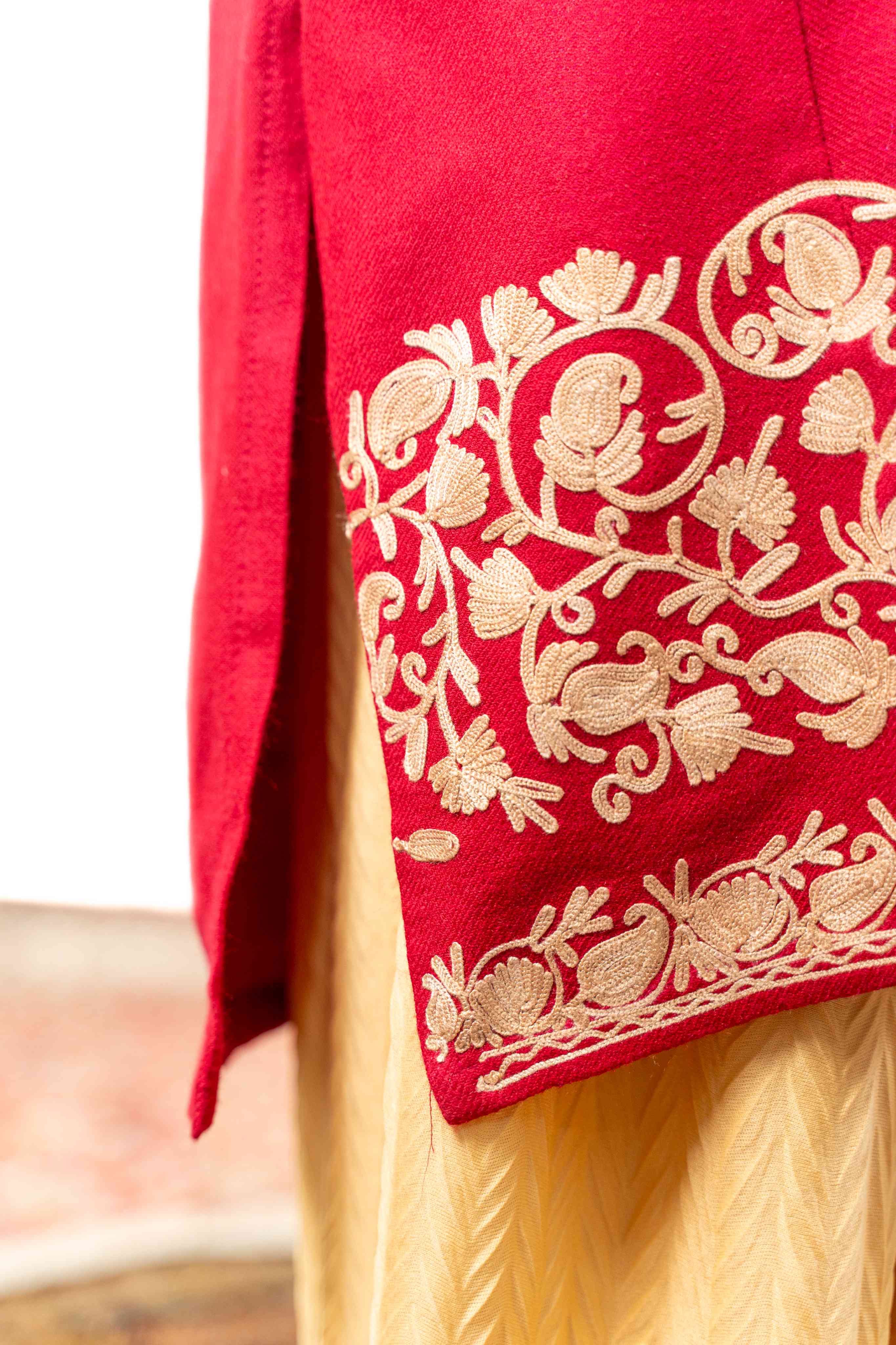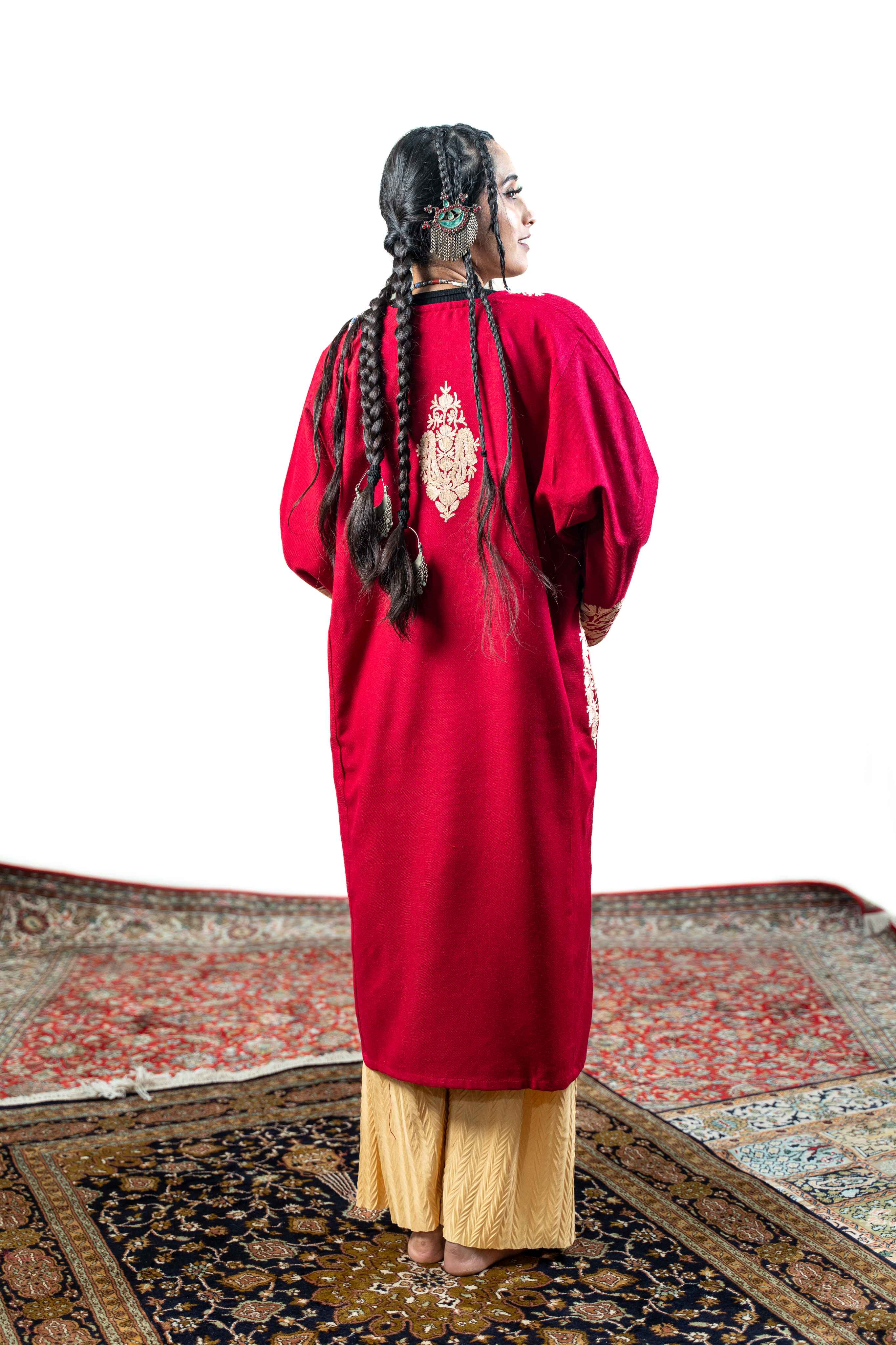 This stunning Brilliant Red Aari Work Pheran represents the pinnacle of Kashmiri textile artistry. Meticulously embroidered with traditional aari work across the neckline, sleeves, borders, back, and pockets, each piece showcases the refined technique passed down through generations of master craftspeople. The luminous red fabric provides an elegant backdrop for the intricate threadwork, while the lightweight construction offers comfort and versatility for layering across seasons. A distinguished addition to any wardrobe that honors authentic craftsmanship and cultural heritage.