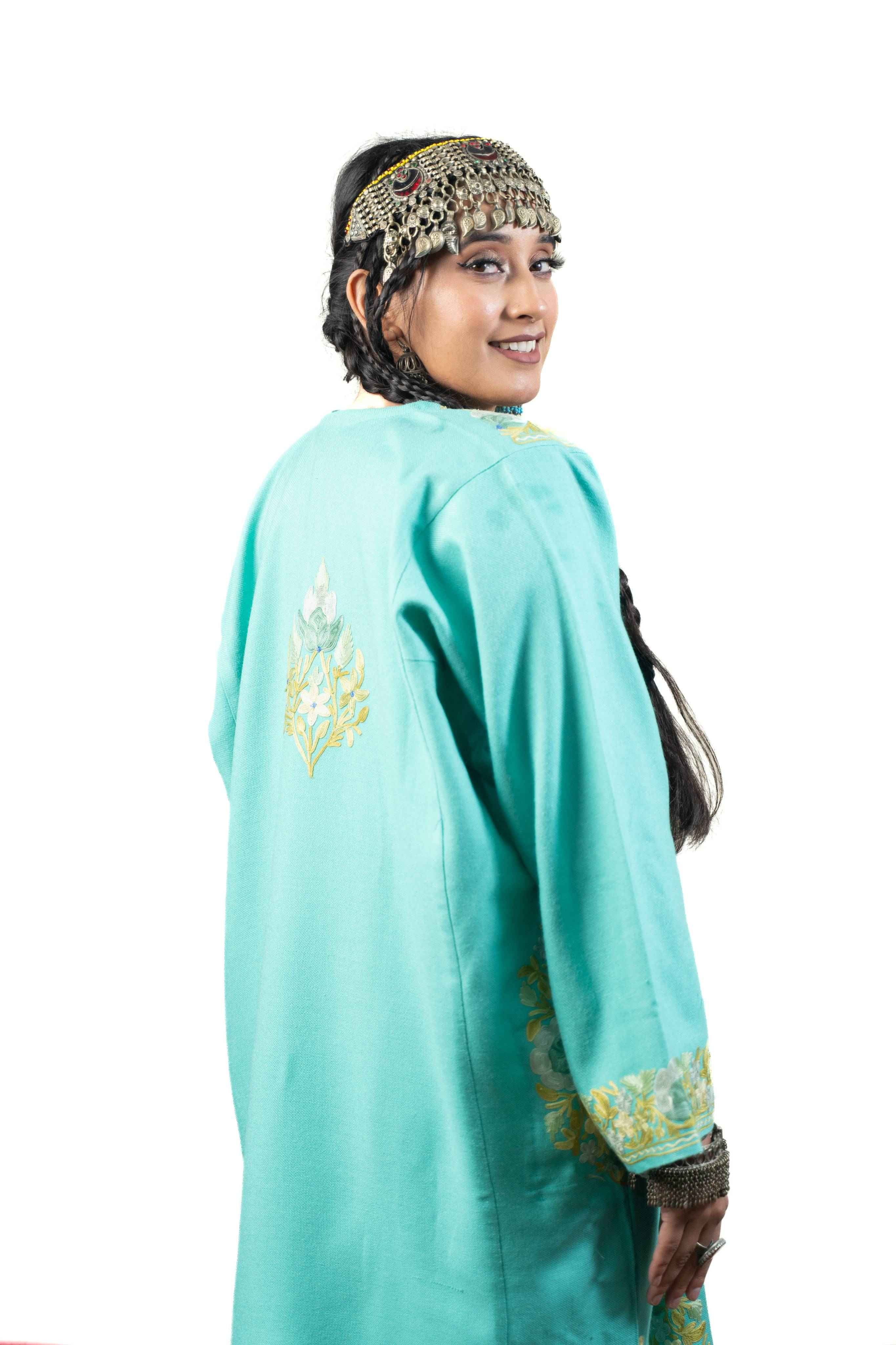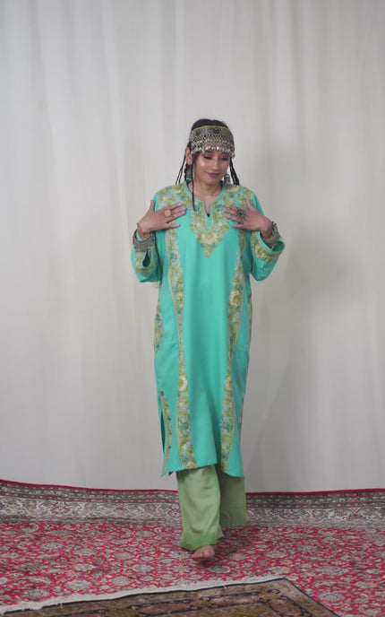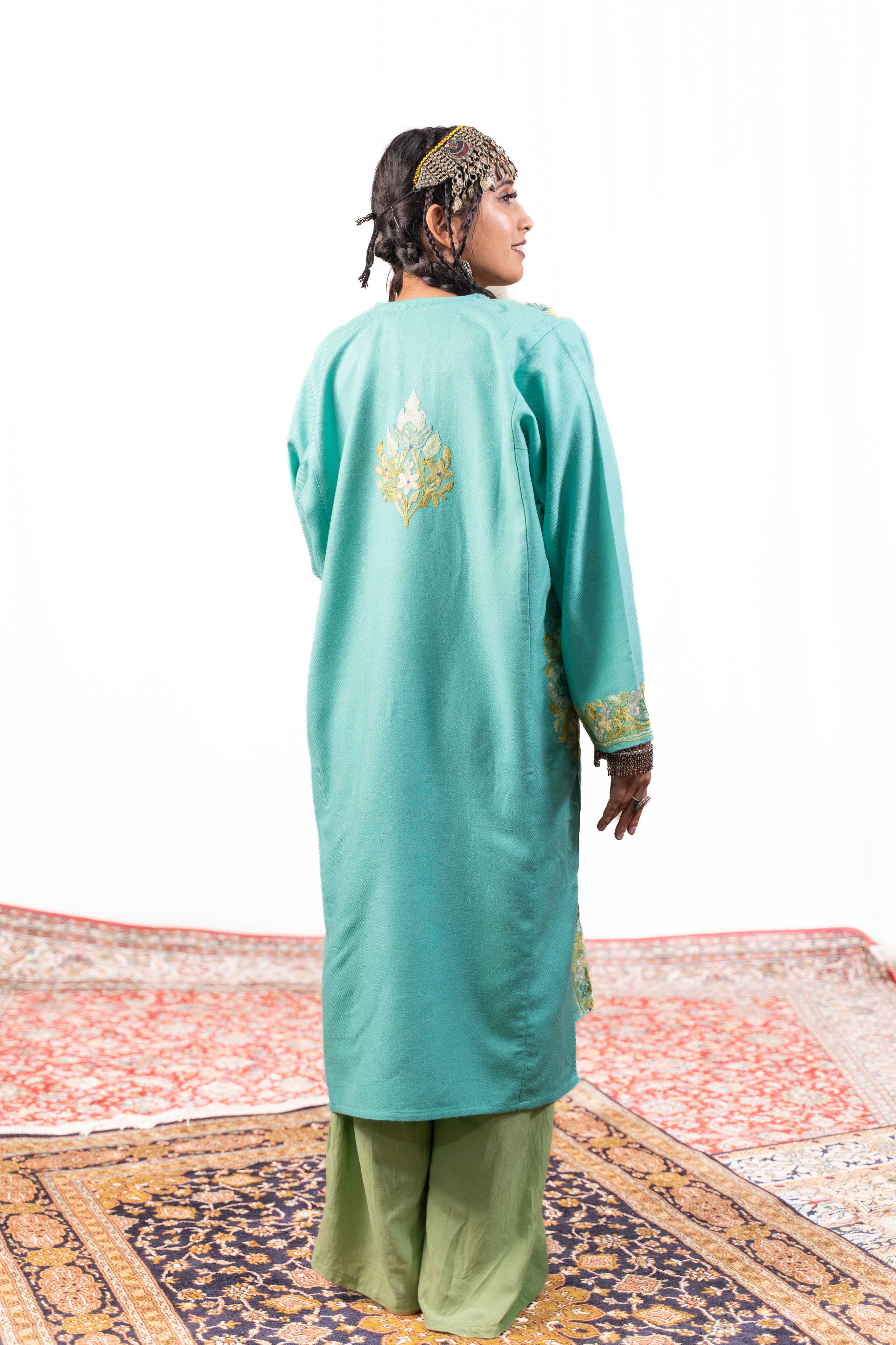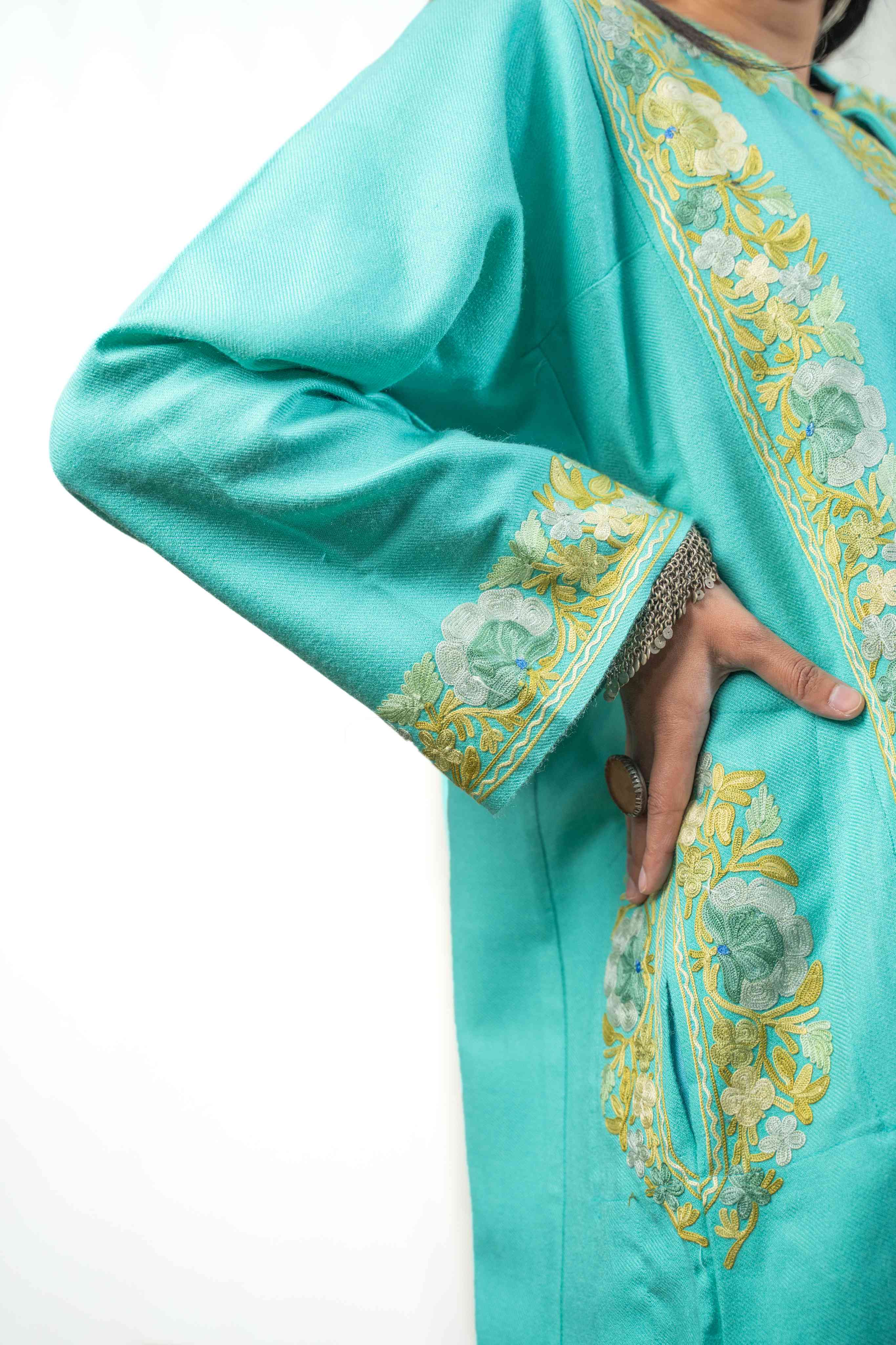 Embrace timeless Kashmiri elegance with this stunning turquoise pheran, adorned with intricate aari embroidery across the sleeves, neckline, border, and back. Crafted for comfort, this piece balances warmth with a surprisingly light feel, making it perfect for layering through seasons. Practical pockets add everyday functionality to its traditional charm. A versatile wardrobe essential that celebrates authentic craftsmanship and effortless style.