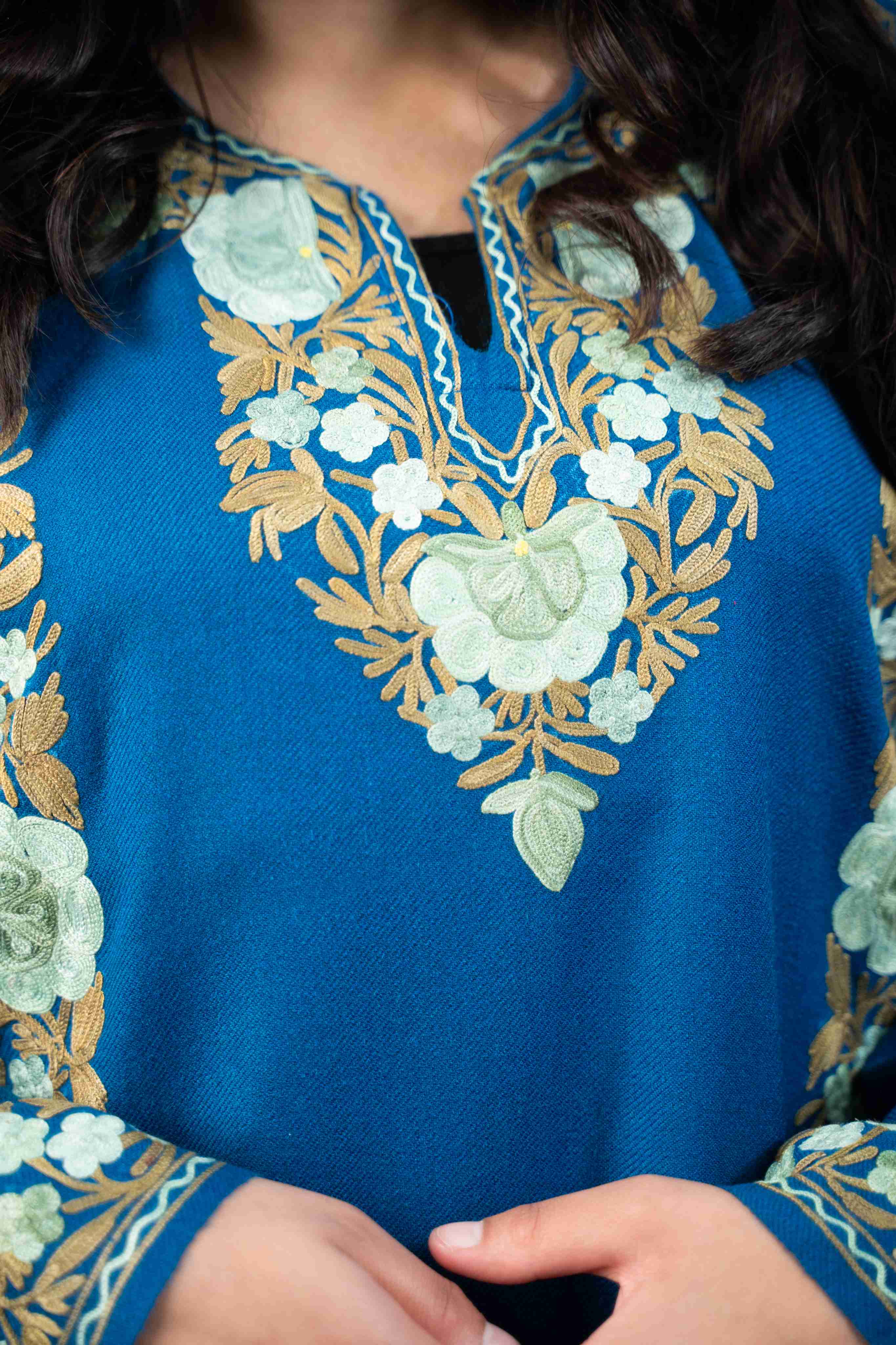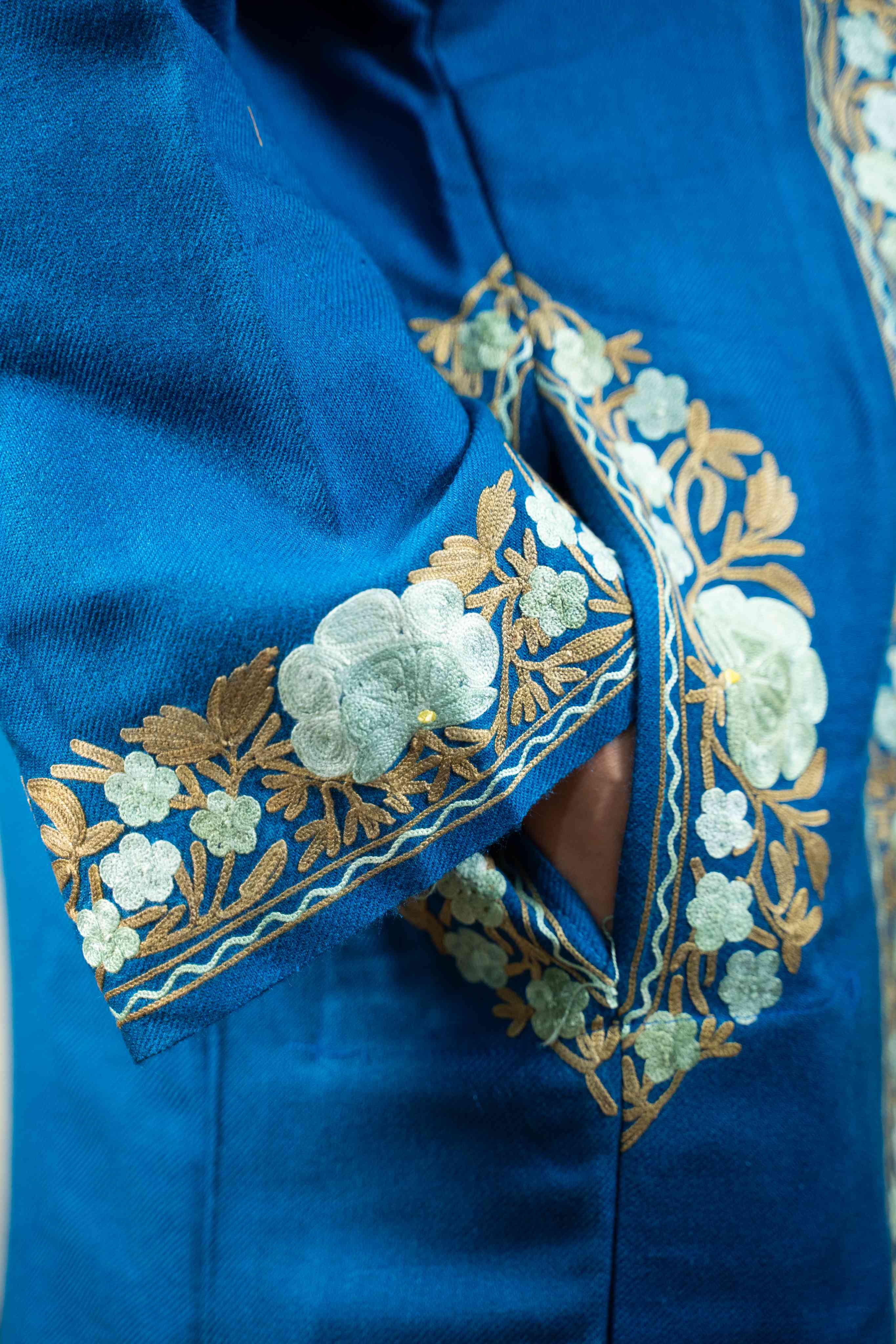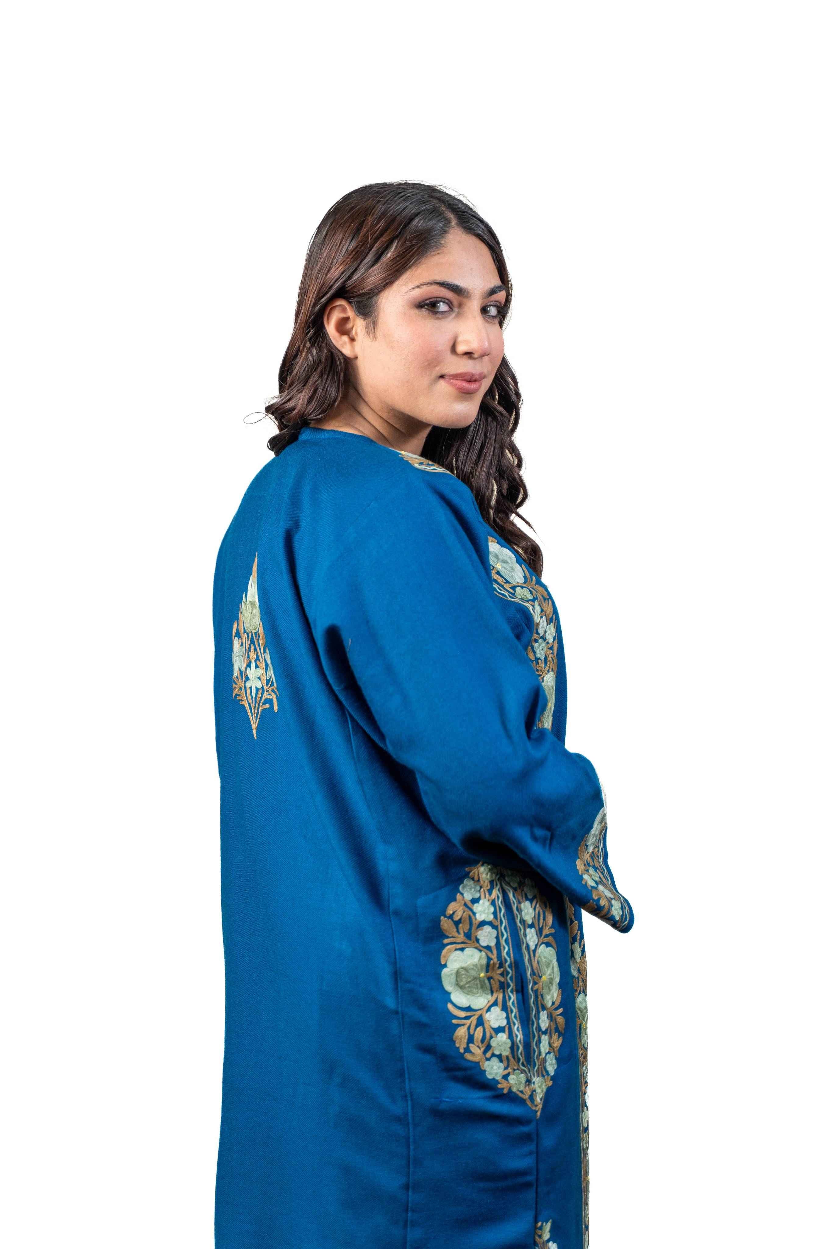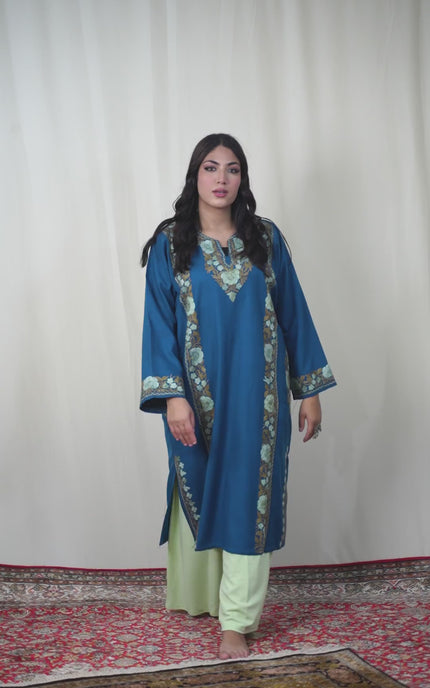Discover the perfect blend of tradition and comfort in this exquisite lapis blue pheran. Showcasing meticulous aari embroidery across the sleeves, neck border, back, and pocket details, this piece exemplifies authentic Kashmiri artistry. The thoughtful design delivers warmth without weight, making it ideal for year-round wear. Practical pockets add functionality to this elegant garment, while the intricate needlework elevates every moment you wear it. A timeless investment that brings handcrafted beauty and versatile style to your collection.