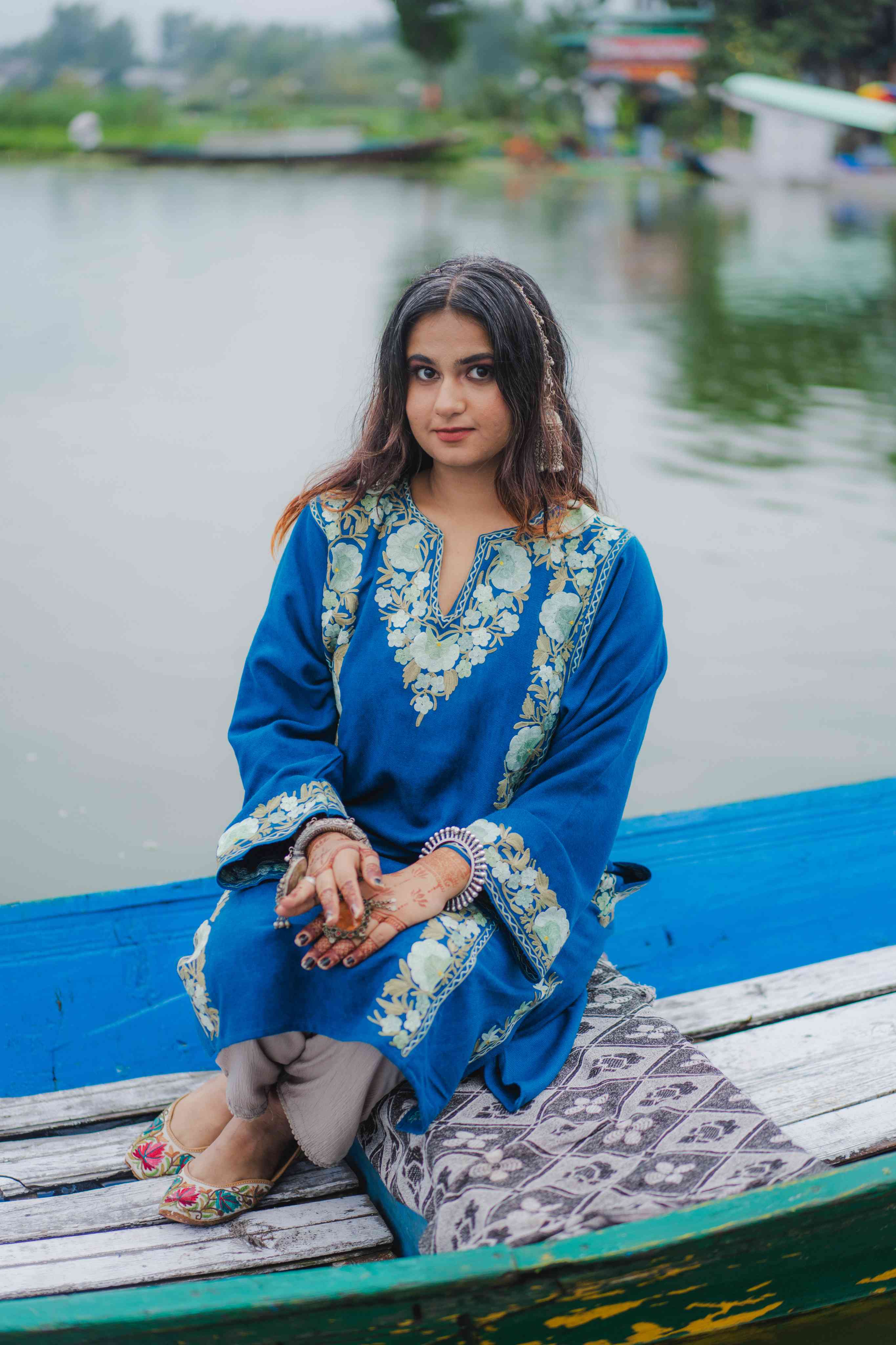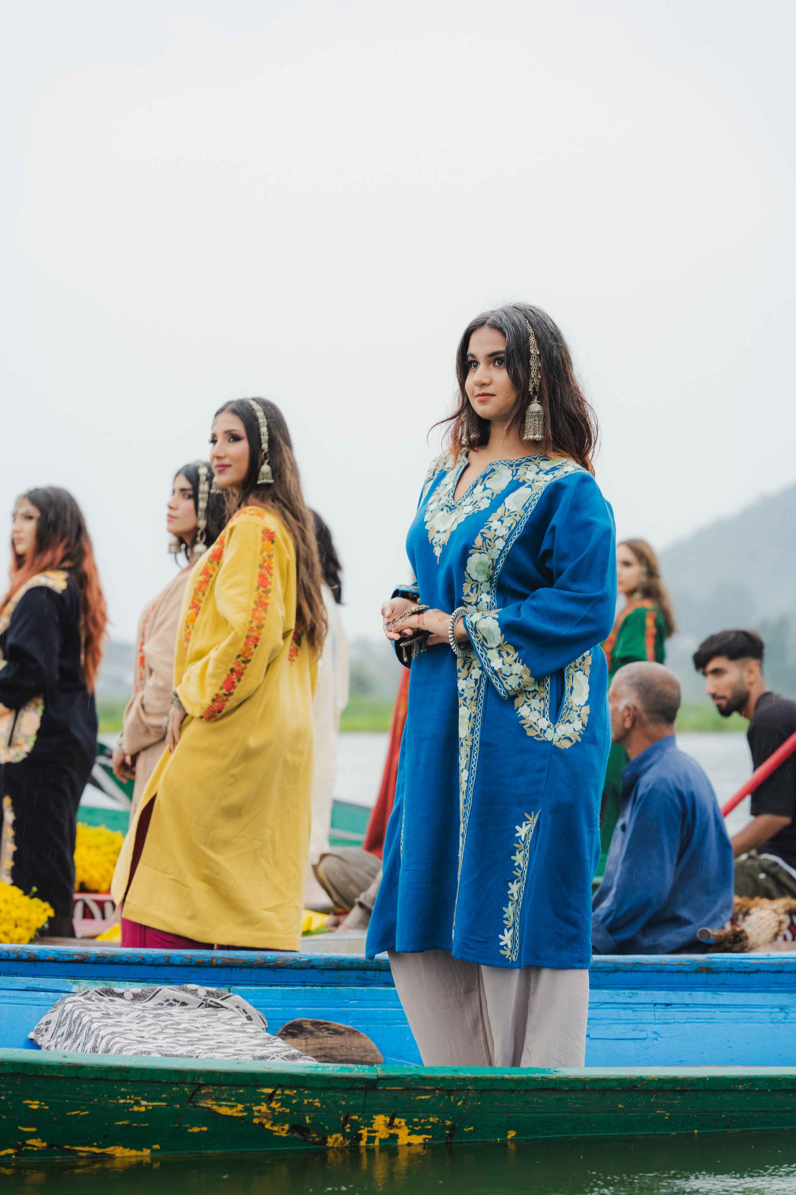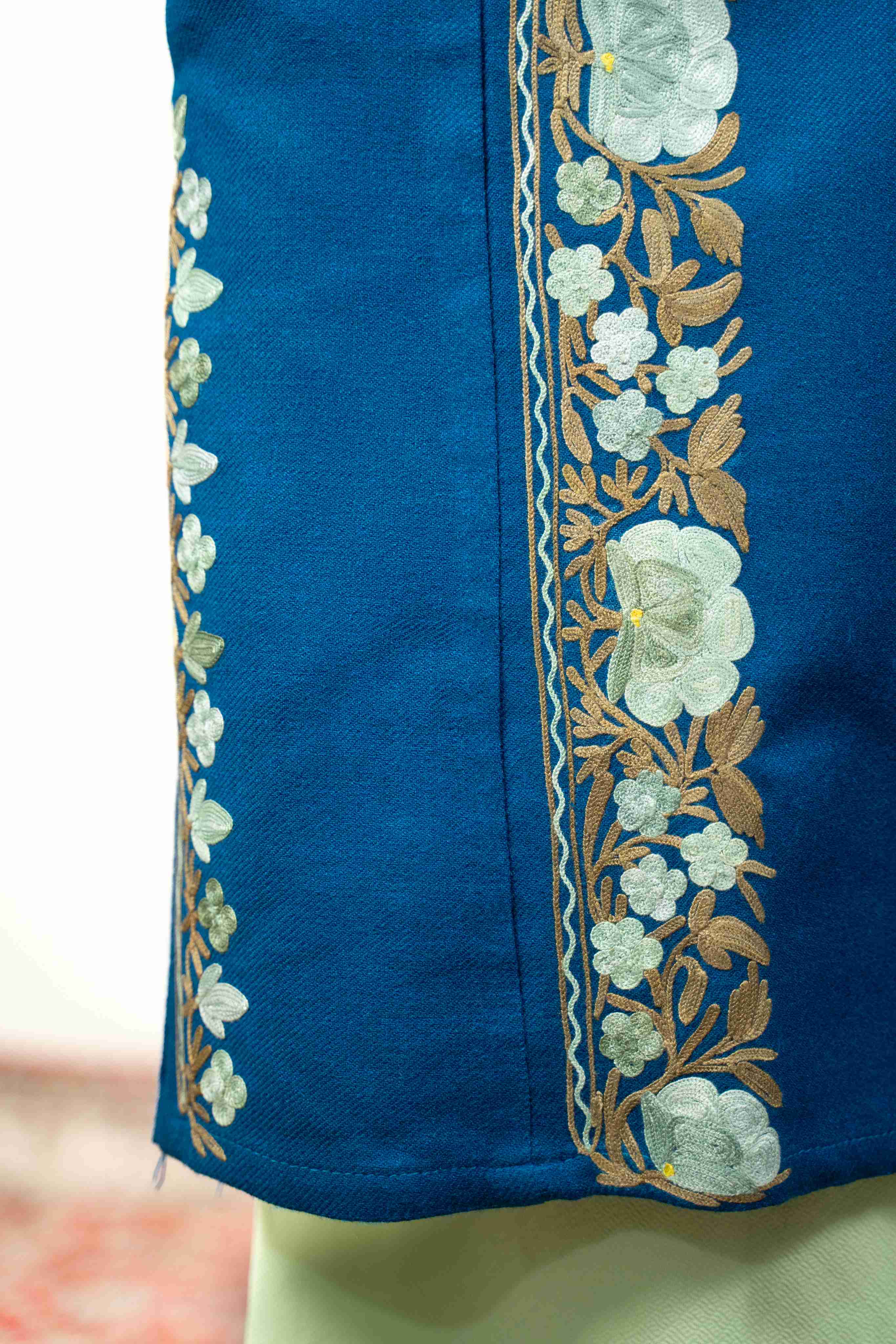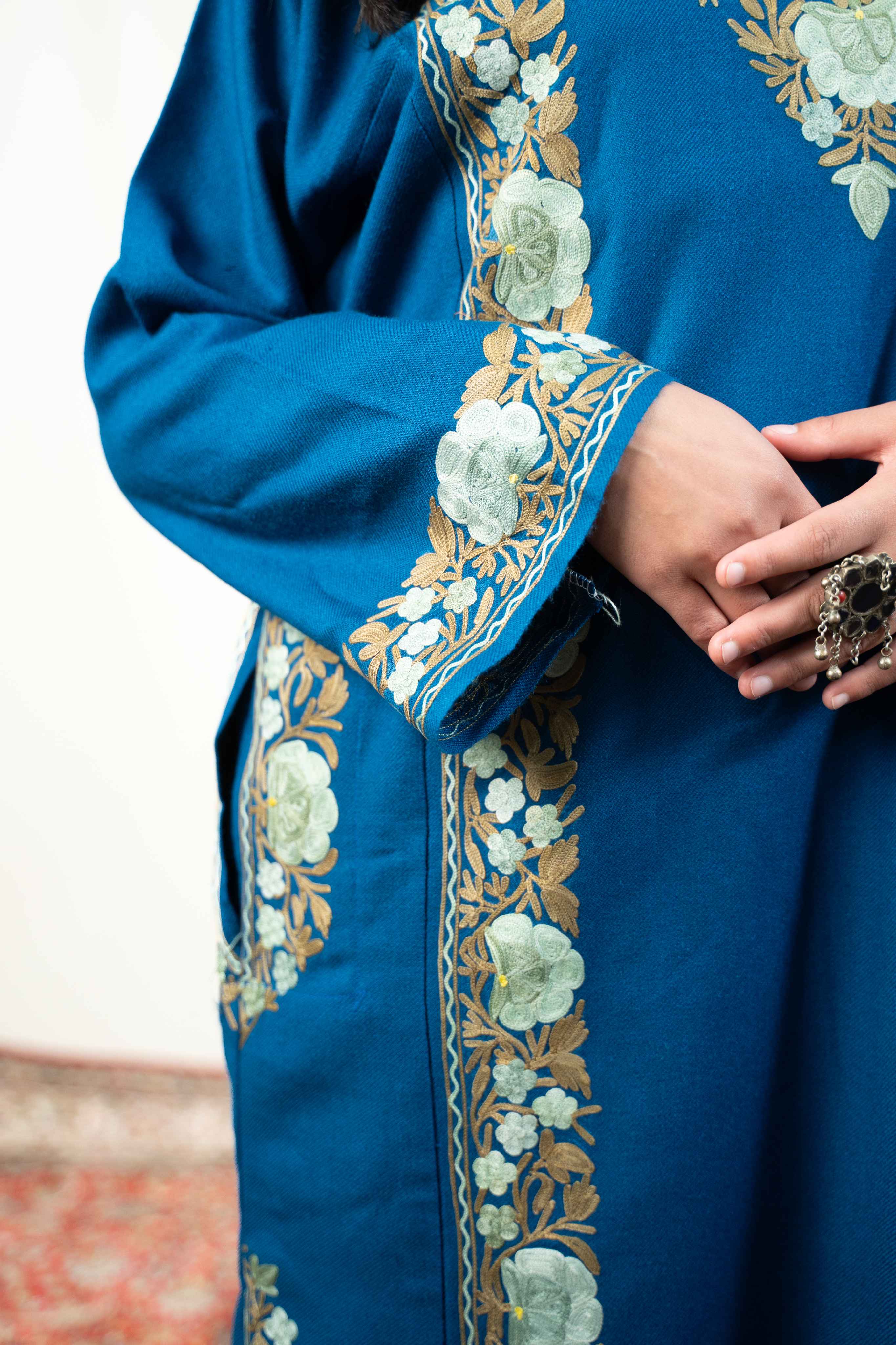 Discover the perfect blend of tradition and comfort in this exquisite lapis blue pheran. Showcasing meticulous aari embroidery across the sleeves, neck border, back, and pocket details, this piece exemplifies authentic Kashmiri artistry. The thoughtful design delivers warmth without weight, making it ideal for year-round wear. Practical pockets add functionality to this elegant garment, while the intricate needlework elevates every moment you wear it. A timeless investment that brings handcrafted beauty and versatile style to your collection.