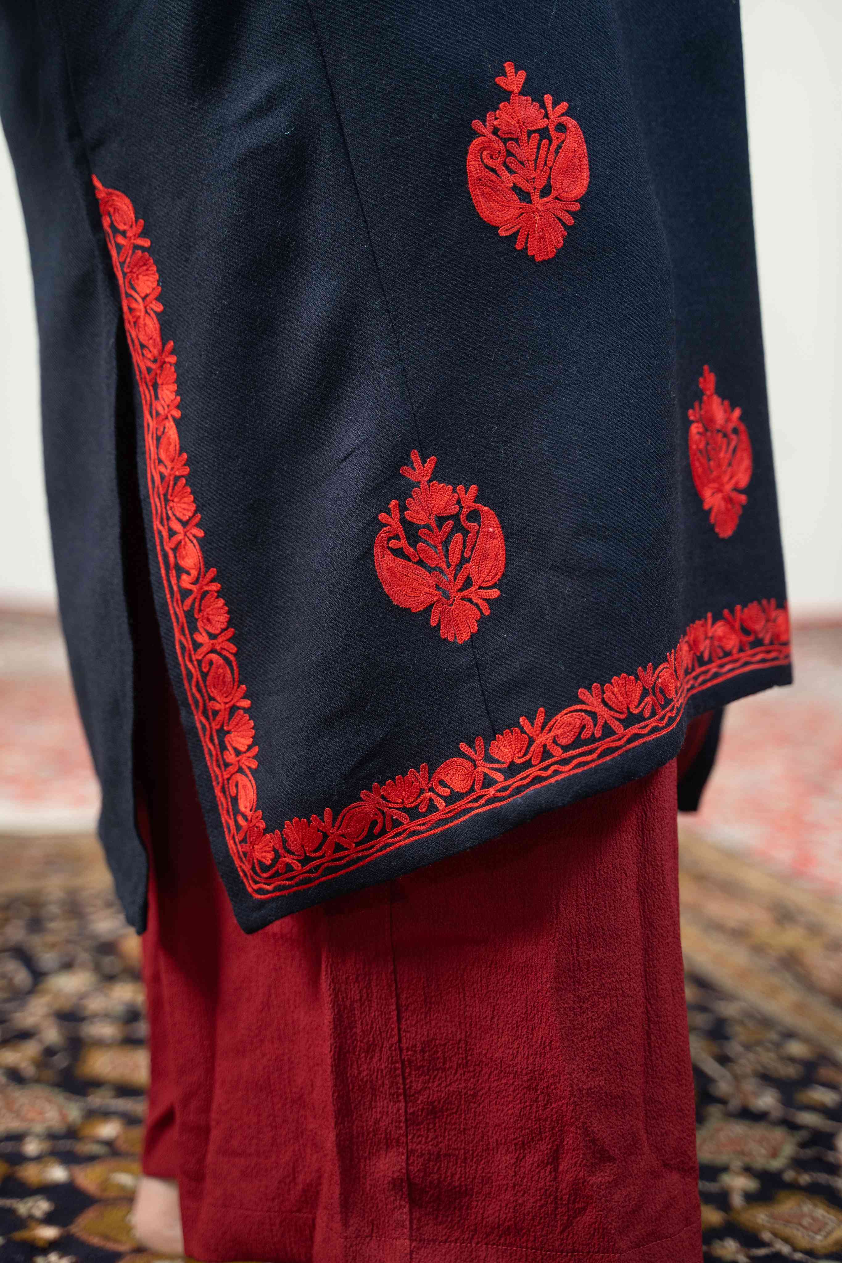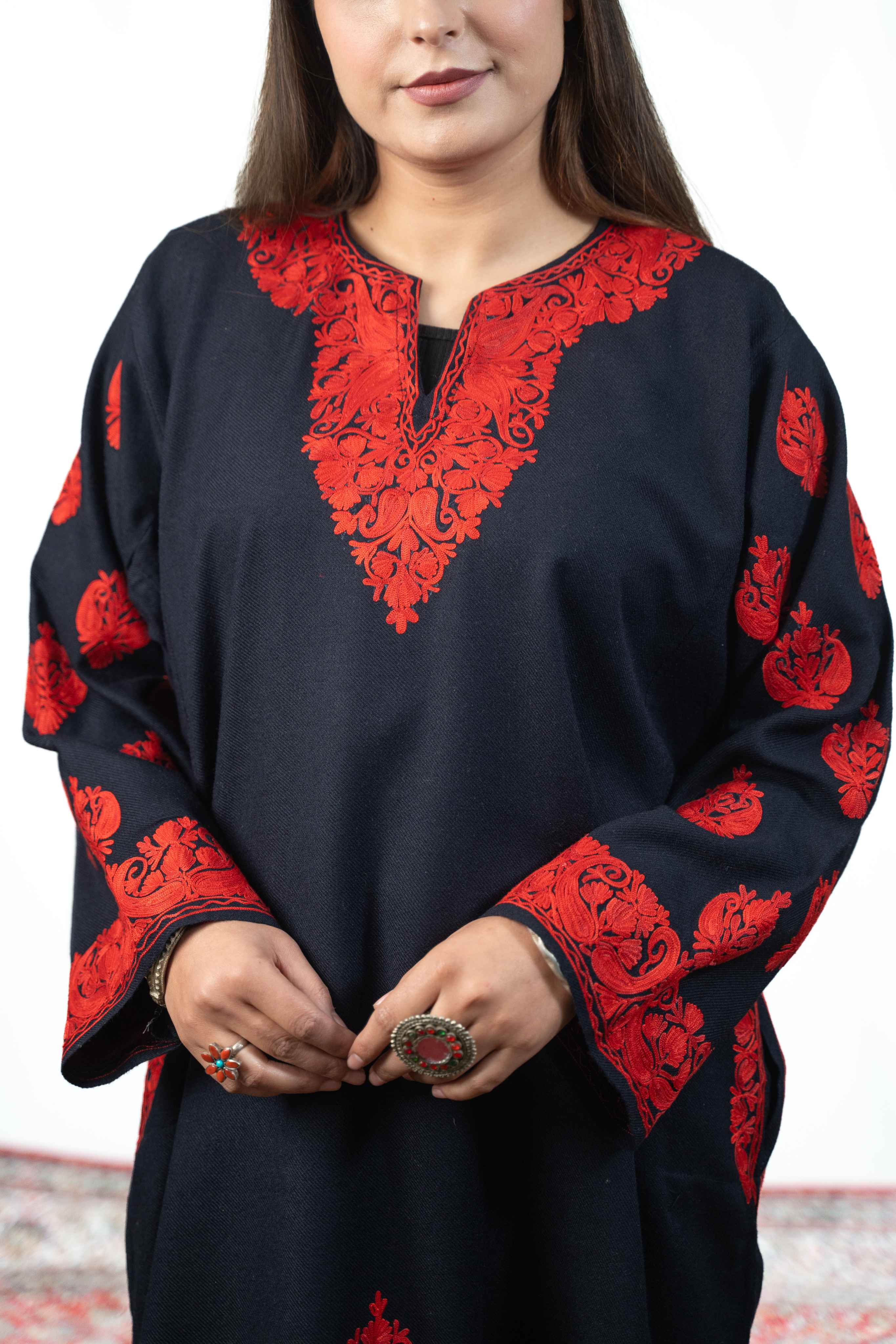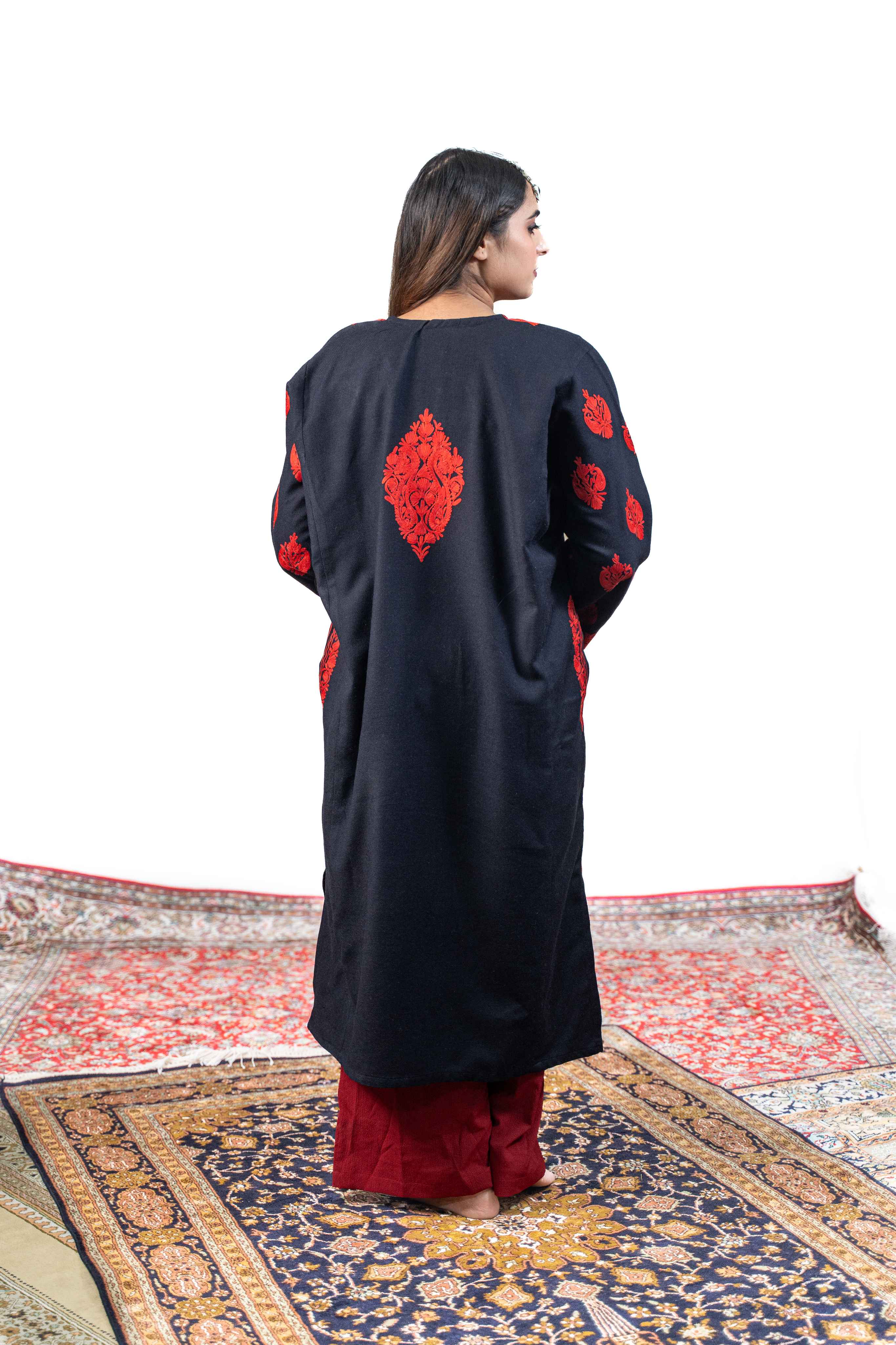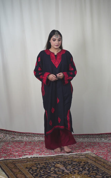 Experience the perfect fusion of tradition and comfort with this exquisite black pheran. Vibrant red aari embroidery graces the neckline, pockets, and back panel, while intricate buti patterns dance across the sleeves—each stitch a testament to Kashmiri artistry. Lightweight yet wonderfully warm, this versatile piece moves with you throughout the day. Functional pockets ensure practicality meets beauty, making it an essential addition to any wardrobe seeking authentic craftsmanship and timeless appeal.