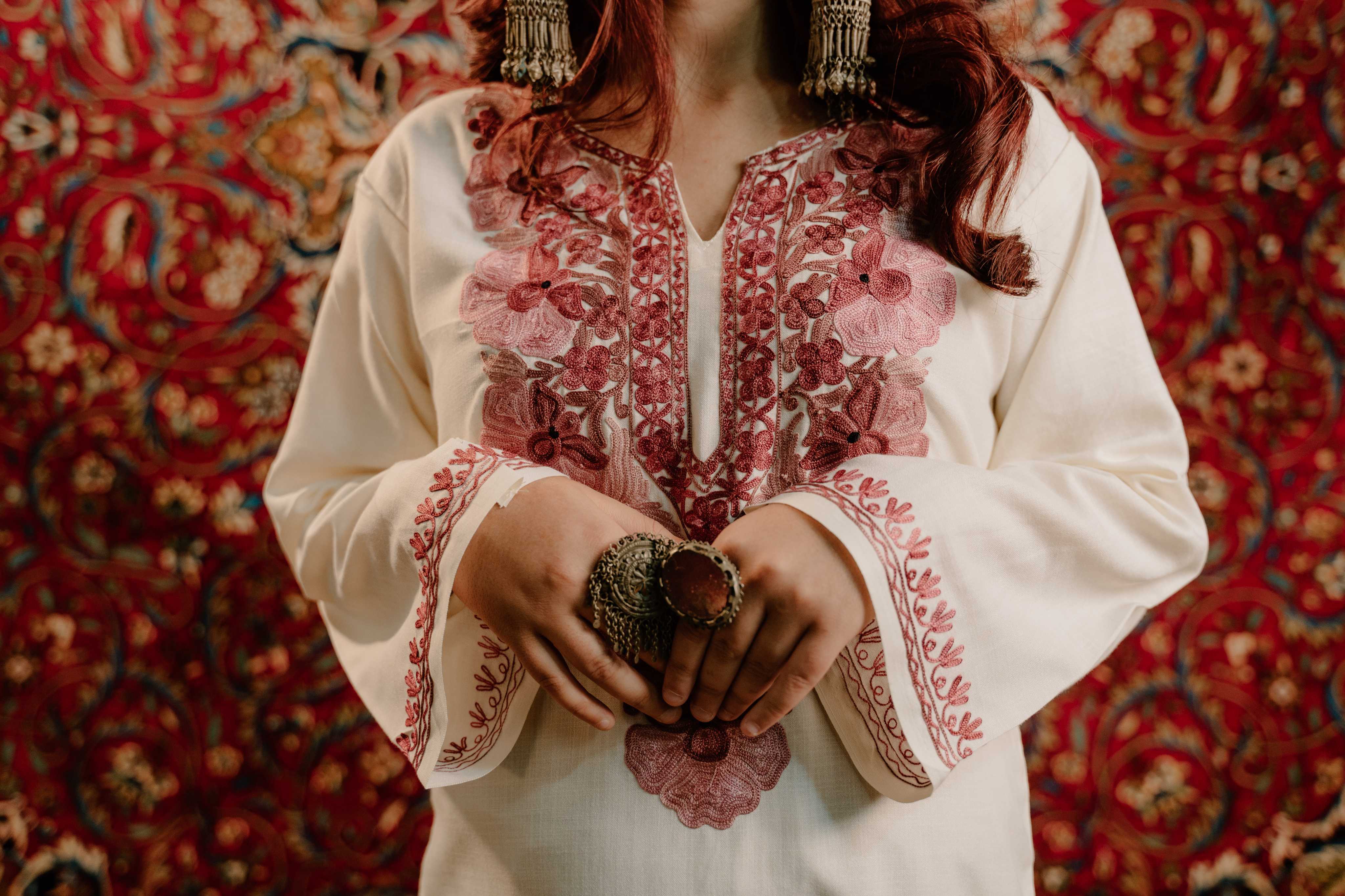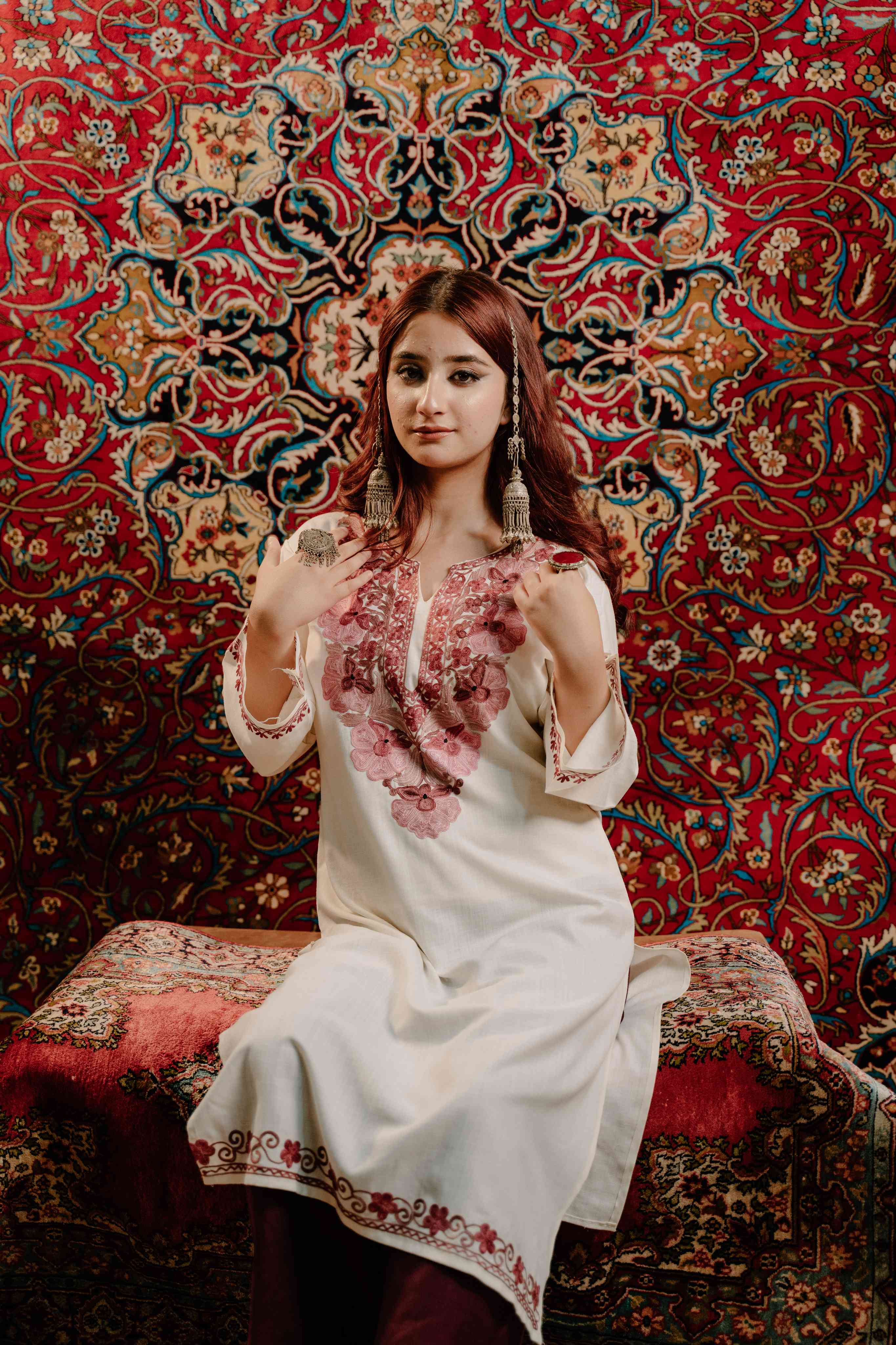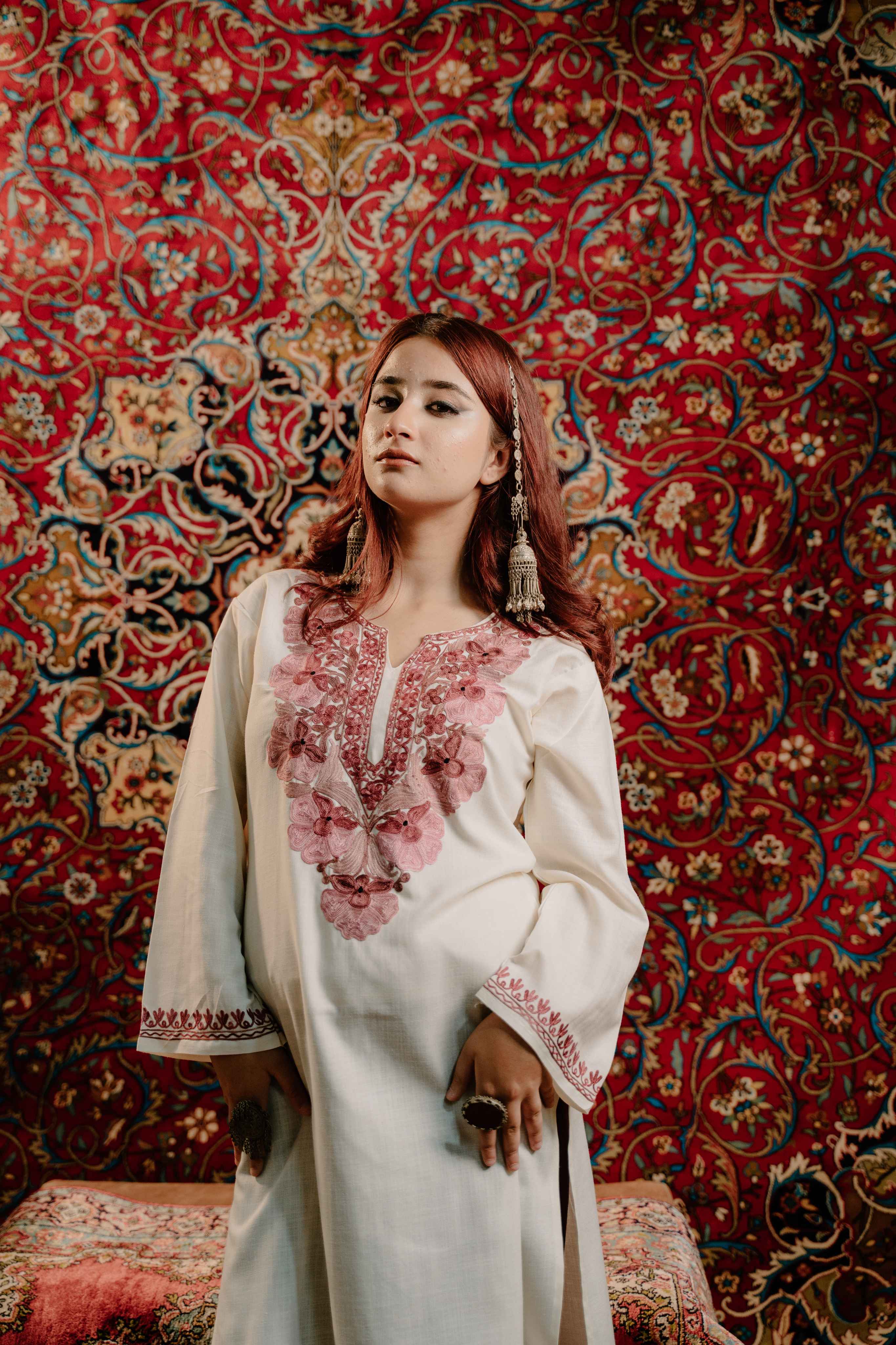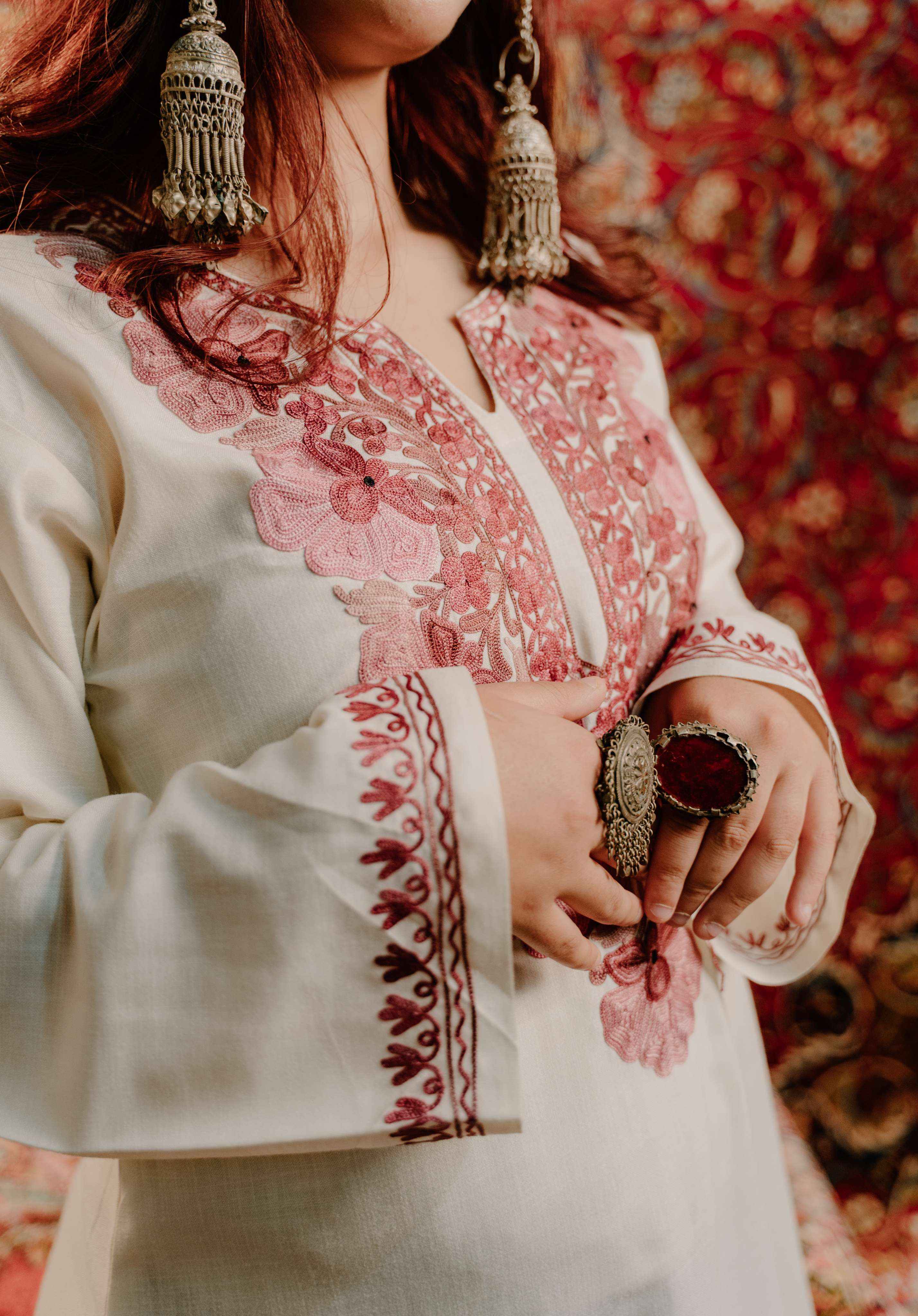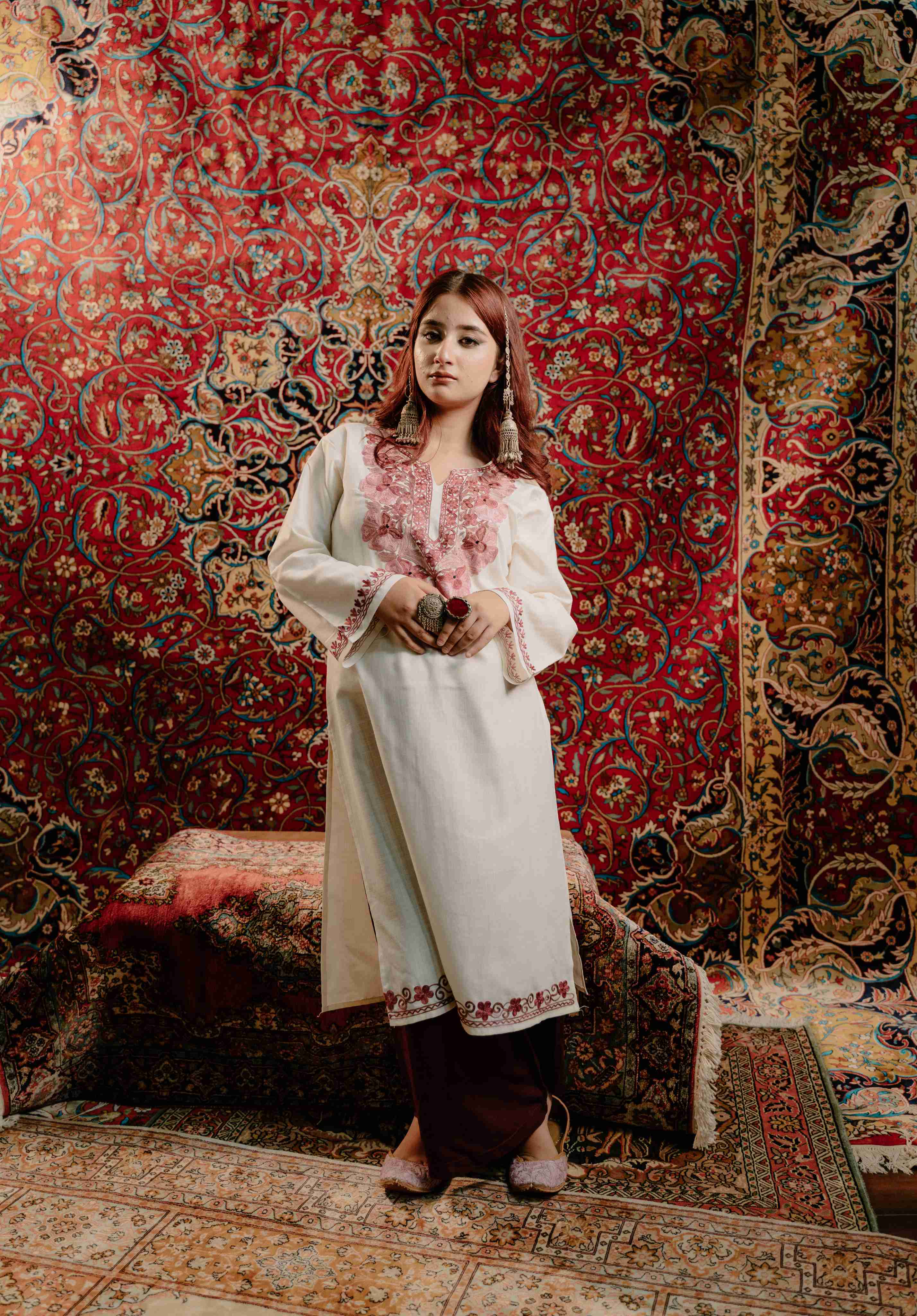 Kashmiri Aari Work Cotton Kurti - White | Long