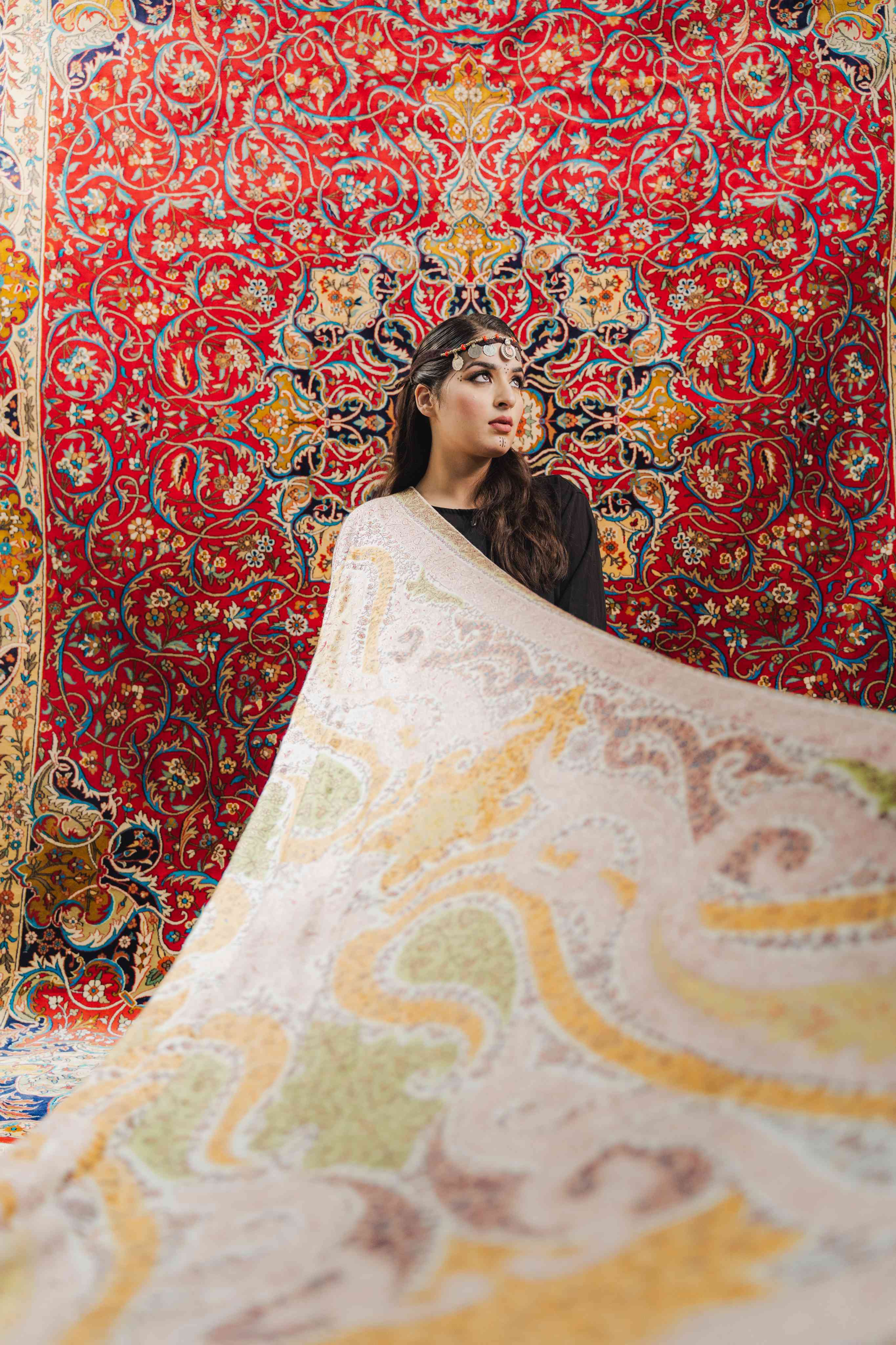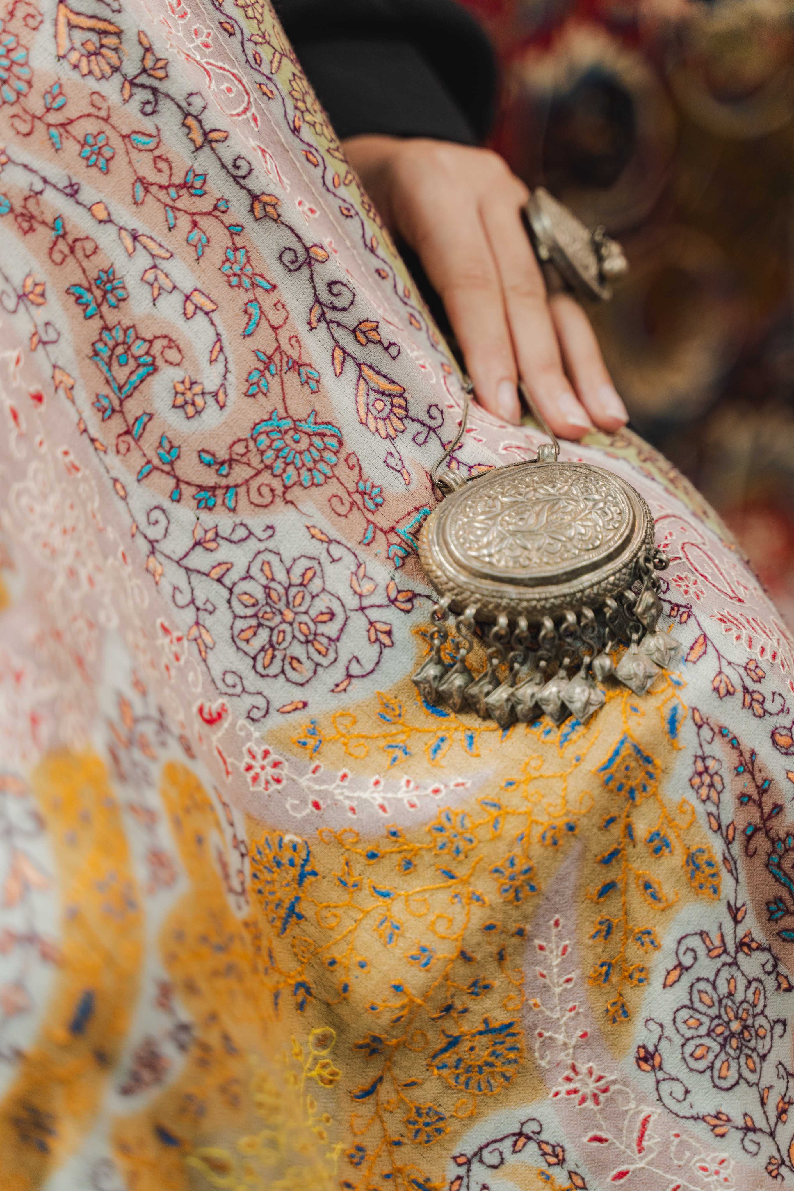 Kashmiri Kalamkari Sozni Work Shawl - White | Handmade