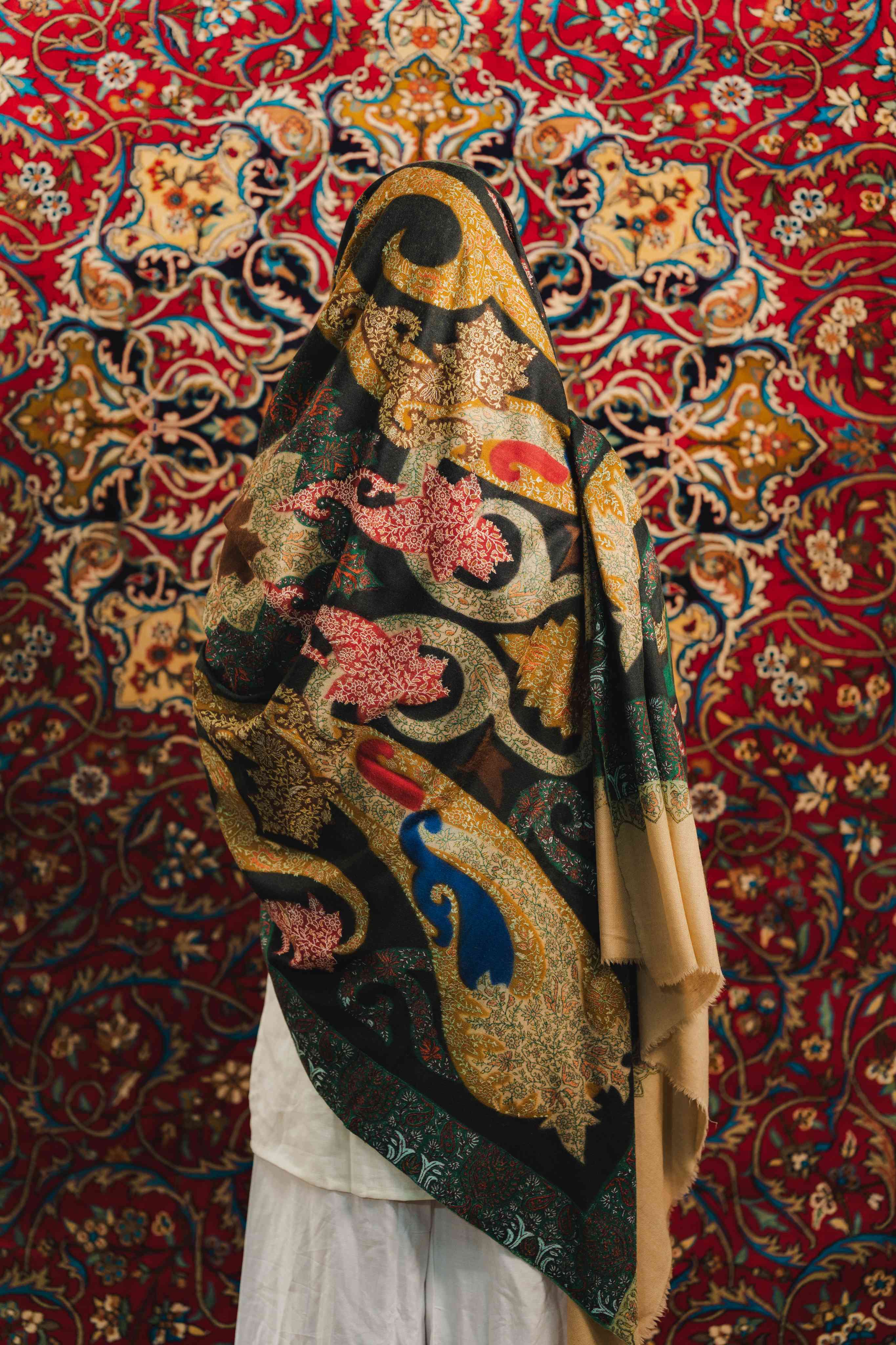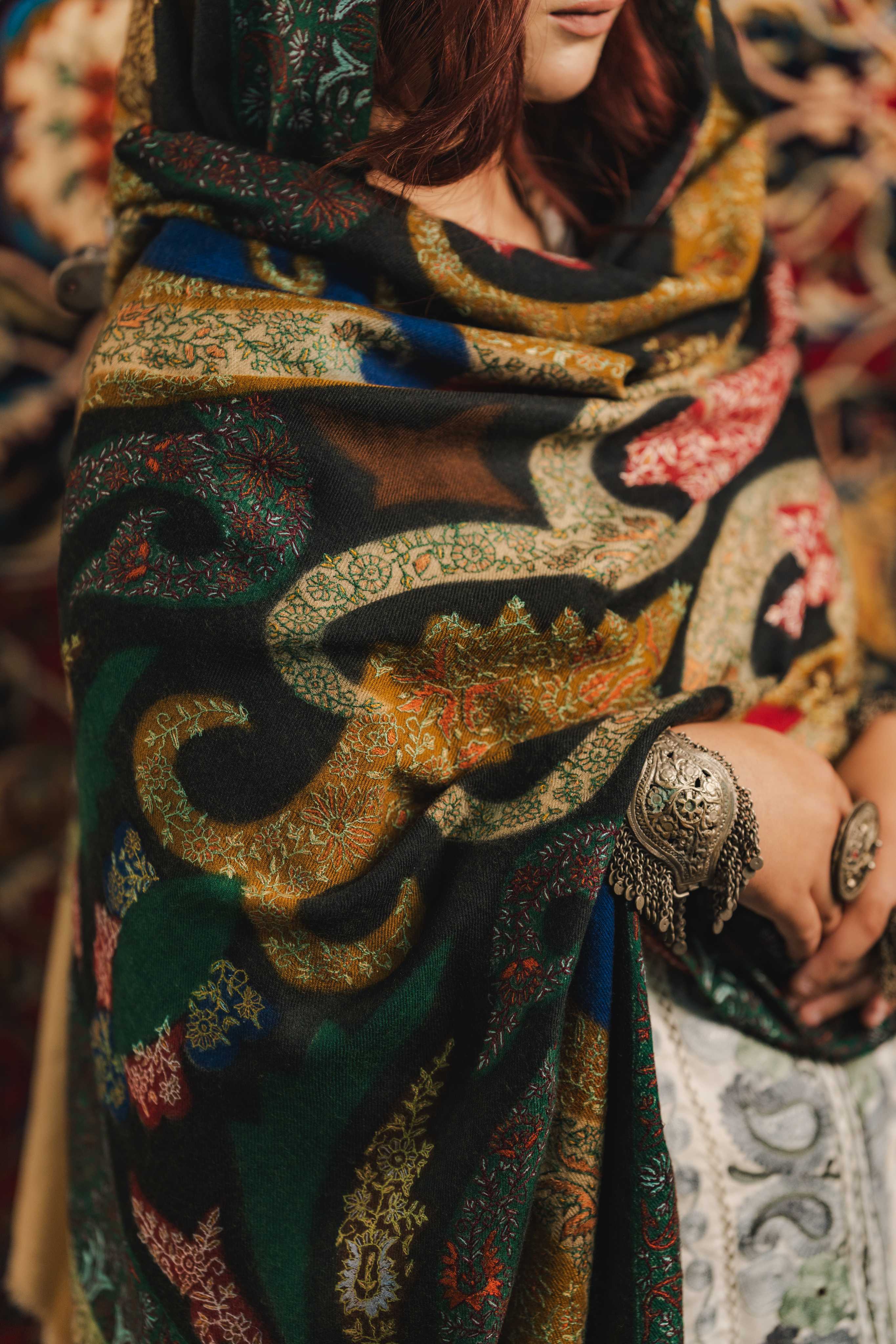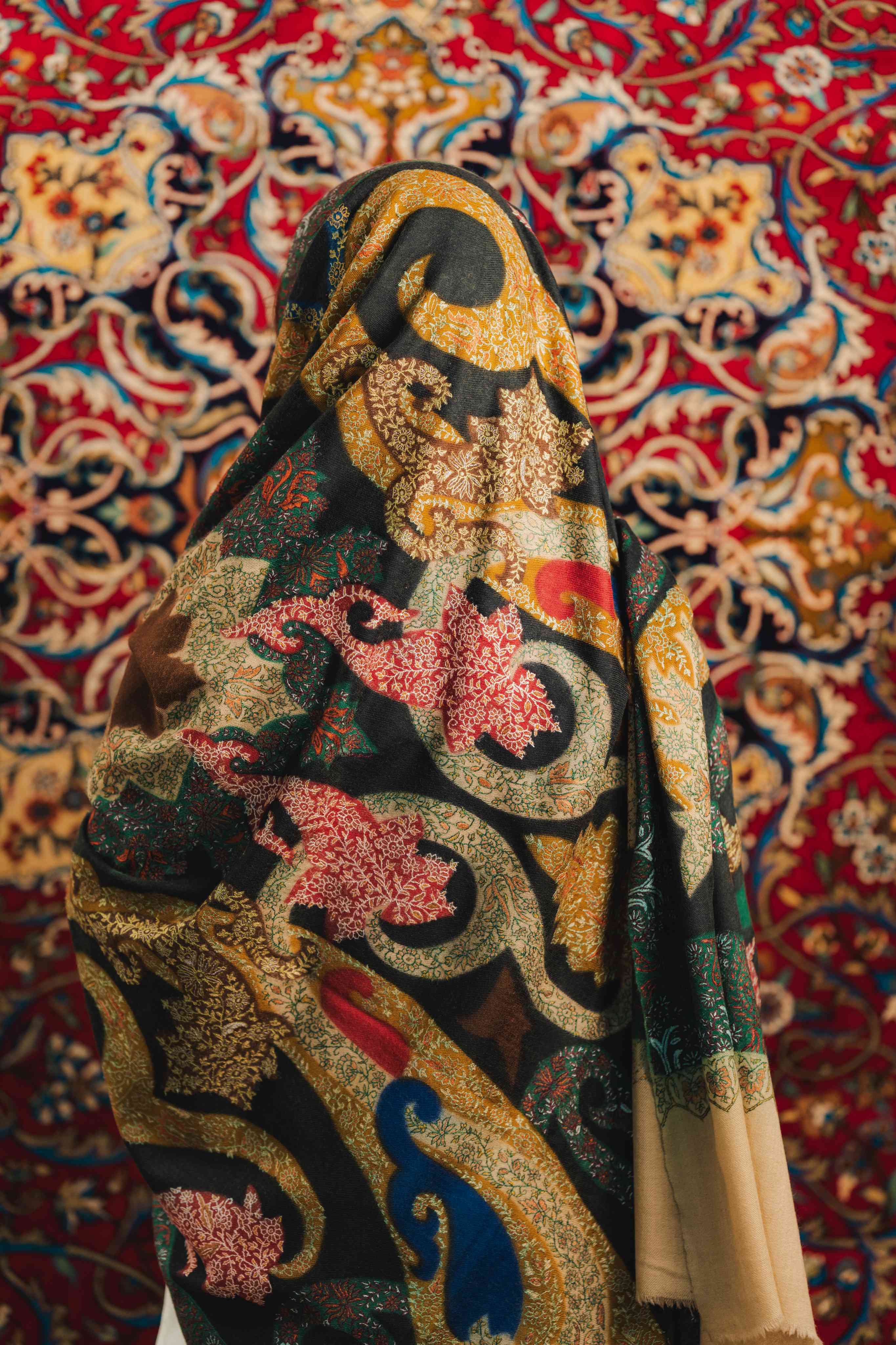 Kalamkari Sozni Work Shawl - Black Multi Colour | Handmade