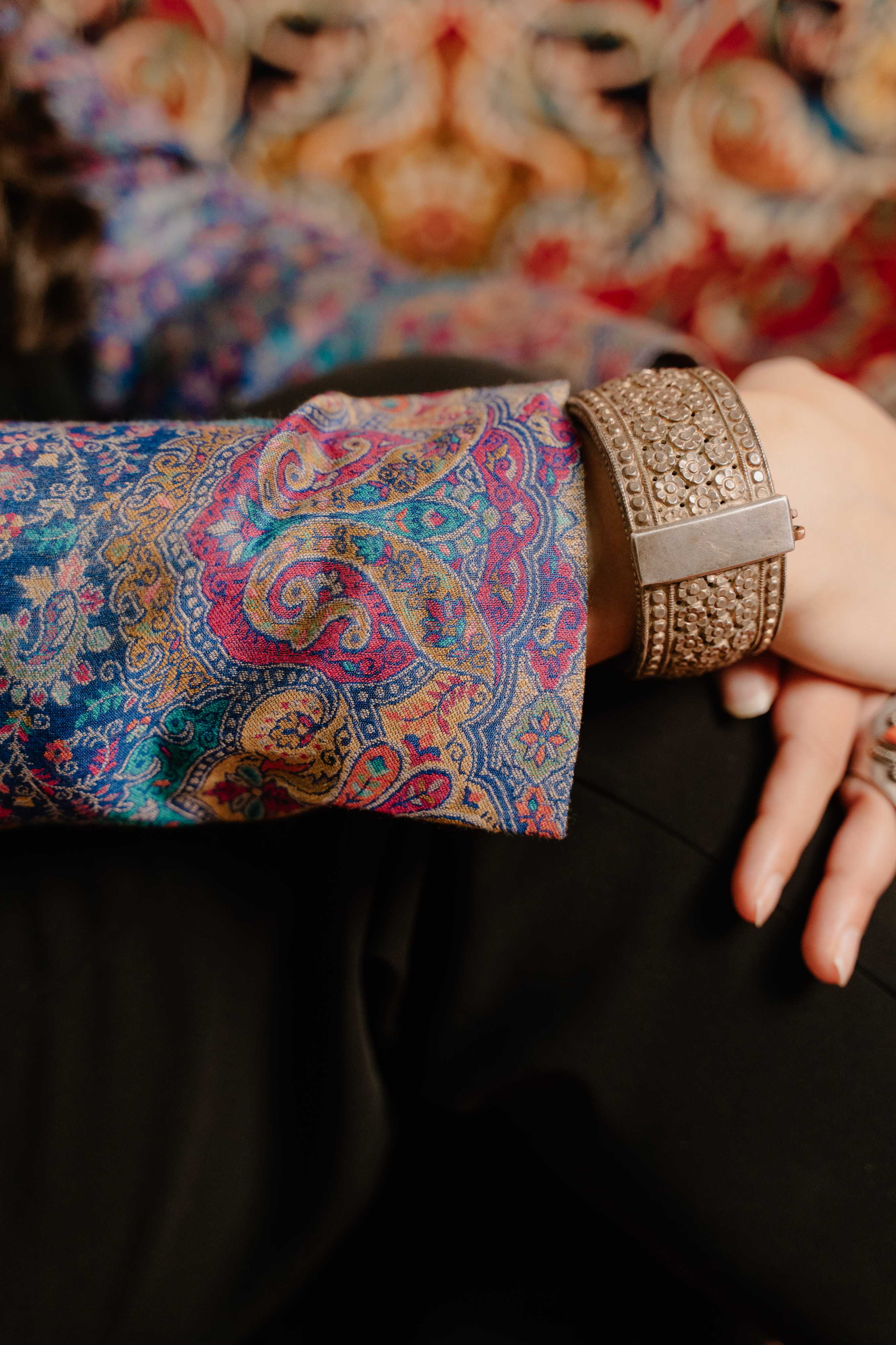 Elevate your wardrobe with this exquisite Kashmiri Kani work jacket, a masterpiece of traditional craftsmanship. Meticulously hand-embroidered with the intricate Kani technique, this silk jacket showcases the rich heritage of Kashmir's textile artistry. The luxurious blue silk drapes beautifully, while the detailed embroidery work adds timeless elegance to any ensemble. Perfect for special occasions or refined everyday wear, this jacket seamlessly blends cultural artistry with contemporary style. A treasured investment piece that celebrates authentic Kashmiri artisanal excellence.