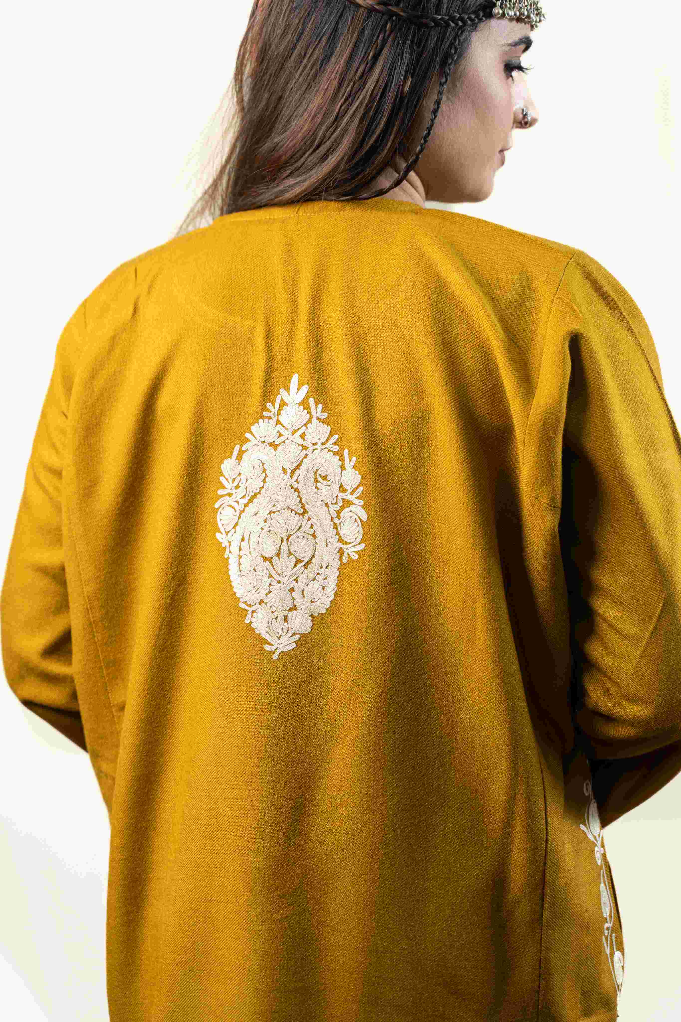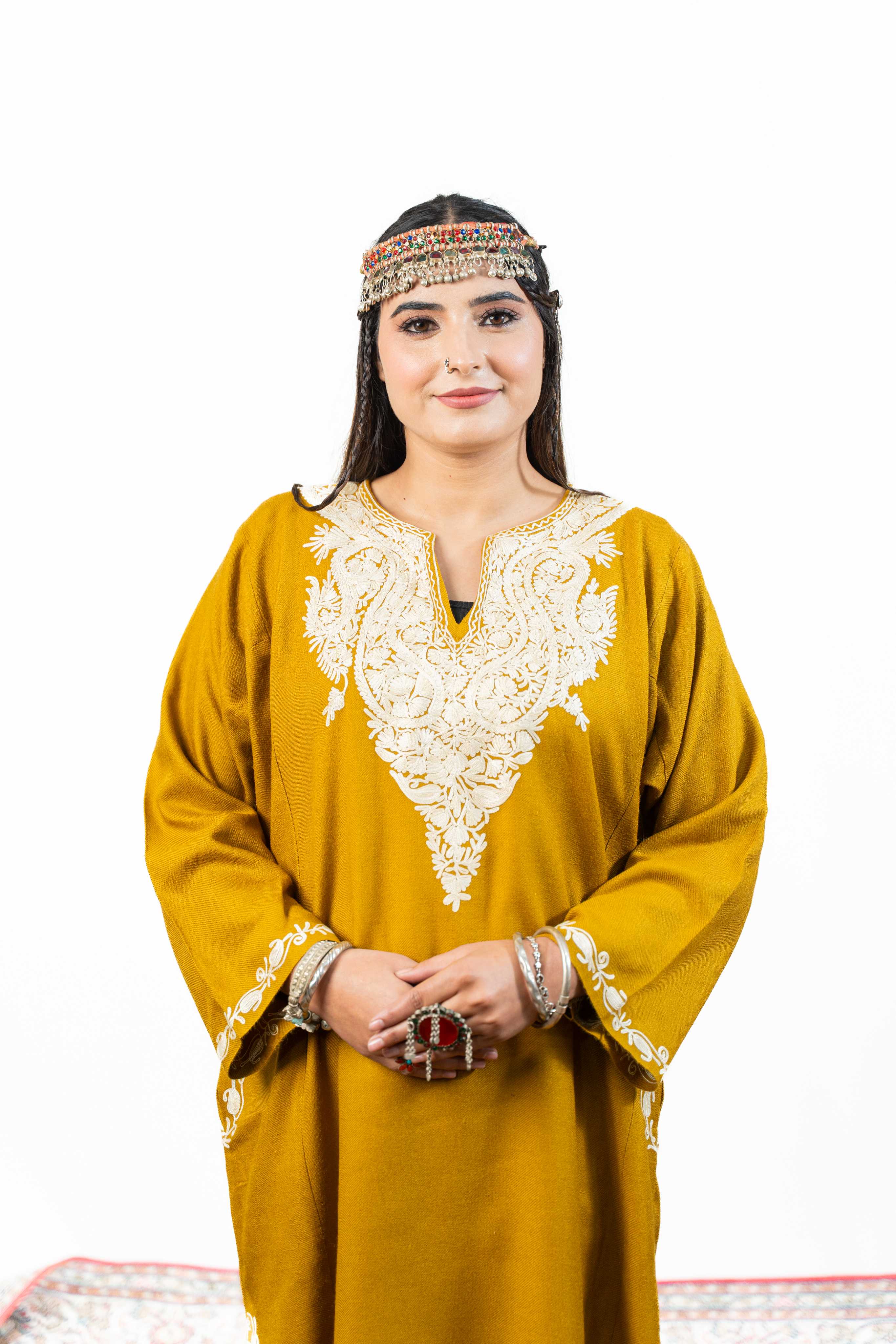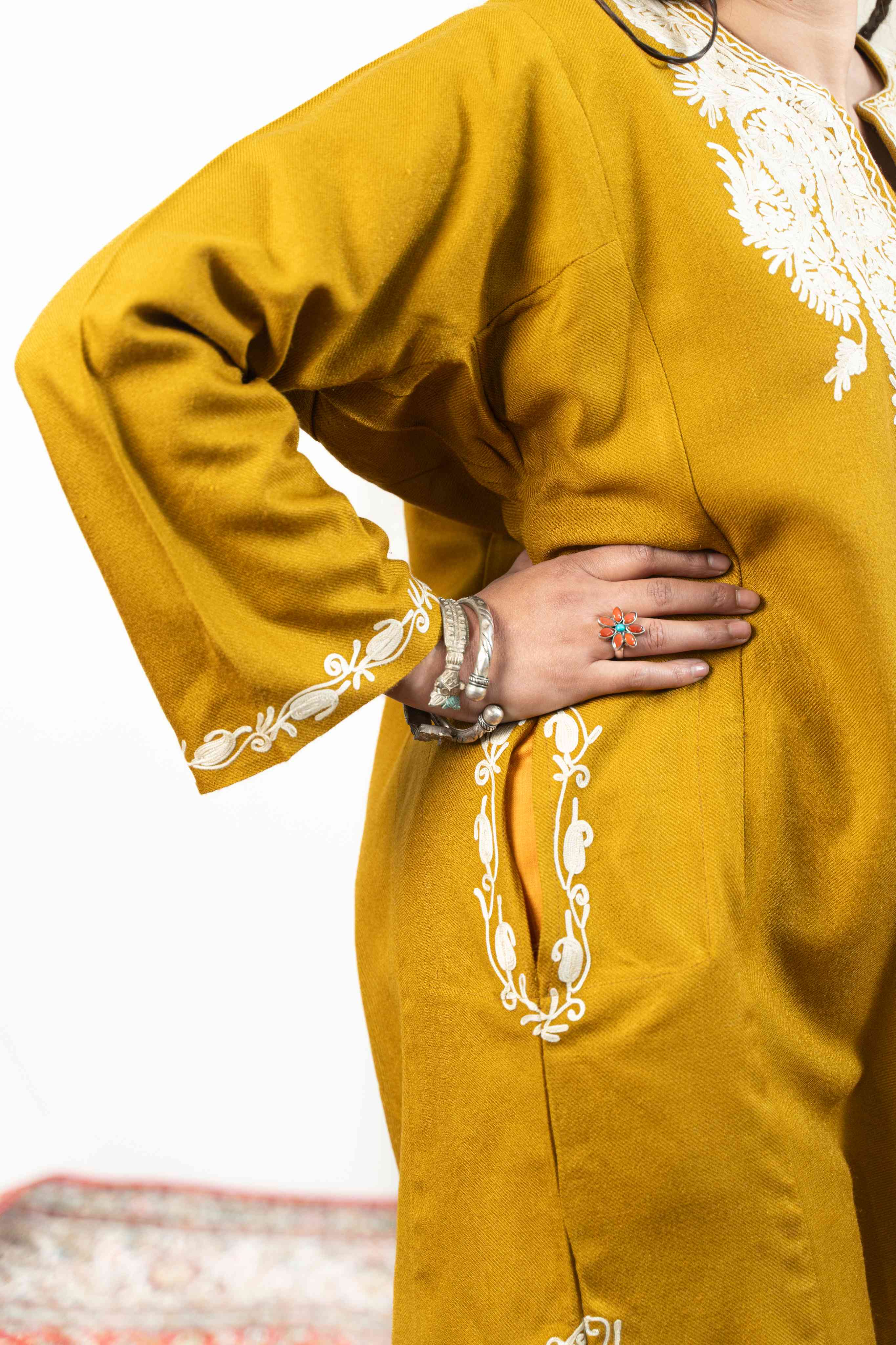 This Mustard Aari Work Pheran is an audacious celebration of Kashmiri craftsmanship. Adorned with exquisite aari embroidery across the neckline, back border, sleeves, and pockets, it's a wearable work of art that commands presence. The thoughtfully placed pockets add everyday functionality to this heirloom-quality piece. What sets it apart is its remarkable balance—lightweight enough for effortless wear, yet engineered to deliver genuine warmth. For those unafraid to make a cultural statement with uncompromising style, this pheran is your answer.