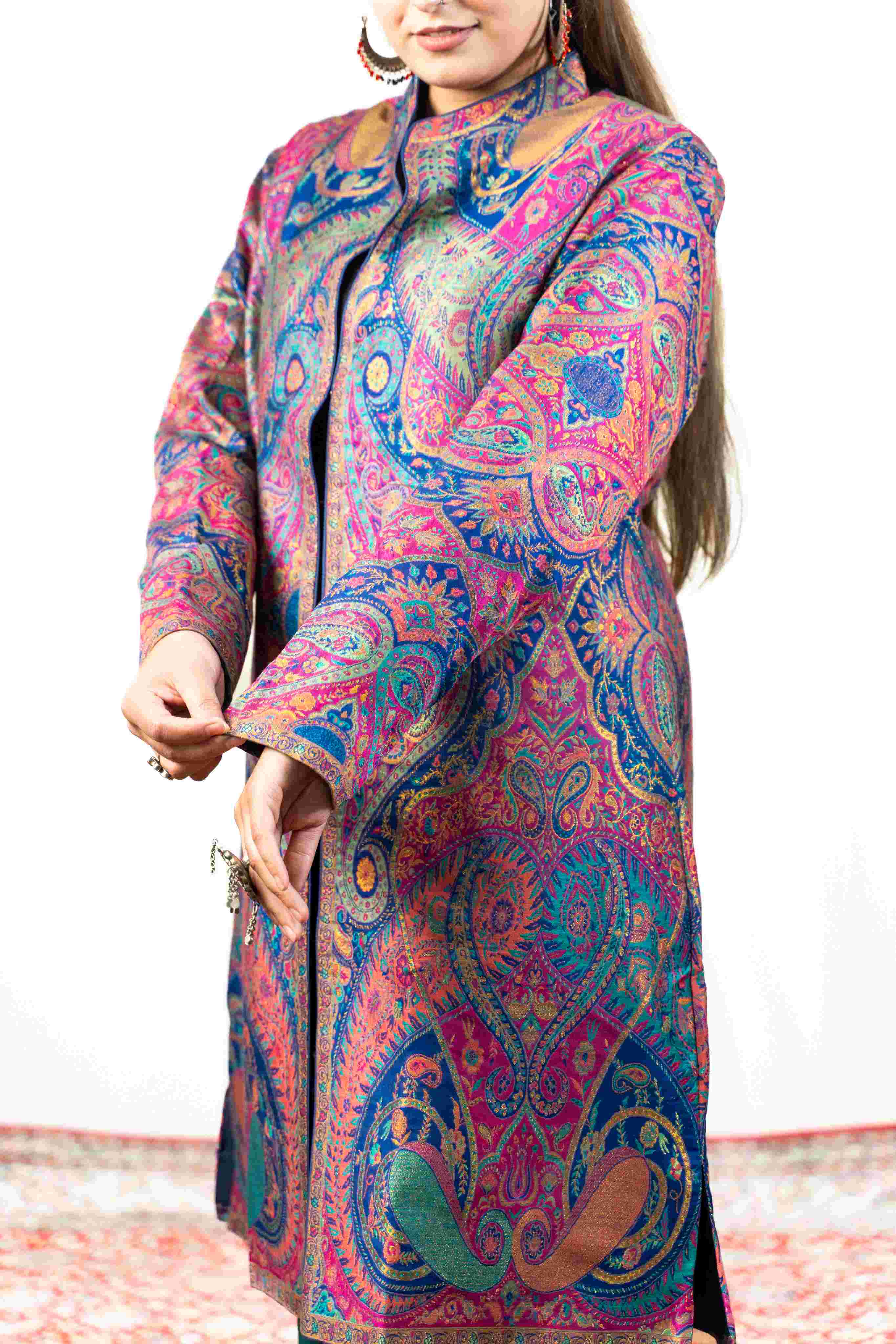 Elevate your wardrobe with this exquisite Kashmiri Kani with Zari work jacket, a masterpiece of traditional and Designer craftsmanship. Hand-embellished with intricate Kani weaving techniques, this silk jacket features the signature geometric patterns and rich color palettes that define Kashmir's textile heritage. The long silhouette offers graceful draping and versatile styling for both formal occasions and refined everyday wear. Each piece celebrates generations of artisanal skill, making it a timeless investment in authentic luxury.