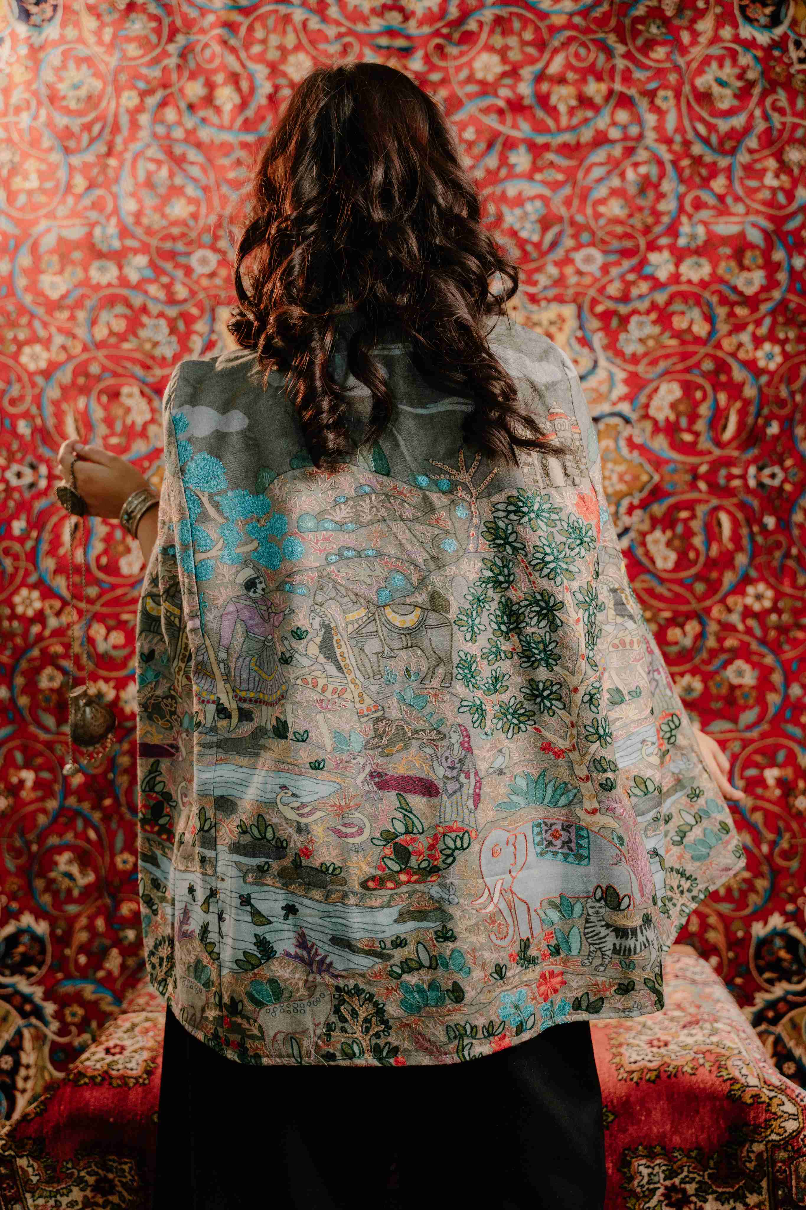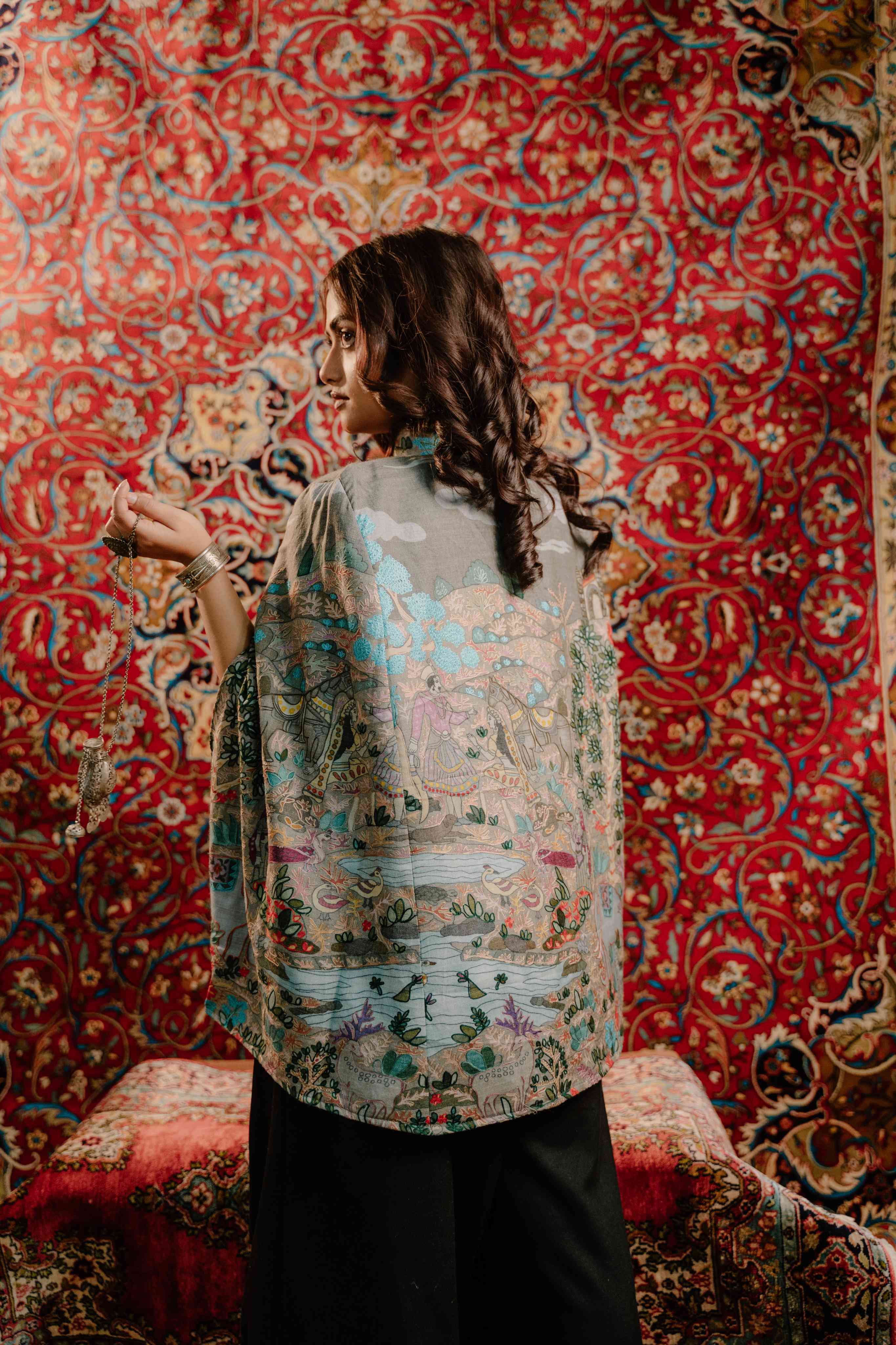 Kashmiri Kalamkari Darbar Cape Jacket - Natural | Soft Wool