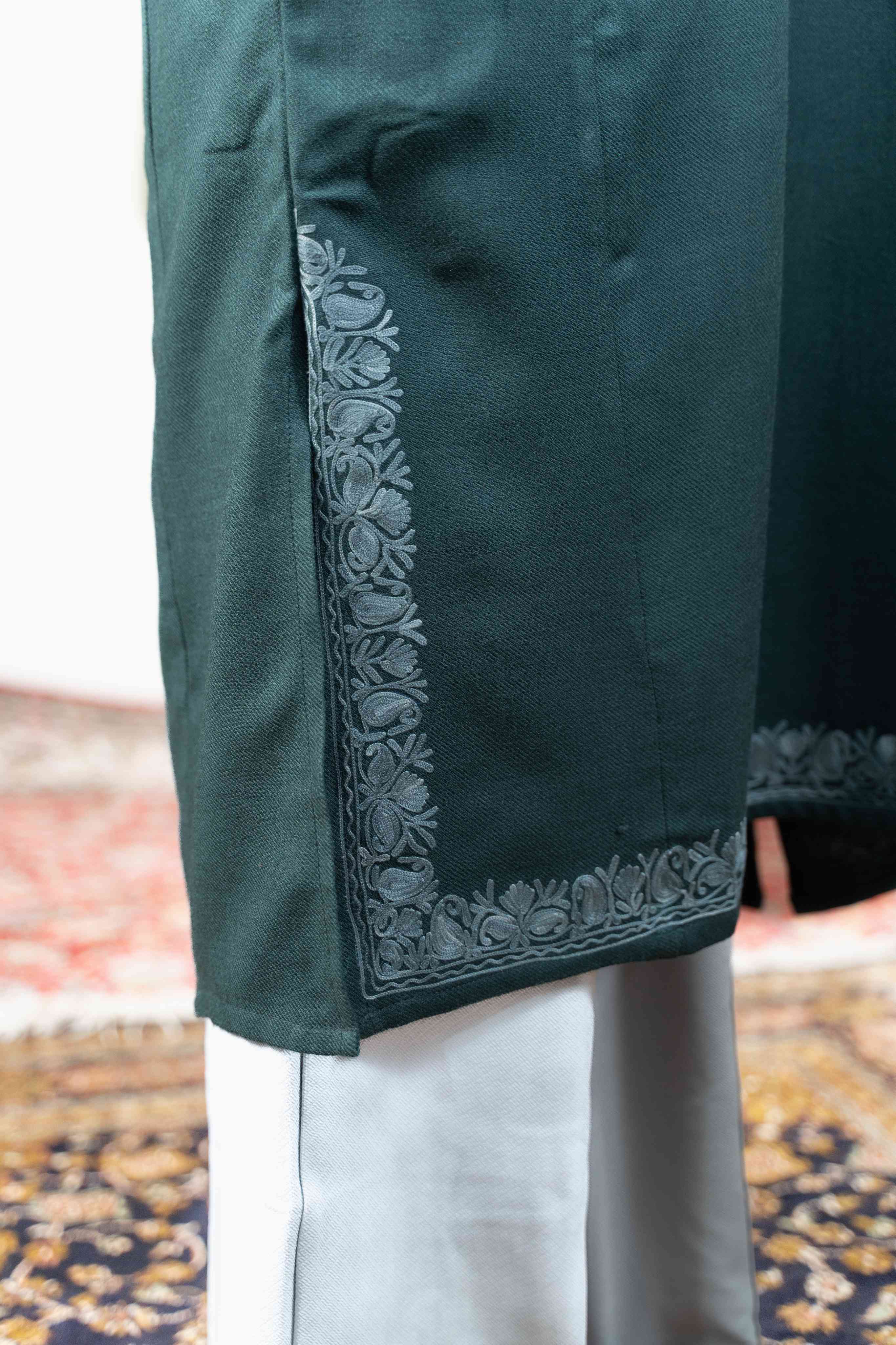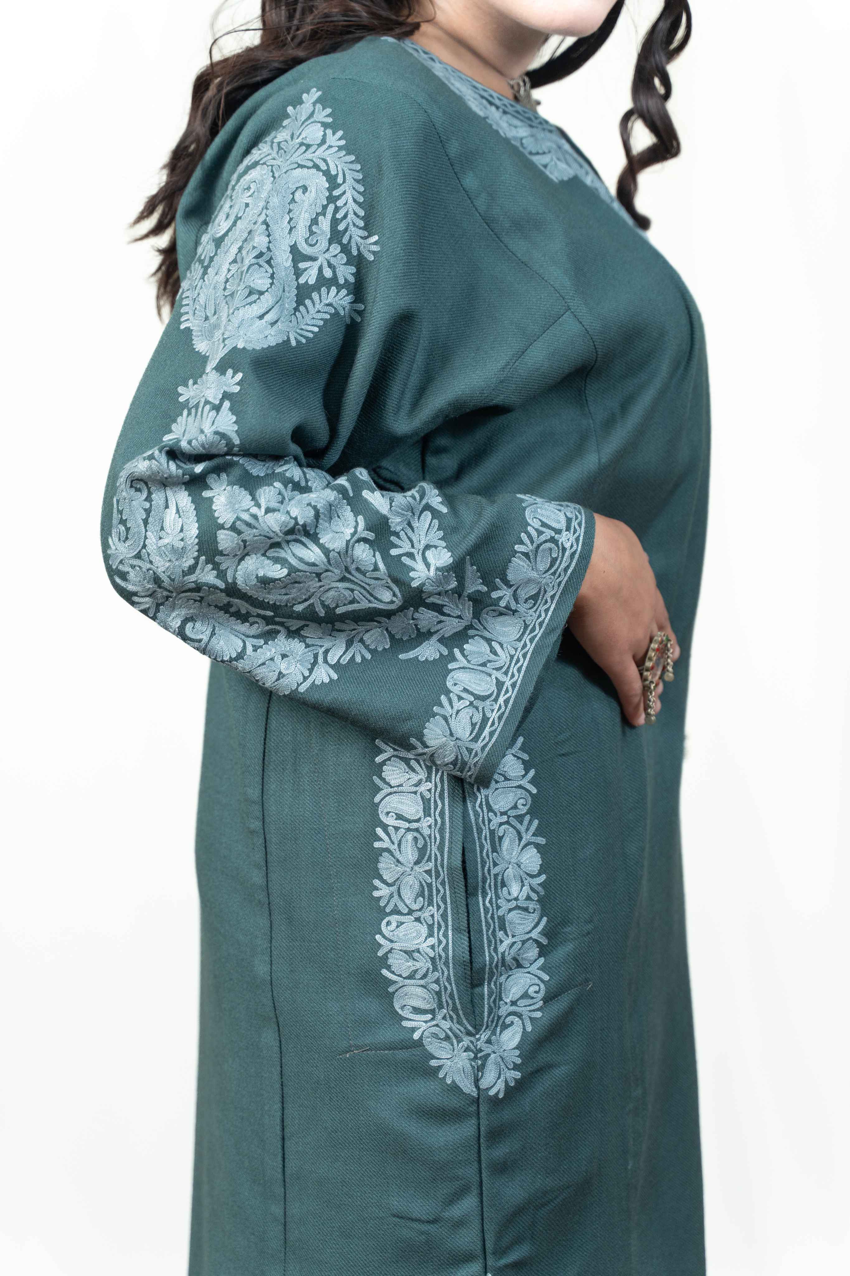 Discover the allure of authentic Kashmiri craftsmanship in this captivating Tropical Teal Pheran. Meticulously embellished with intricate aari work across the neckline, pocket borders, and back, this garment showcases the finest artisanal details. The thoughtfully designed paisley embroidery on the sleeves elevates its elegance, while practical pockets add everyday convenience. Crafted from a fabric that feels luxuriously warm yet refreshingly light, it adapts beautifully to any season. Whether you're seeking a statement piece for special occasions or a refined everyday essential, this pheran delivers timeless sophistication and uncompromising comfort that makes it a treasured addition to your wardrobe.