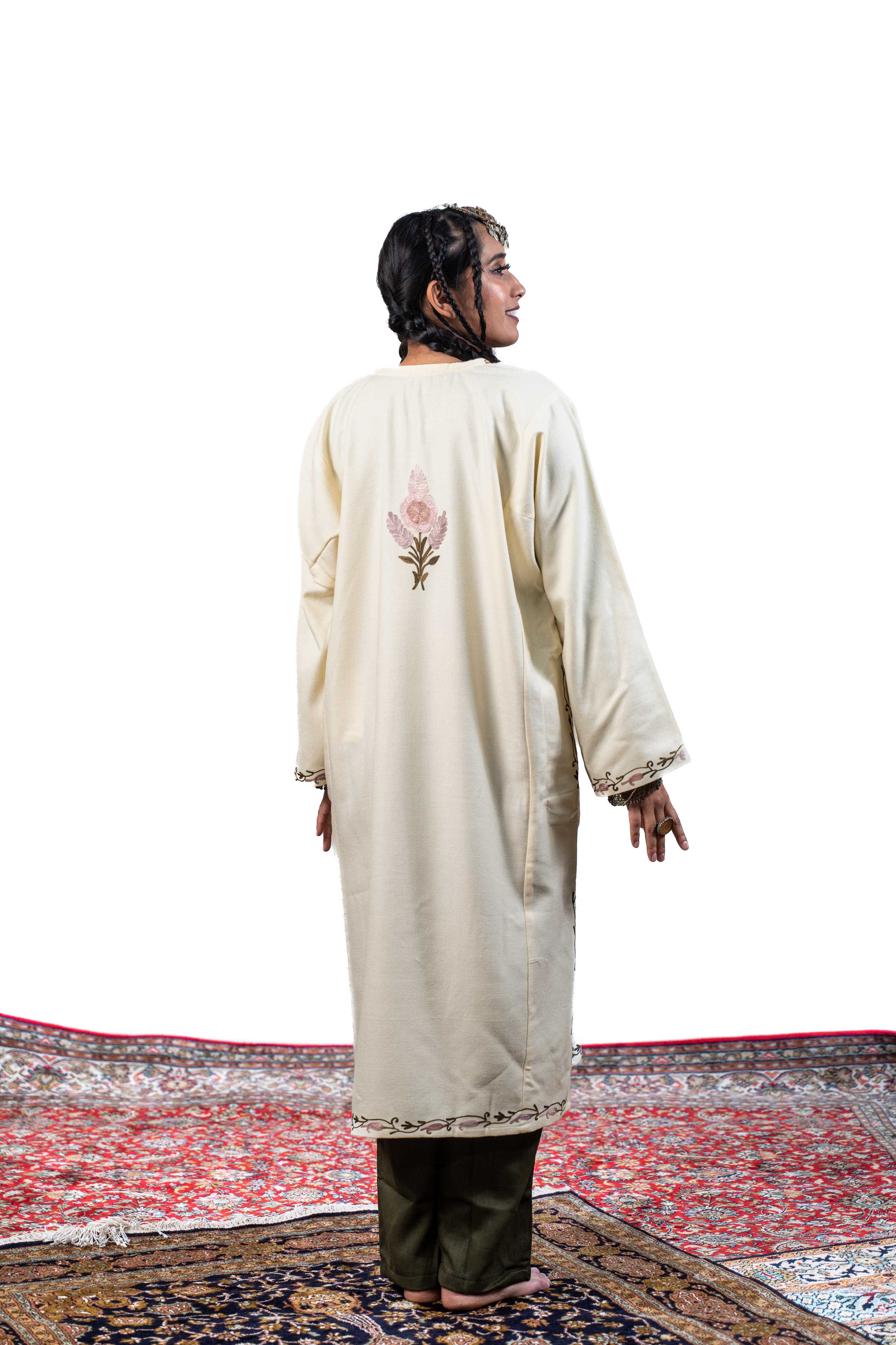 This Pearl White Aari Work Pheran is for those who dare to make an impact. Adorned with stunning aari embroidery across the neckline, back border, sleeves, and pockets, it's a fearless celebration of Kashmiri craftsmanship. Despite its lightweight construction, this pheran wraps you in unexpected warmth—perfect for the bold spirit who refuses to sacrifice comfort for style. Practical pockets ensure you're always ready for anything. A daring choice that commands attention while honoring centuries of artisanal tradition.