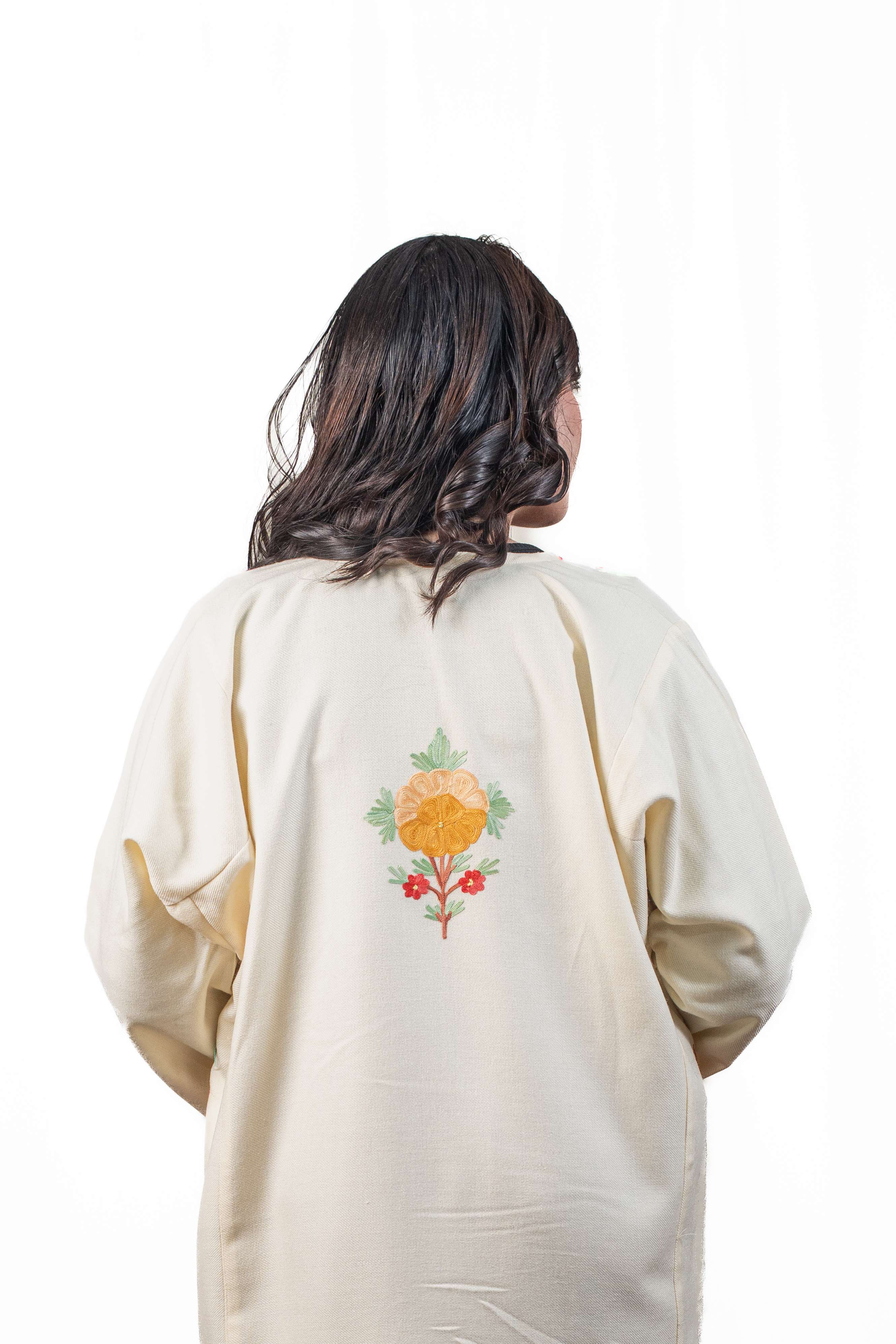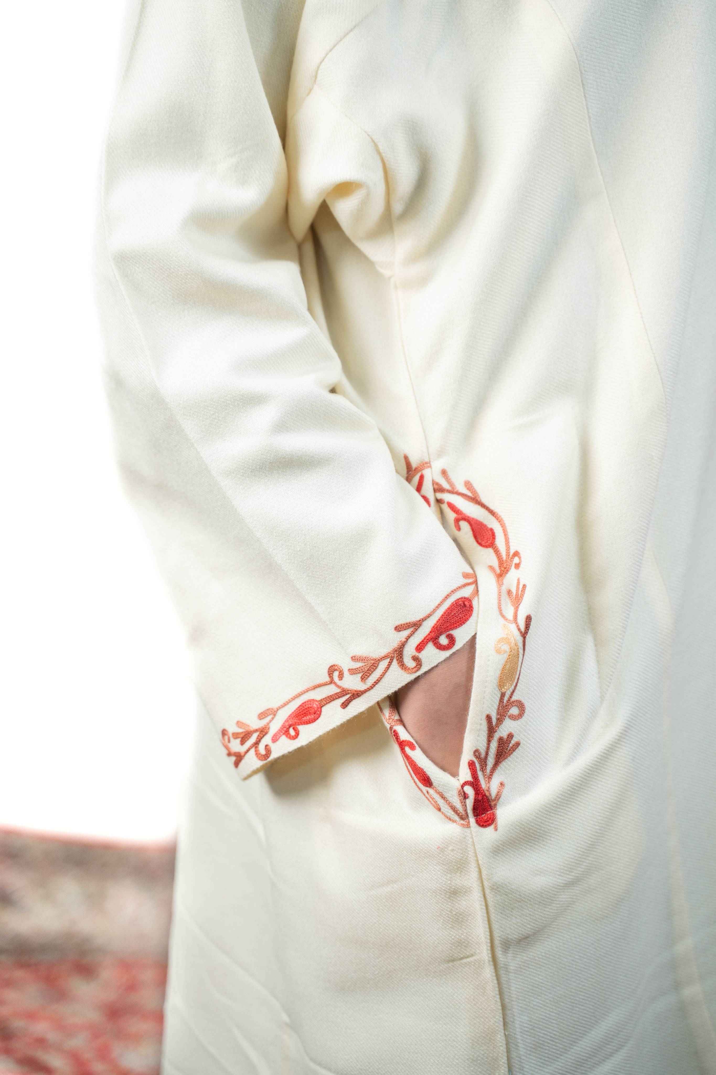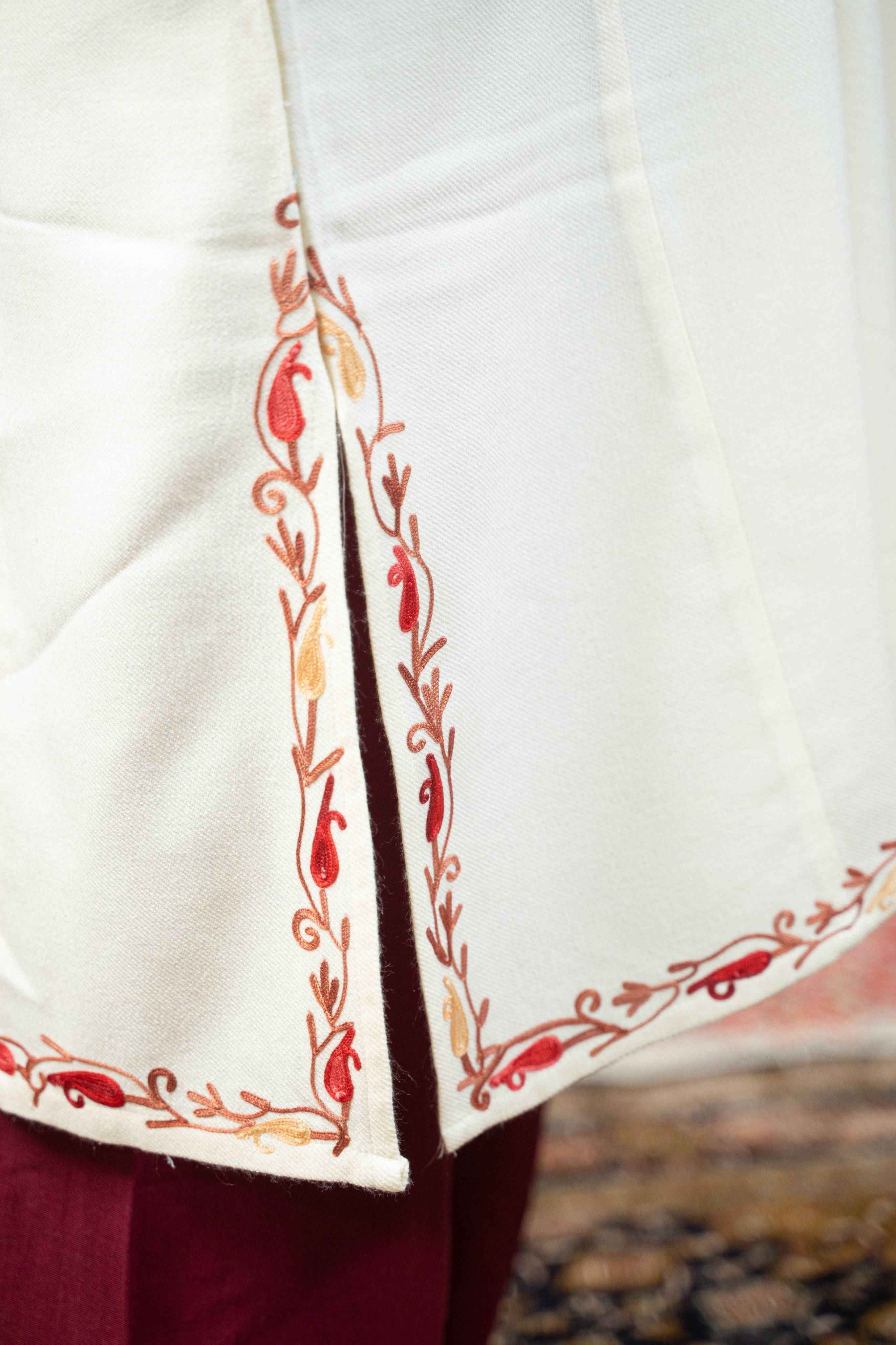 Discover the perfect blend of tradition and comfort with this stunning white pheran, adorned with intricate floral aari embroidery across the sleeves, neckline, border, and pockets. Crafted to be remarkably warm without the weight, this versatile piece keeps you cozy through cooler seasons while maintaining an elegant silhouette. Practical front pockets add everyday functionality to its timeless design. An essential addition to any wardrobe seeking authentic Kashmiri craftsmanship with contemporary wearability.