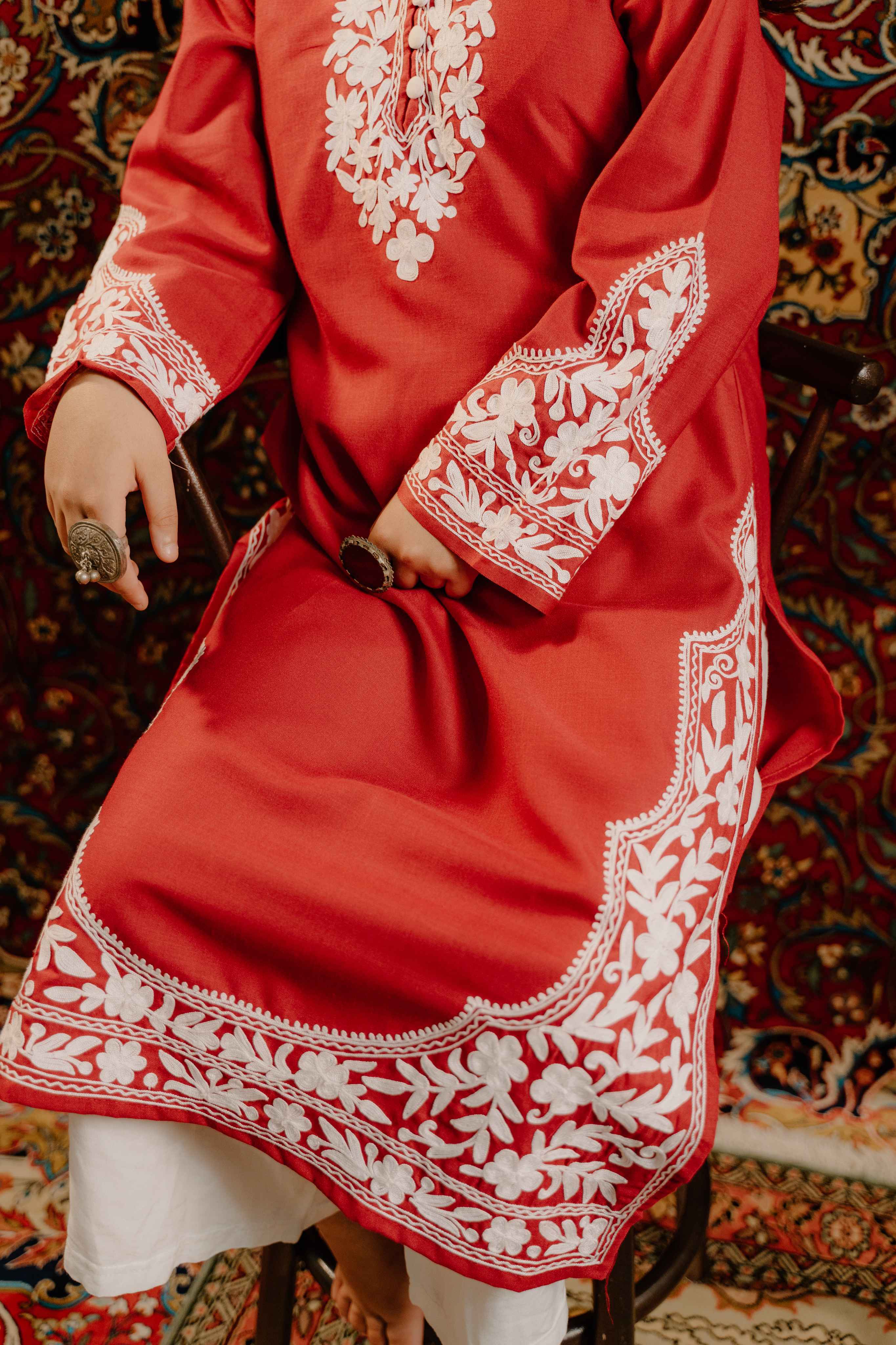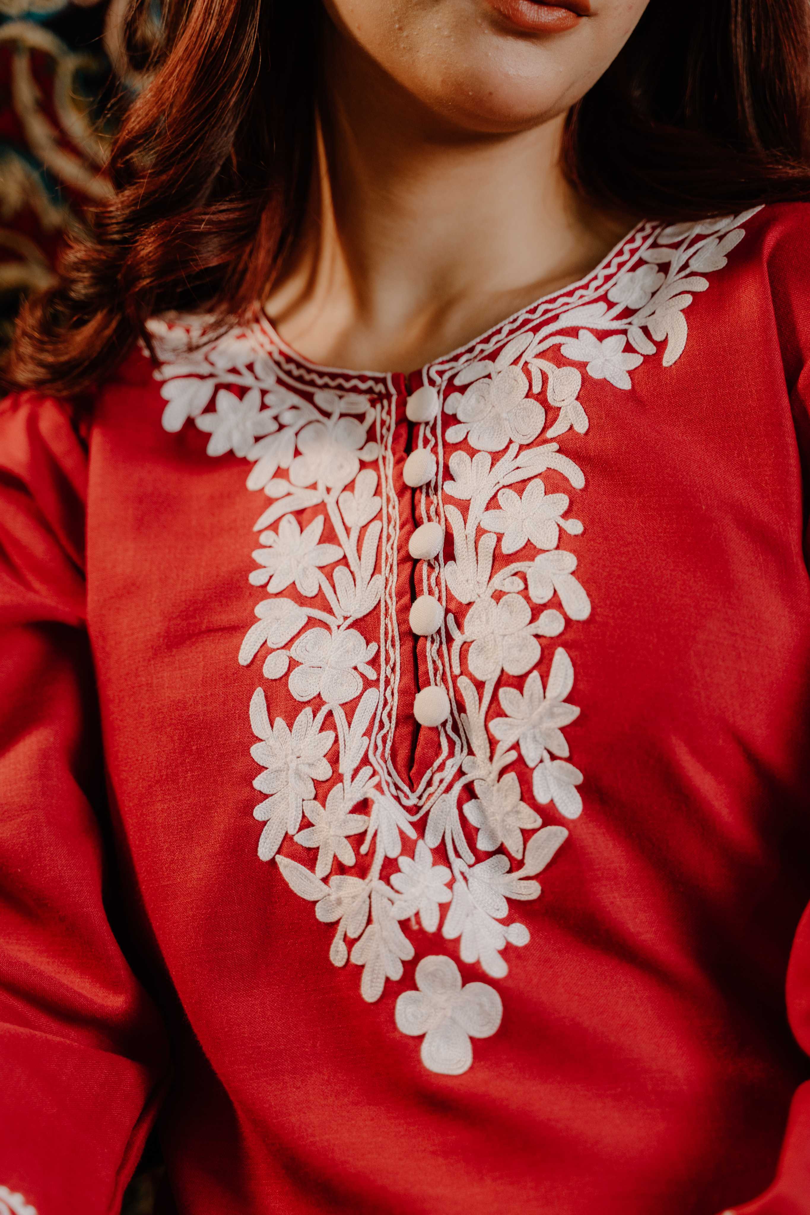 Kashmiri Aari Work Cotton Kurti - Red | Long