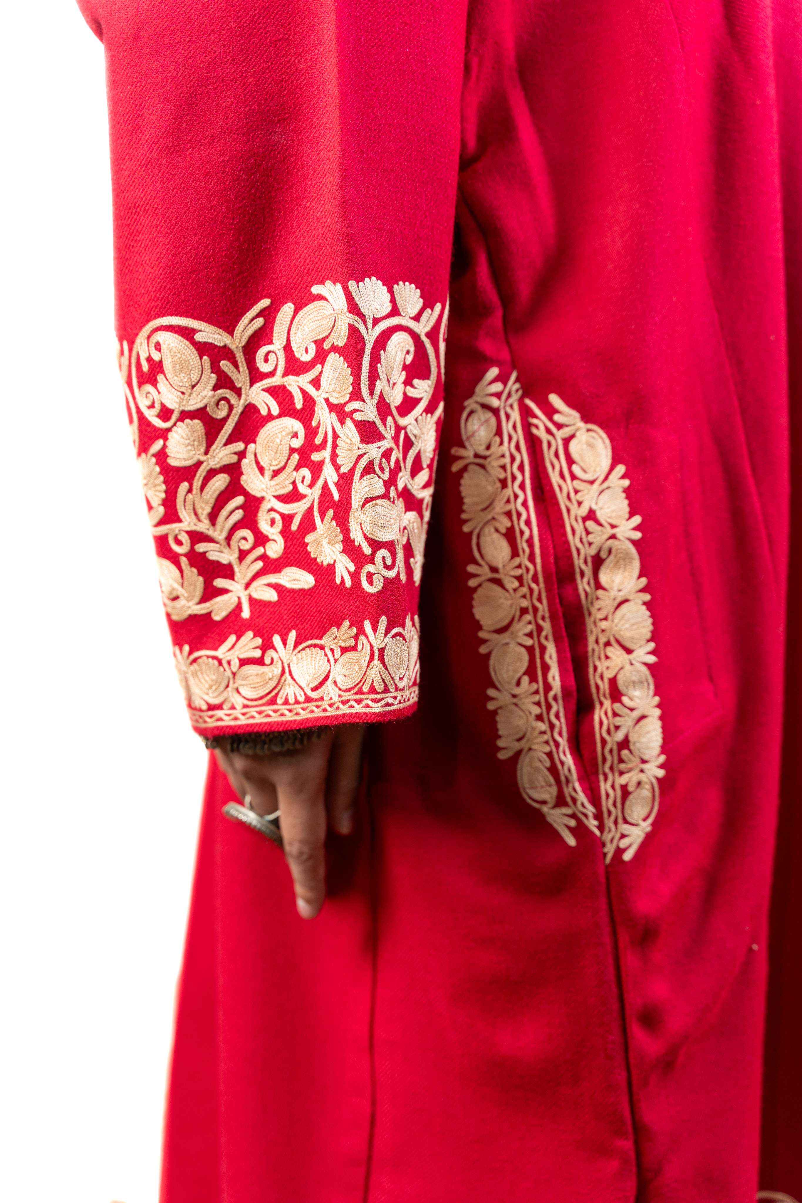 This stunning Brilliant Red Aari Work Pheran represents the pinnacle of Kashmiri textile artistry. Meticulously embroidered with traditional aari work across the neckline, sleeves, borders, back, and pockets, each piece showcases the refined technique passed down through generations of master craftspeople. The luminous red fabric provides an elegant backdrop for the intricate threadwork, while the lightweight construction offers comfort and versatility for layering across seasons. A distinguished addition to any wardrobe that honors authentic craftsmanship and cultural heritage.