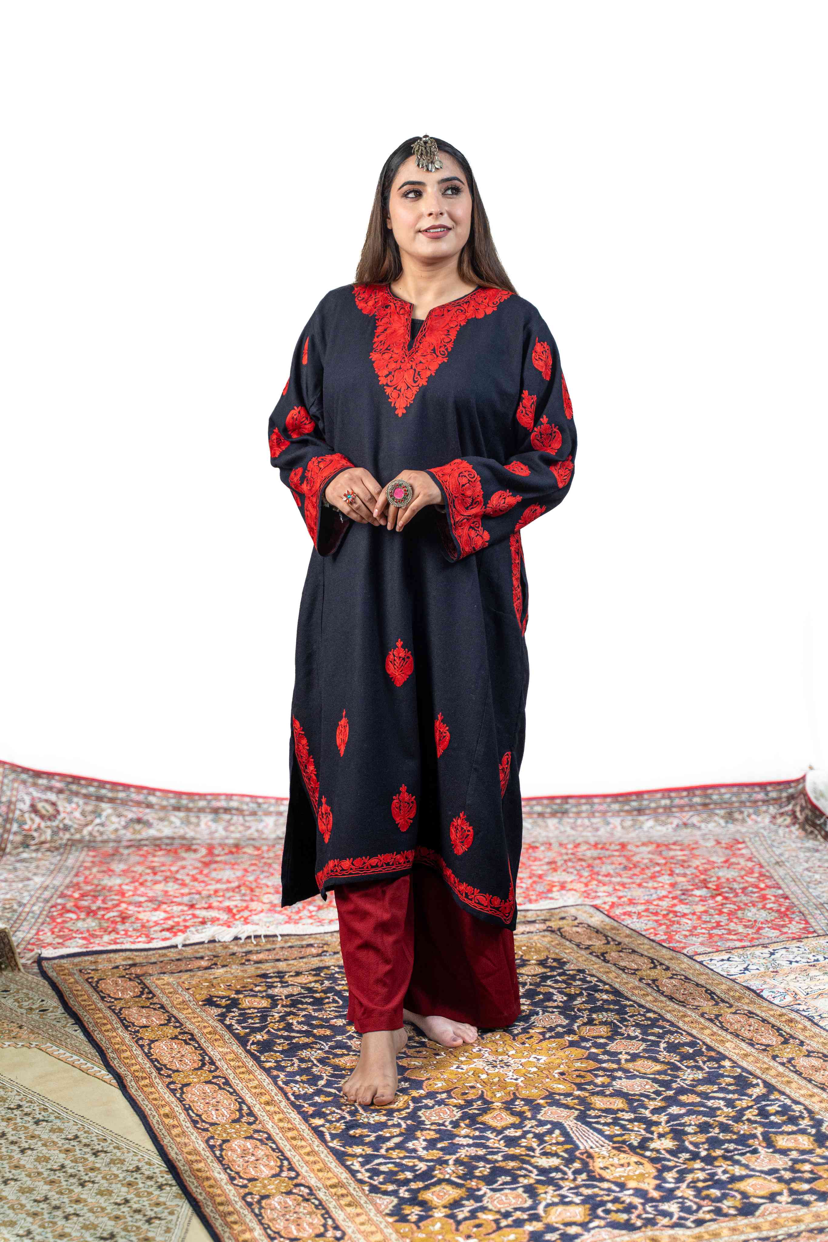 Experience the perfect fusion of tradition and comfort with this exquisite black pheran. Vibrant red aari embroidery graces the neckline, pockets, and back panel, while intricate buti patterns dance across the sleeves—each stitch a testament to Kashmiri artistry. Lightweight yet wonderfully warm, this versatile piece moves with you throughout the day. Functional pockets ensure practicality meets beauty, making it an essential addition to any wardrobe seeking authentic craftsmanship and timeless appeal.