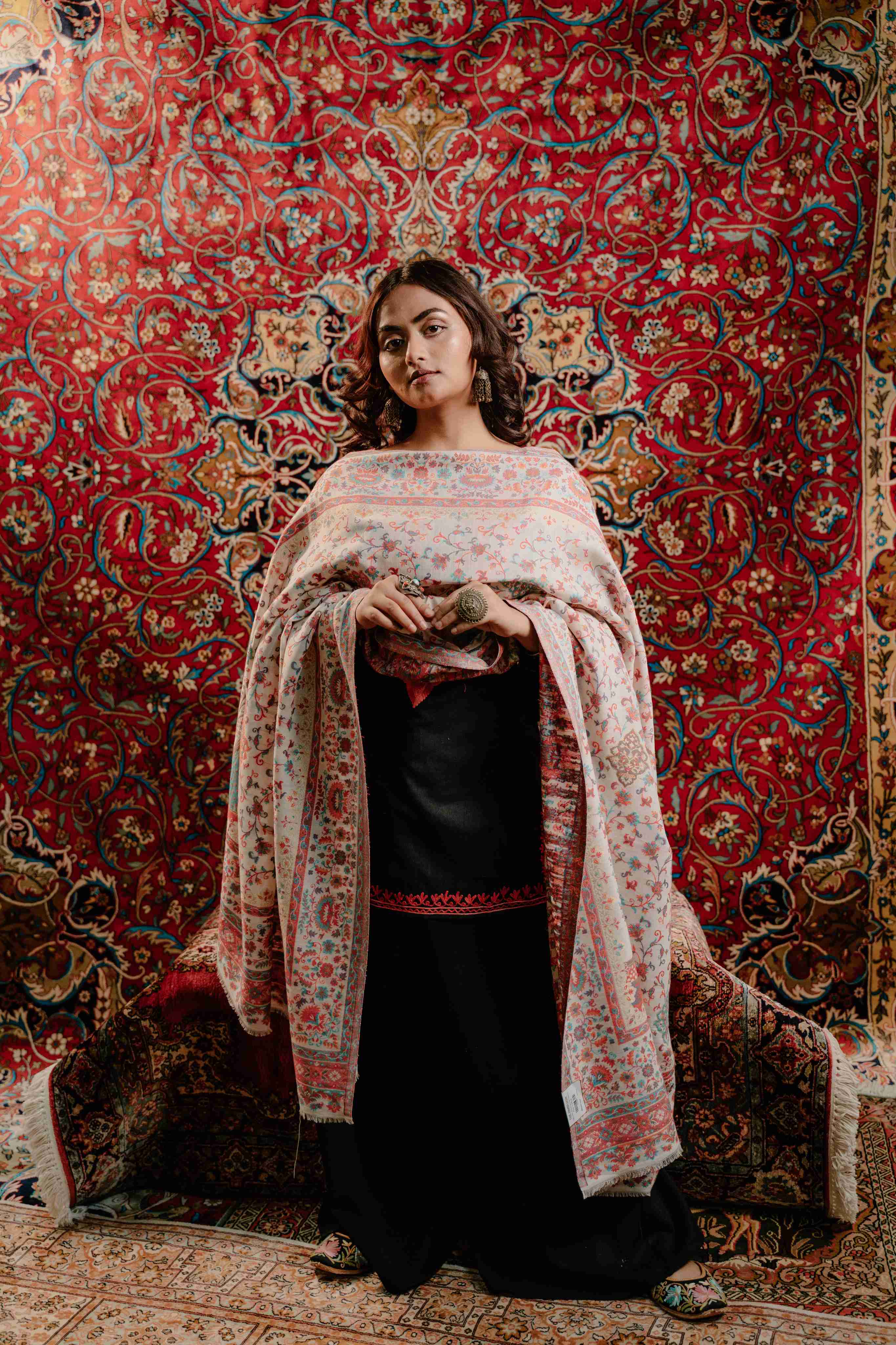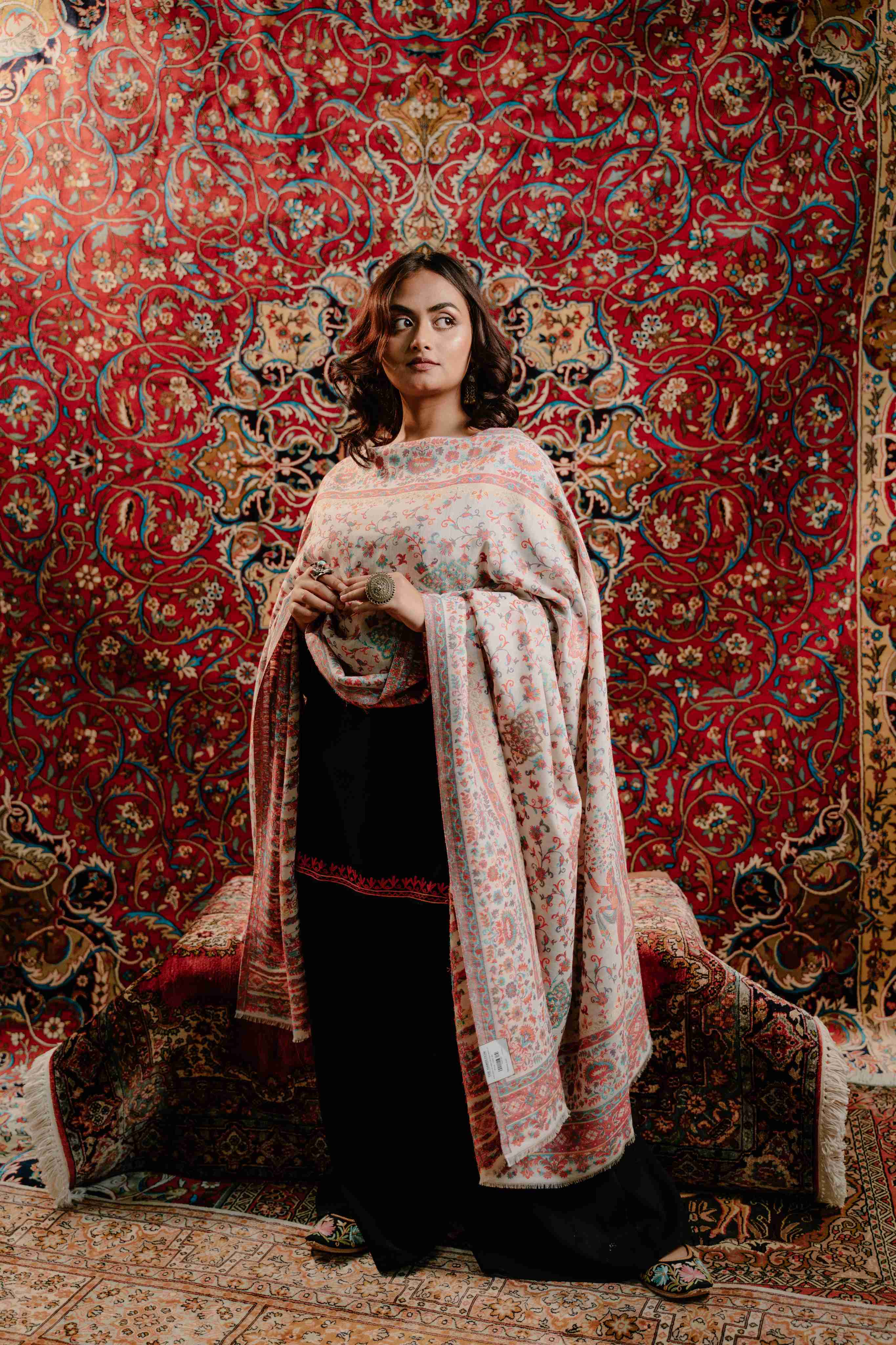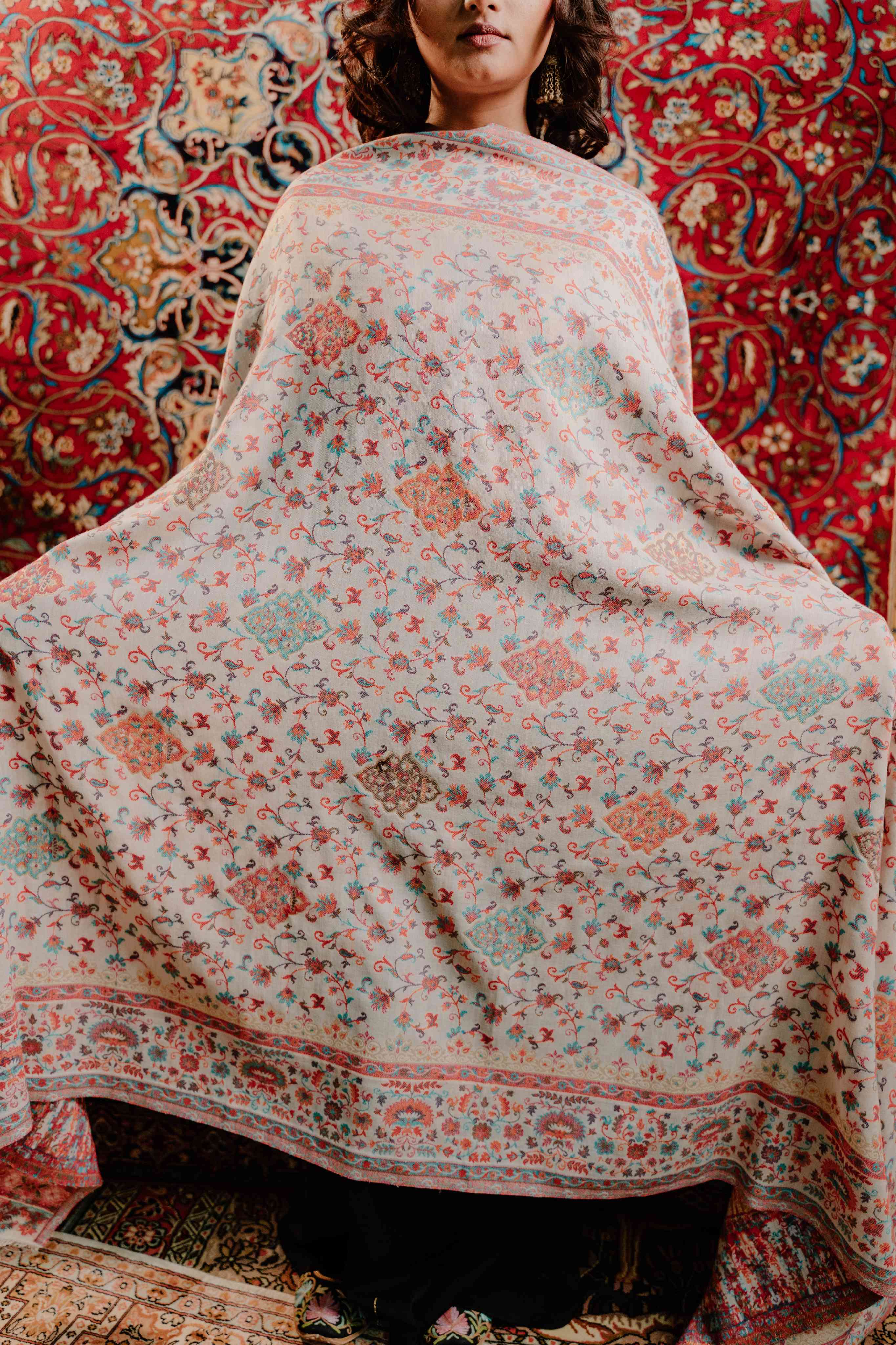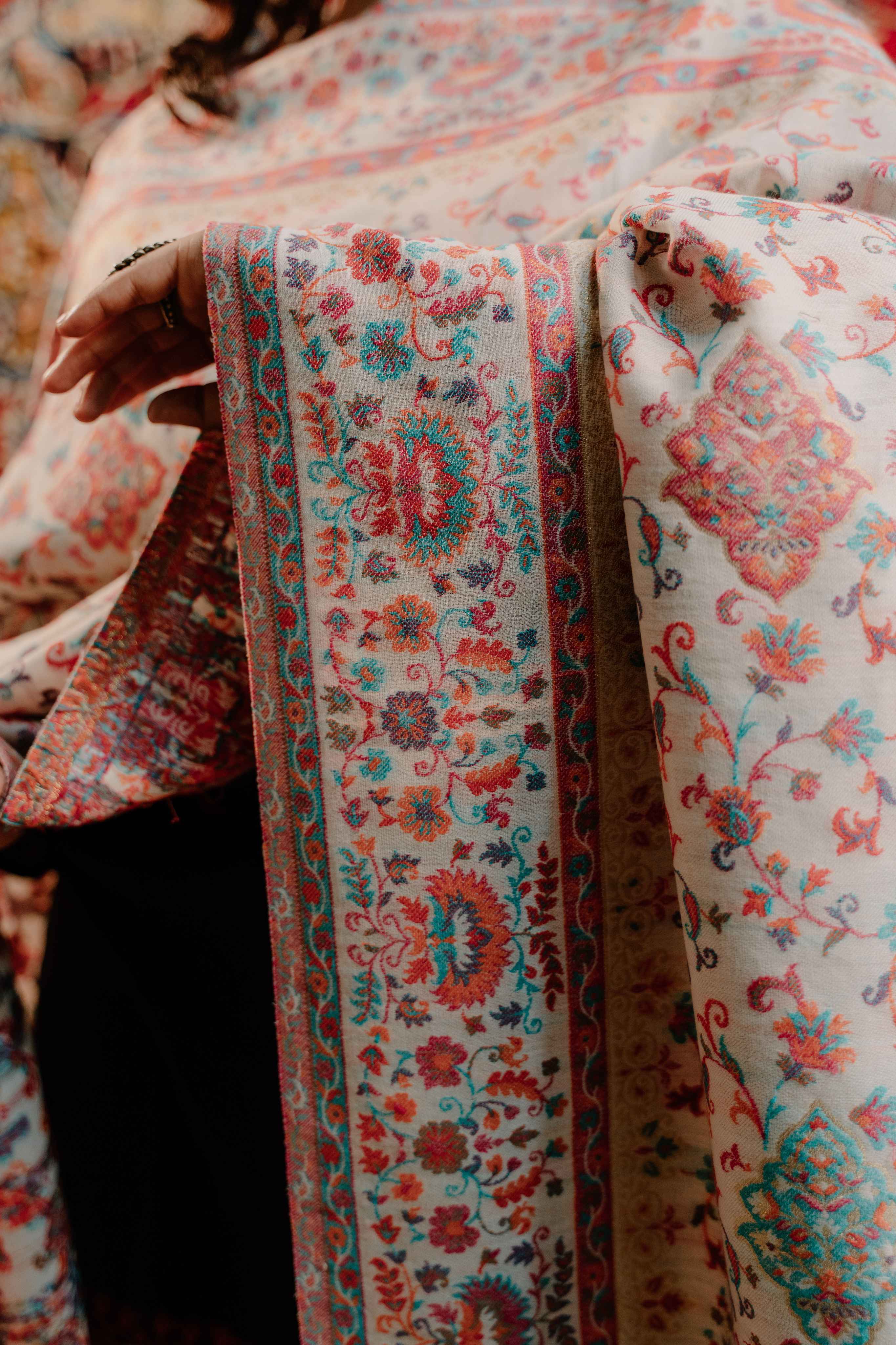 Indulge in luxury with our KANI JAMAWAR BUTI SHAWL WHITE. The intricate KANI weaving work showcases skilled craftsmanship and adds a touch of elegance to any outfit. Wrap yourself in its softness and let the compliments pour in!