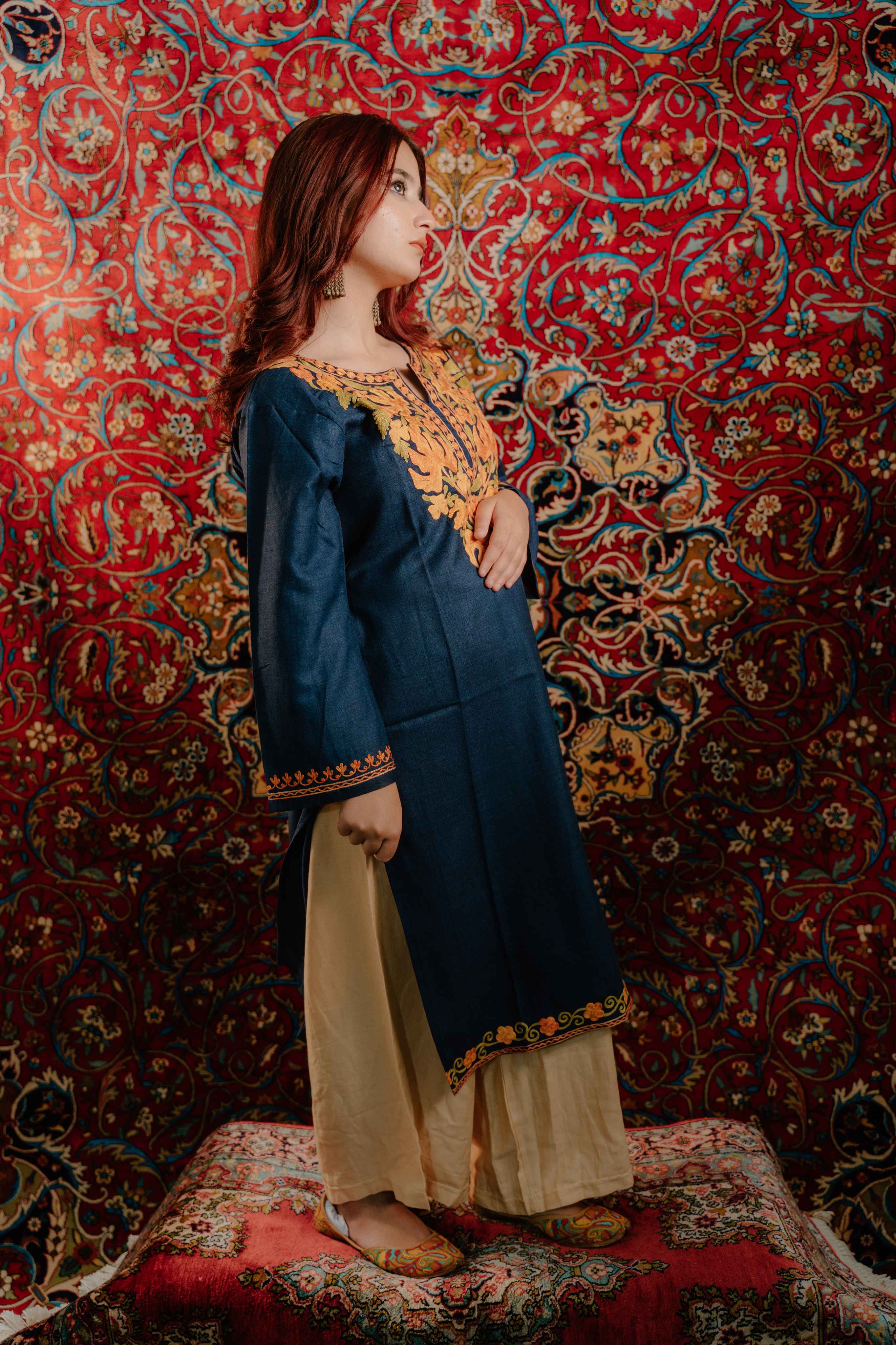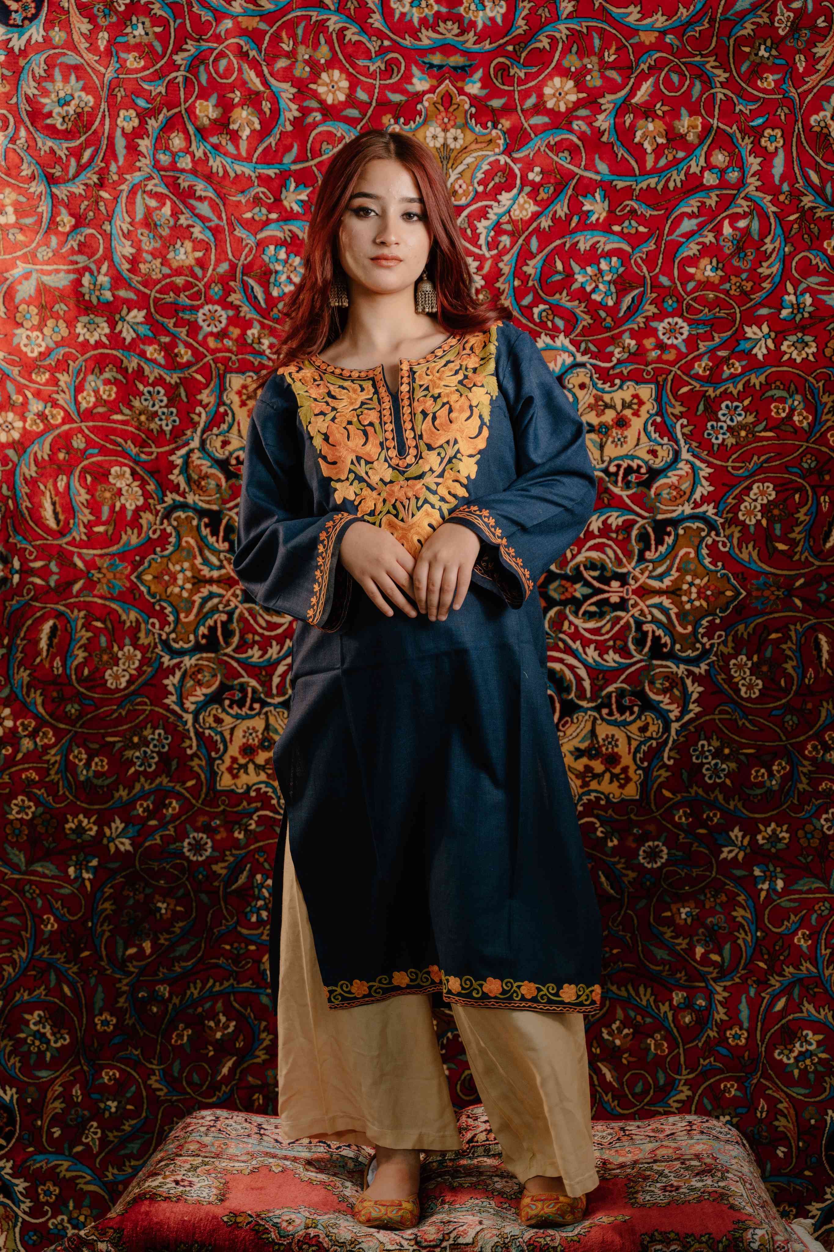 Elevate your ethnic wardrobe with this refined royal blue cotton kurti, a testament to Kashmir's celebrated embroidery heritage. Meticulously adorned with intricate aari work gracing the neckline, sleeves, and hem, this piece exemplifies the precision and artistry of master Kashmiri craftspeople. Constructed from premium breathable cotton, it delivers sophisticated comfort without compromise, allowing you to move through your day with grace and poise. An investment in timeless elegance for the discerning wearer who values authentic craftsmanship and superior quality.